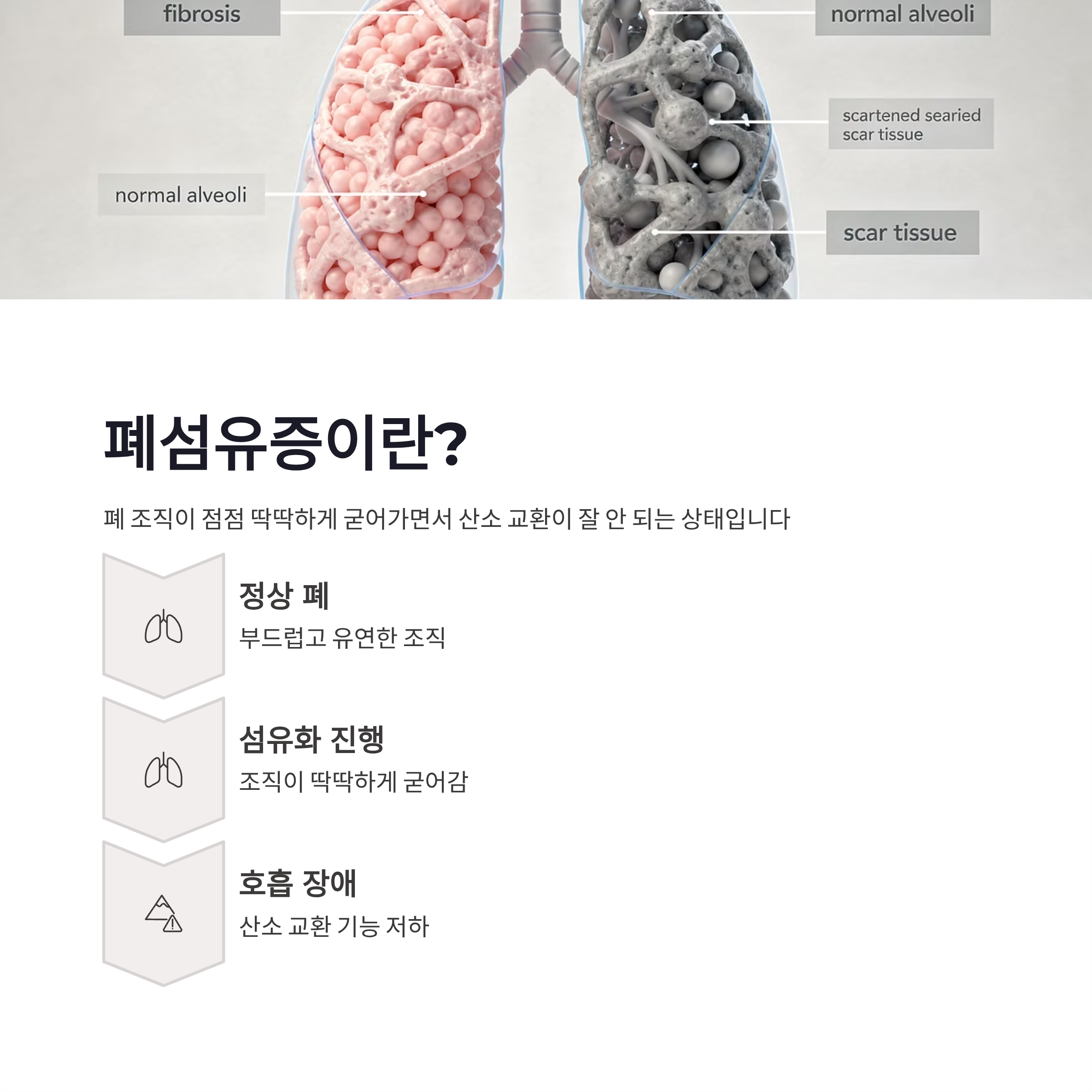 폐섬유증은 폐 조직이 점점 딱딱하게 굳어가면서 산소 교환이 잘 안 되는 상태를 말해요. 문제는 이게 한 번 굳어진 폐는 다시 돌아오지 않는다는 점이더라구요. 제가 찾아본 내용 정리해보면 이렇슴다.
