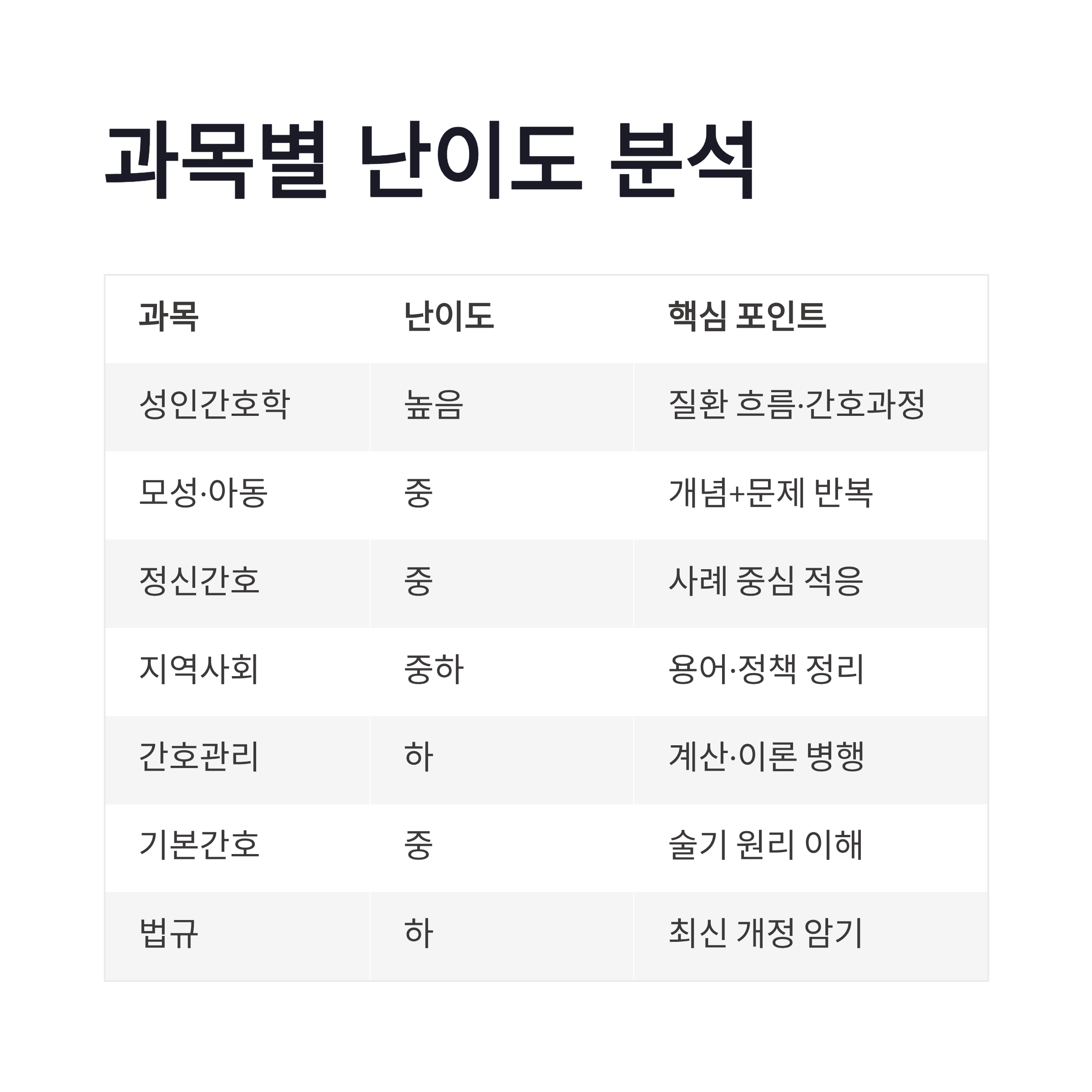 간호사 국가고시 준비하면서 느낀 건, 과목별로 체감 난이도가 꽤 다르다는 점이었어요. 특히 성인간호학은 분량이 많아서 초반부터 잡아두는 게 좋더라구요.