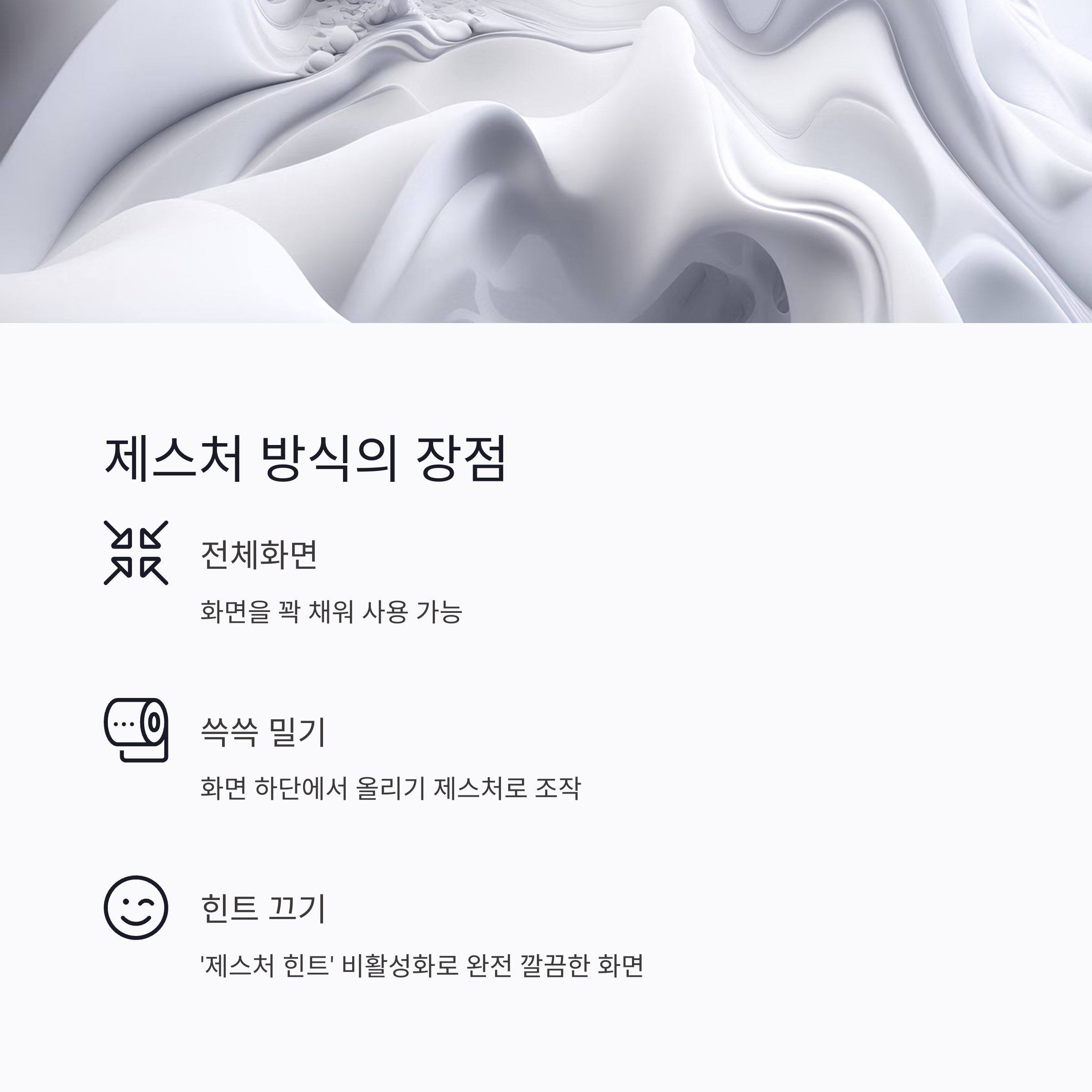 하단바 자체를 없애고 화면 아래에서 쓱쓱 밀어서 조작하는 제스처 방식이에요. 전체화면을 꽉 채우고 싶은 분들께 최고입니다!