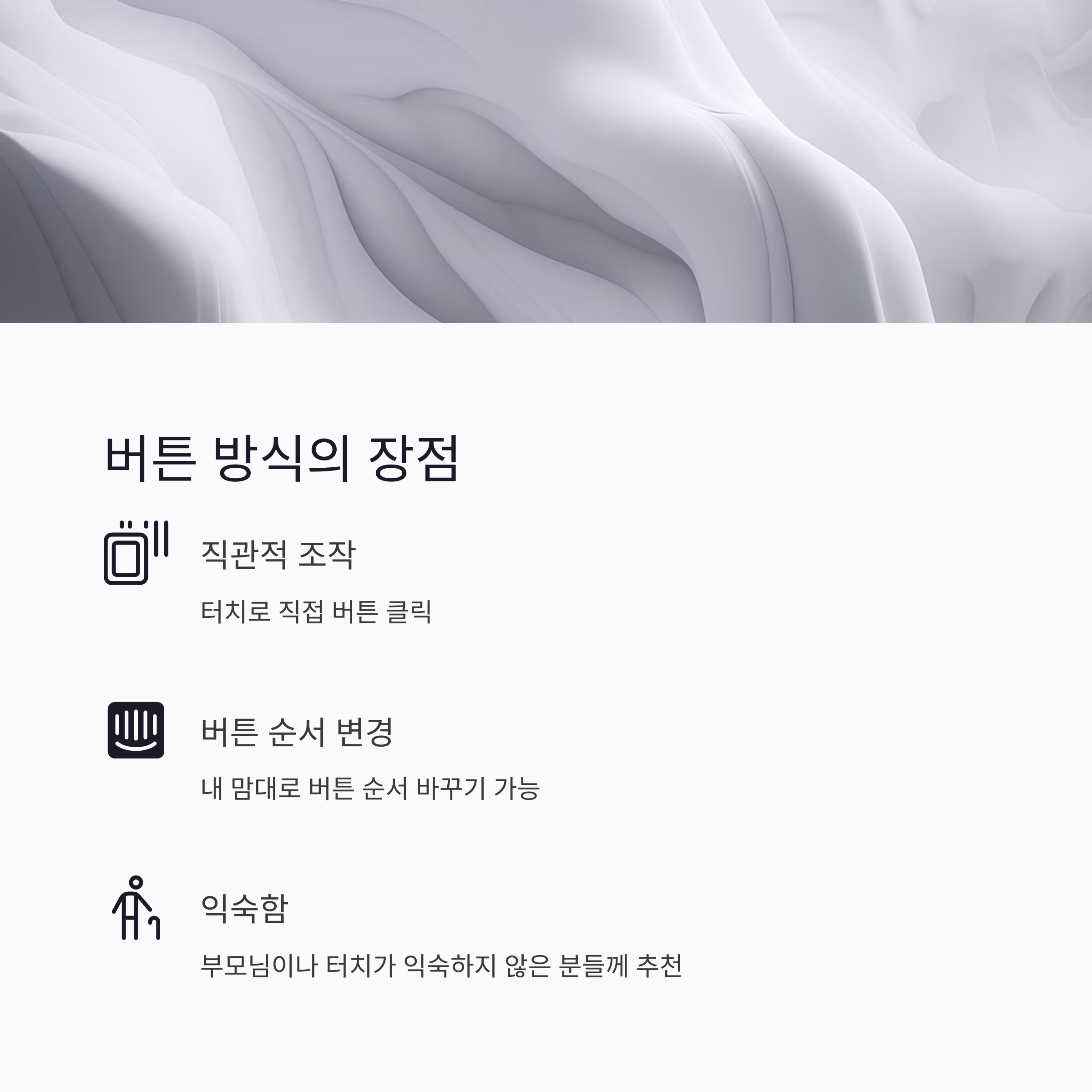 | 항목 | 제스처 방식 | 버튼 방식 (고정) |