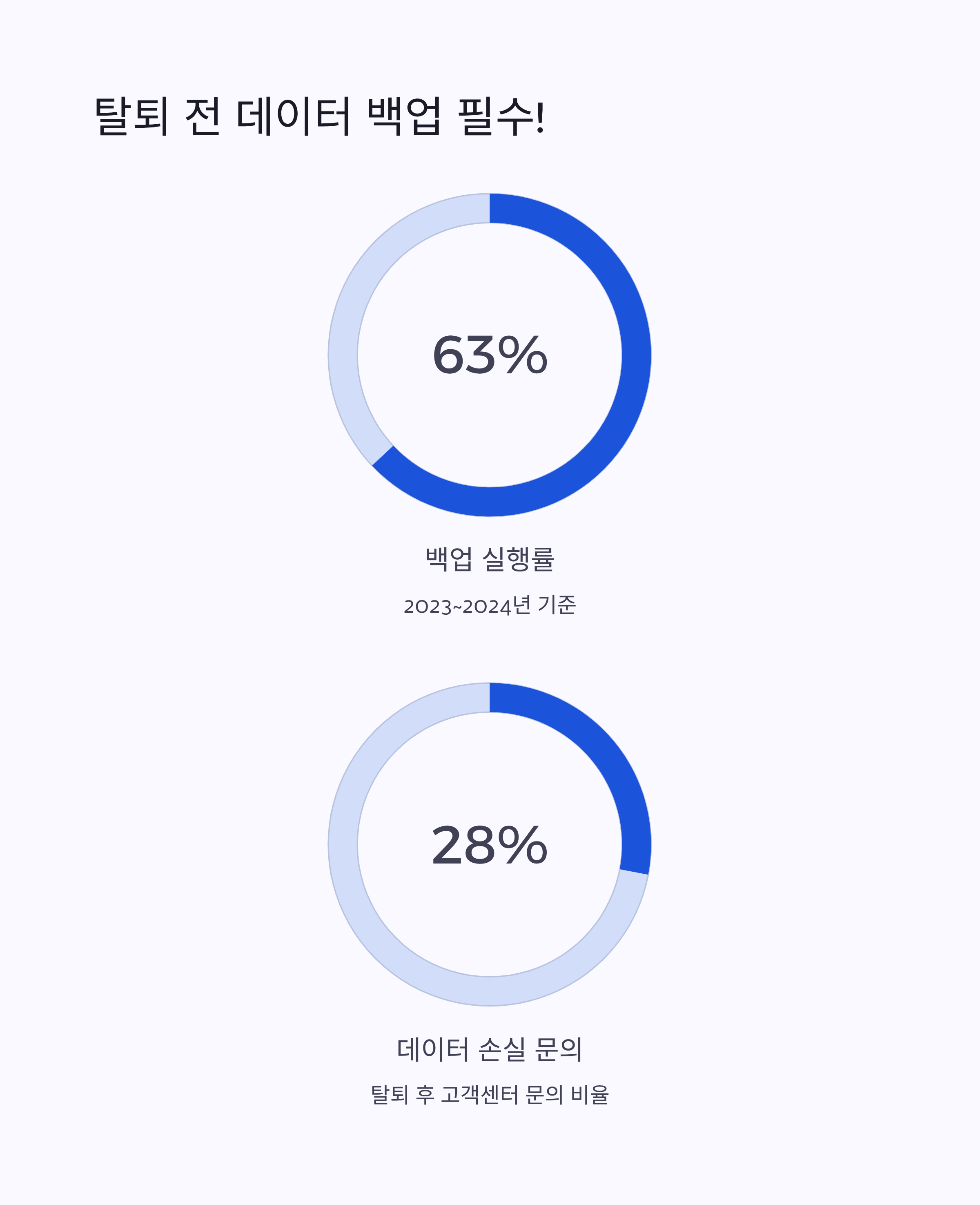 데이터 백업은 필수입니다. 삼성 클라우드 또는 구글 드라이브를 활용해 사진, 연락처, 메모 등의 중요한 데이터를 사전에 백업해야 합니다[4]. 데이터 백업 실행률은 2023~2024년 기준으로 63%에 머물며, 탈퇴 후 데이터 손실로 고객센터에 문의하는 경우가 28%에 달합니다[2].