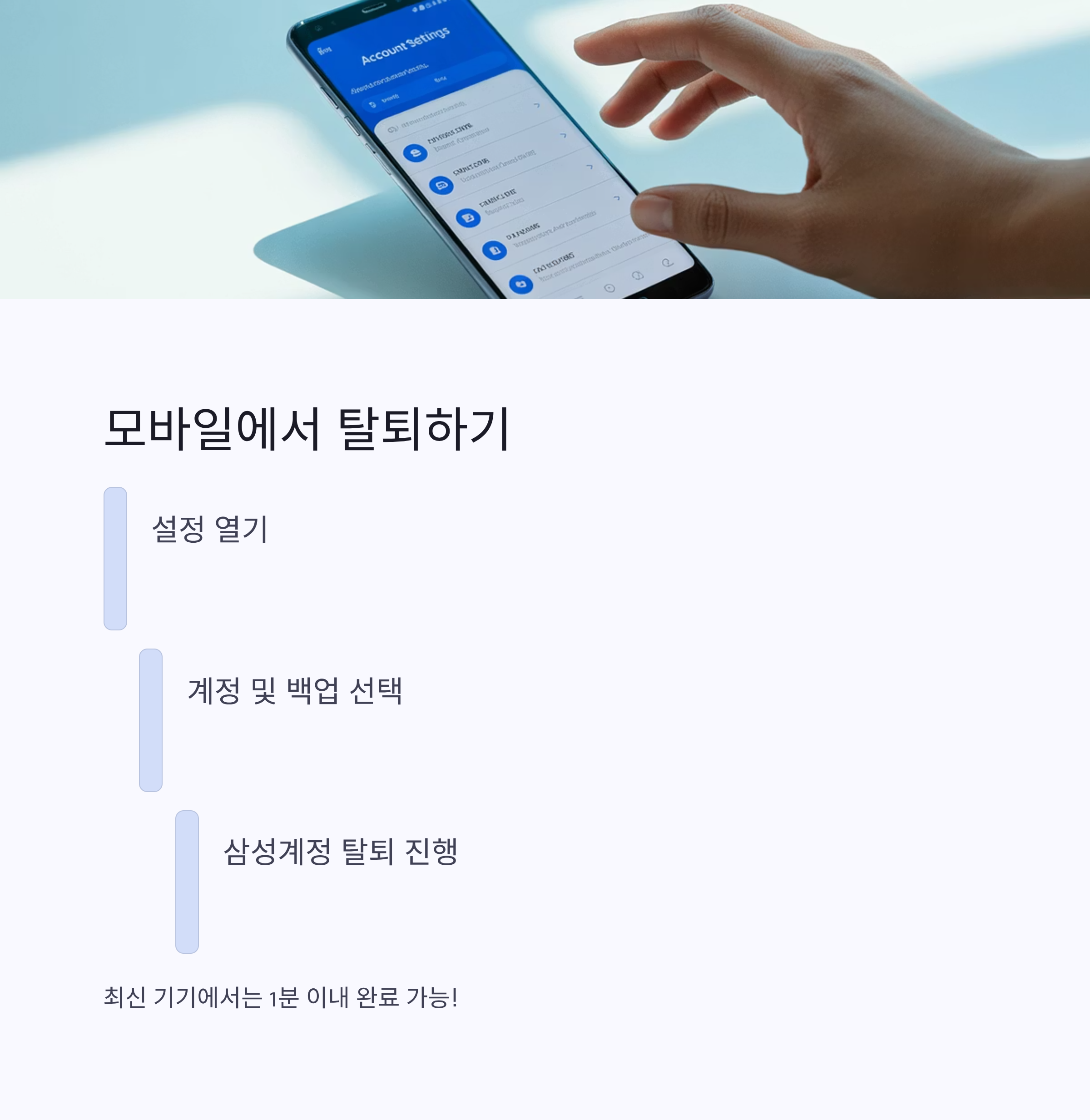 모바일과 PC에서 각각 간단한 단계로 탈퇴가 가능합니다. 모바일에서는 설정에서 '계정 및 백업'을 통해 진행하며 PC에서는 삼성계정 공식 홈페이지에서 탈퇴 절차를 거칠 수 있습니다[1][2]. 새로 출시된 기기에서는 평균적으로 1분 이내에 모든 절차를 완료할 수 있도록 절차가 최적화되었습니다.