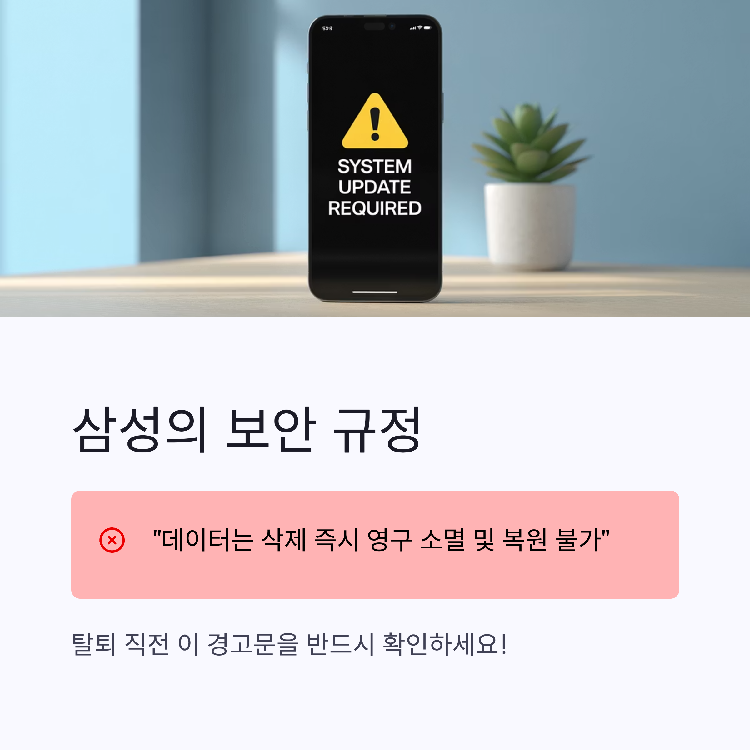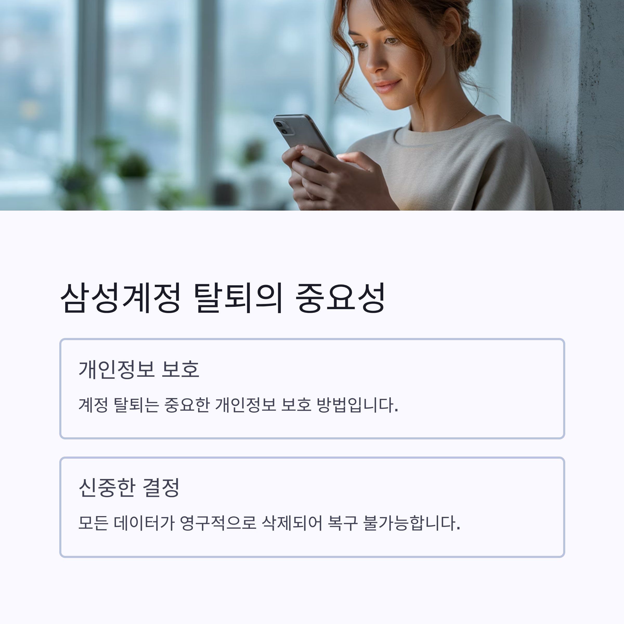 삼성은 보안 강화를 위해 탈퇴 직전 '데이터는 삭제 즉시 영구 소멸 및 복원 불가'라는 문구를 명시하고 있습니다[2]. 이로 인해 사용자들은 데이터 소멸의 최종 결정을 신중히 해야 합니다. 계정 탈퇴 후에는 어떤 방식으로도 데이터 복원이 불가능합니다.