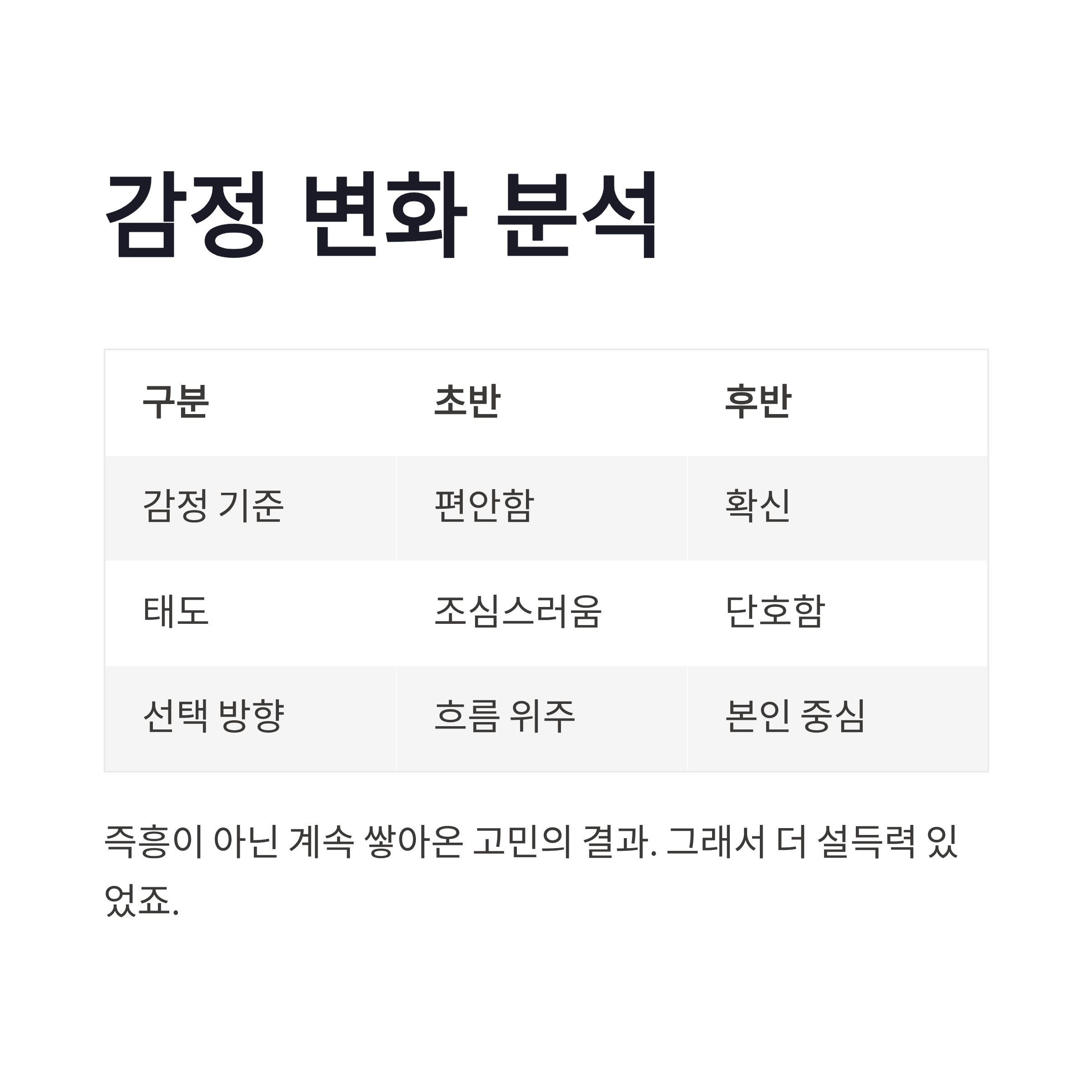 | 감정 기준 | 편안함 | 확신 |