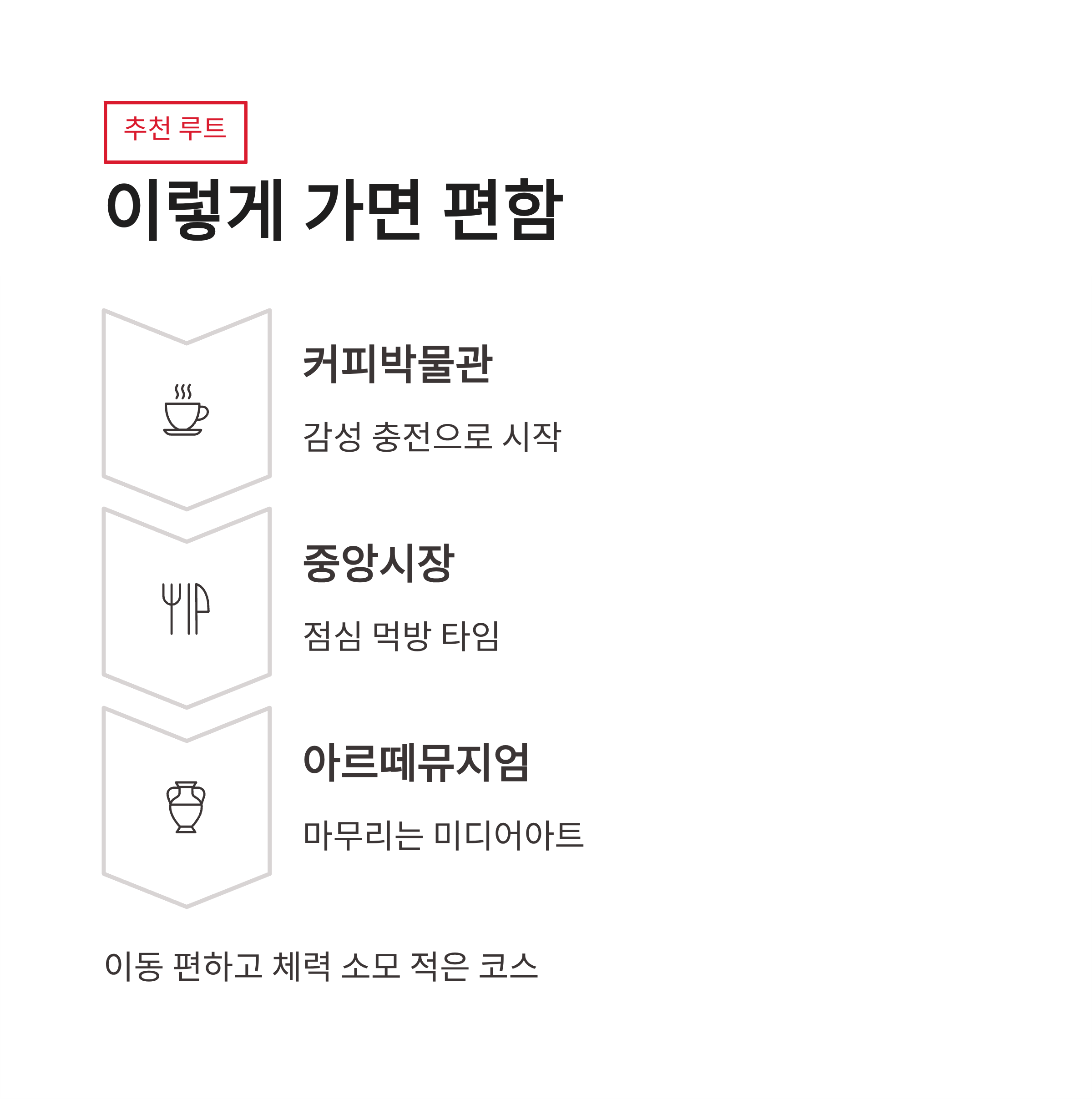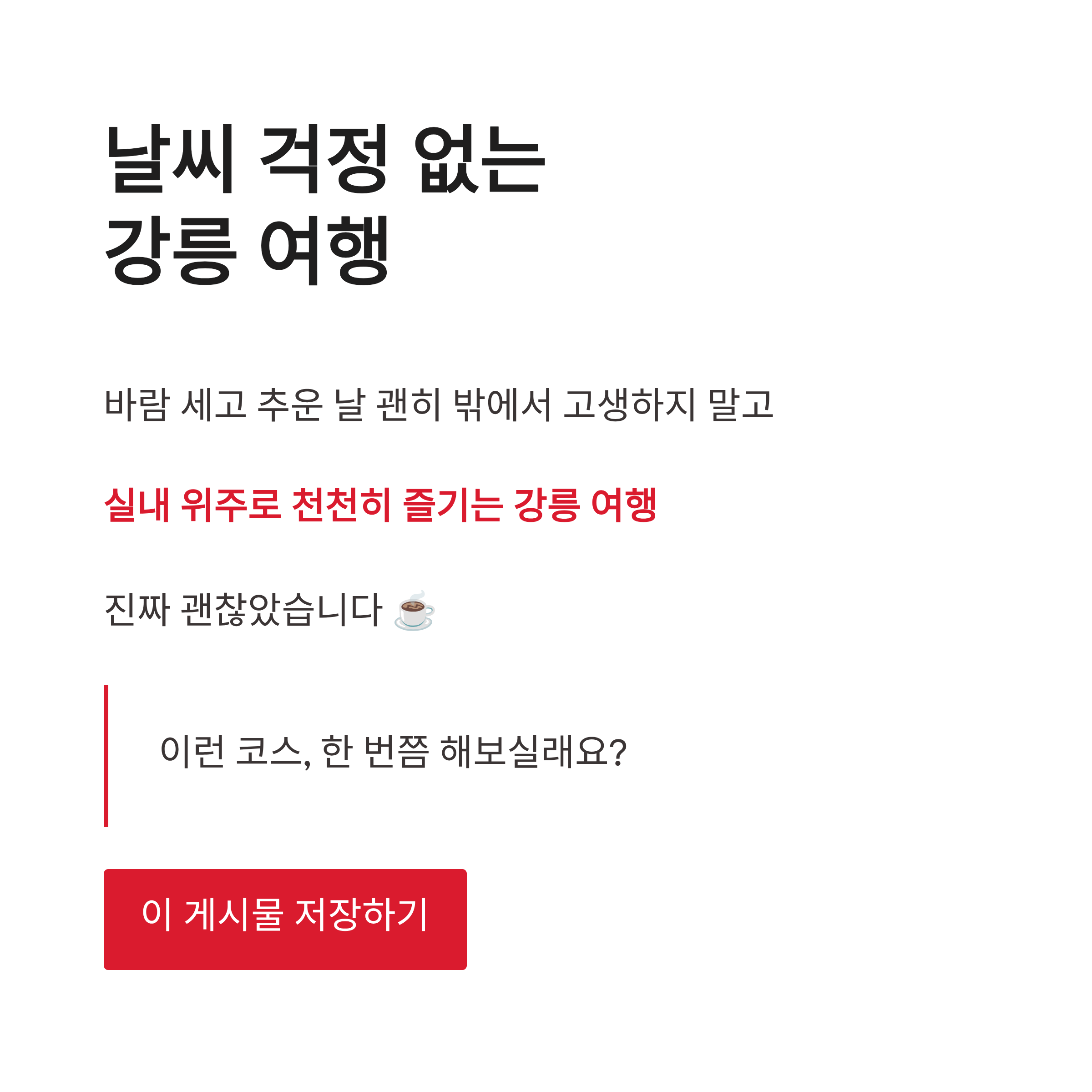 결론적으로 날씨 걱정 없는 강릉 여행은 실내 코스만 잘 묶어도 충분히 만족스럽더라구요. 커피박물관 → 중앙시장 → 아르떼뮤지엄 루트로 가면 이동도 편했고 체력도 덜 소모됐어요. 바람 세고 추운 날 괜히 밖에서 고생하지 말고, 실내 위주로 천천히 즐기는 강릉 여행도 진짜 괜찮았습니다. 이런 코스, 한 번쯤 해보실래요?