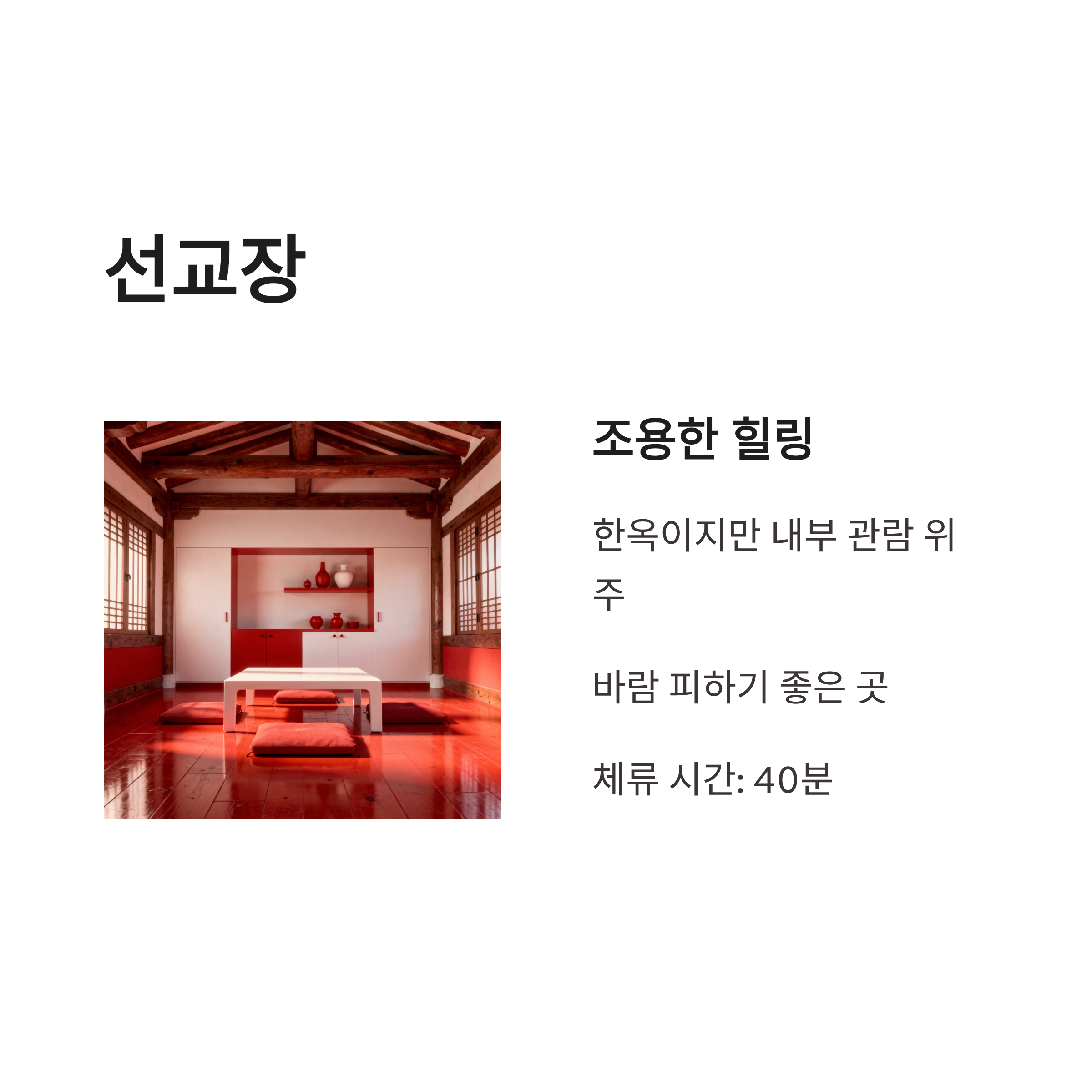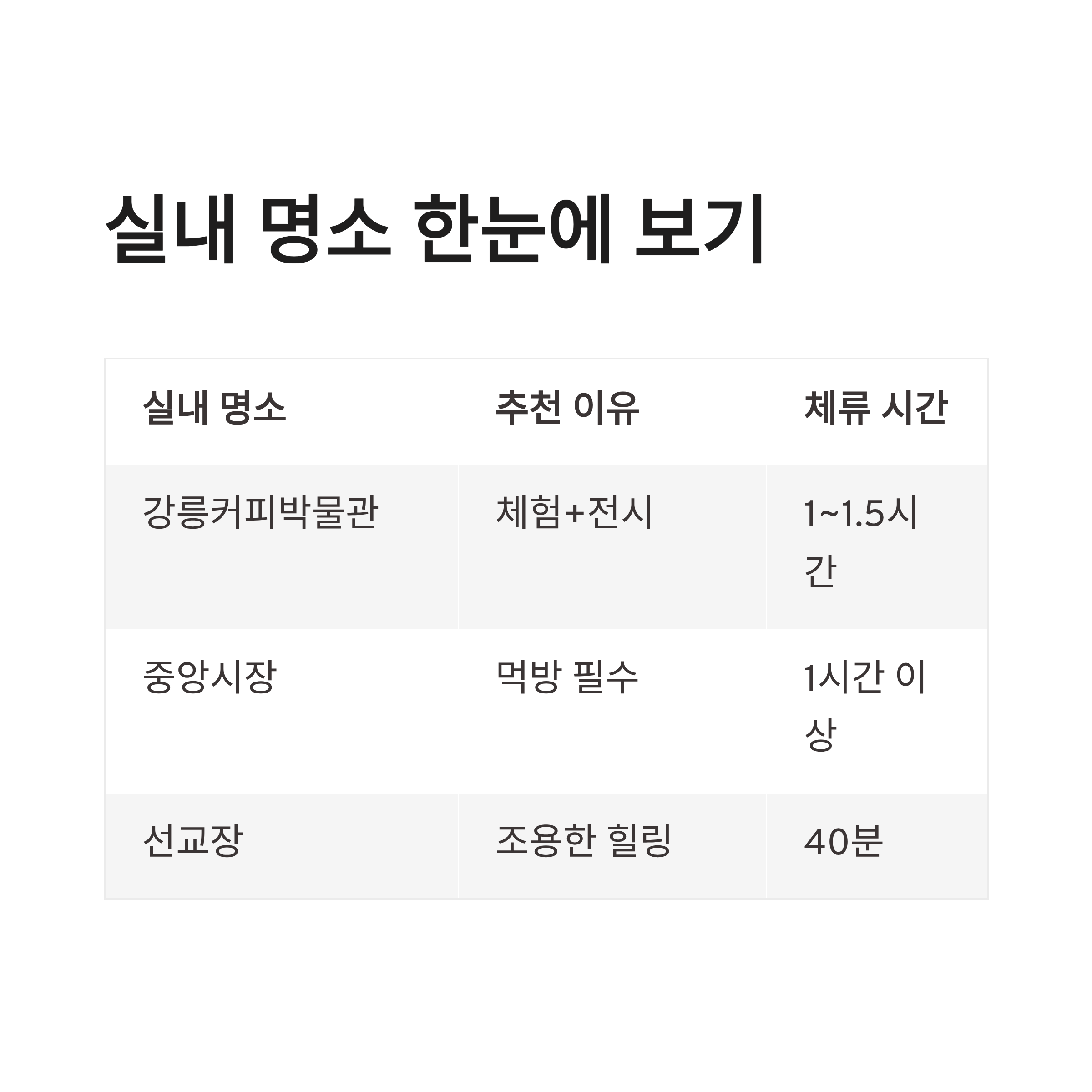 | 실내 명소 | 추천 이유 | 체류 시간 |