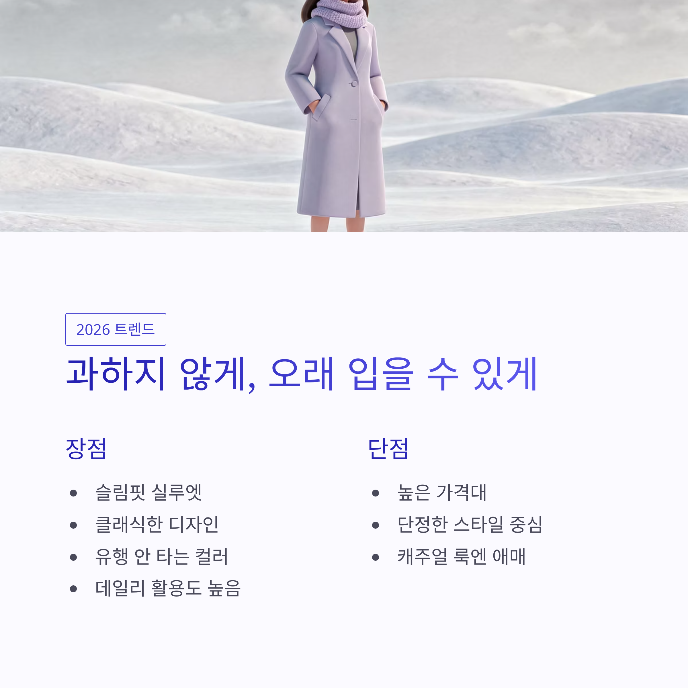 장점은 명확해요. 슬림핏, 클래식한 디자인, 유행 안 타는 컬러 구성. 단점이라면… 가격대가 쉽게 결정할 수준은 아니라는 점? 그리고 캐주얼보다는 단정한 스타일에 더 잘 어울려요. 막 편하게 입는 패딩 찾는 분들에겐 살짝 애매할 수도 있겠쥬.