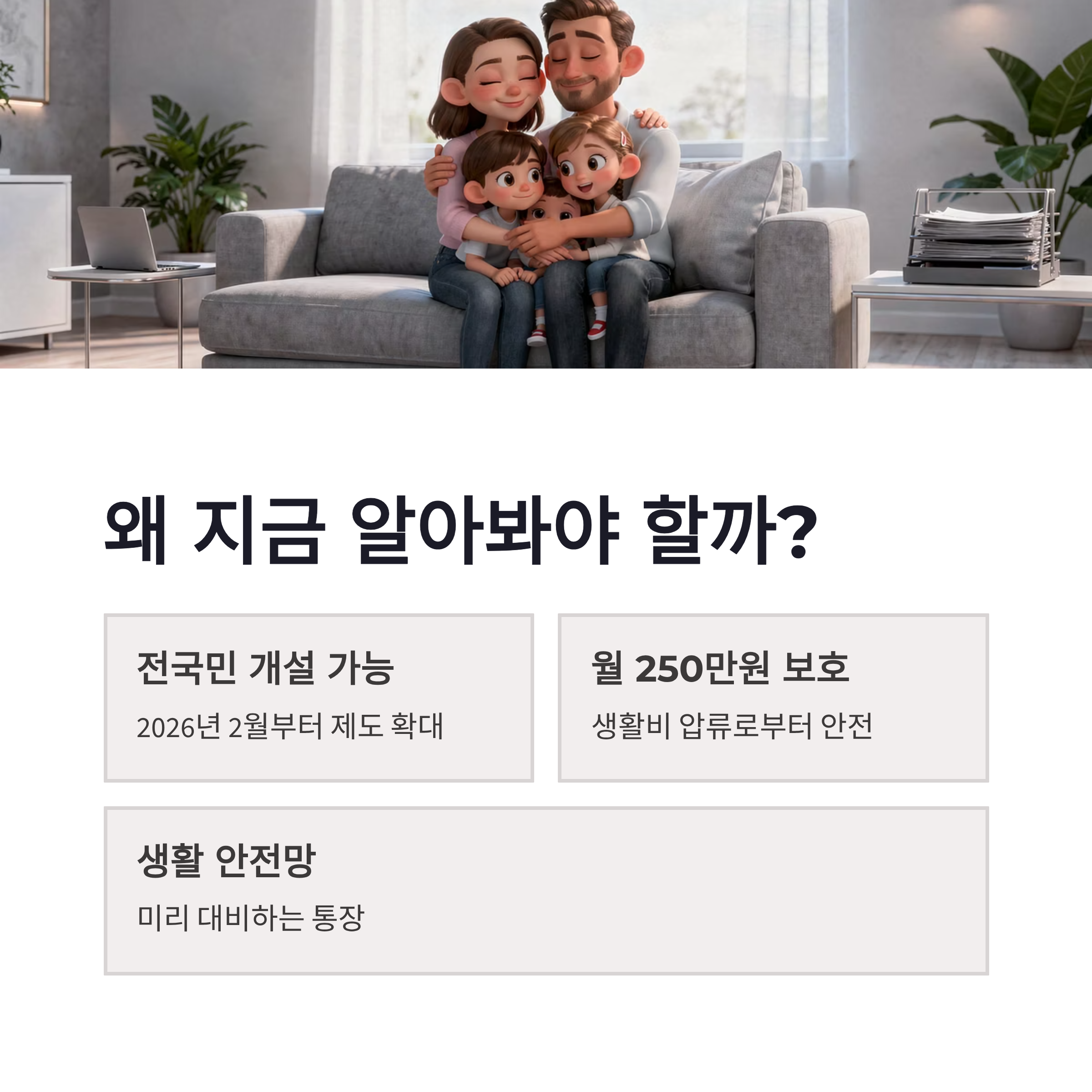 2026년 2월부터 제도가 바뀌면서, 예전처럼 특정 수급자만 가능한 게 아니라 전 국민 신청 가능으로 확대된 게 핵심 포인트입니다. 이 계좌의 가장 큰 장점은 딱 하나예요. 월 최대 250만원까지 생활비를 압류로부터 보호받을 수 있다는 점. 급여, 프리랜서 수입, 개인사업자 소득까지 들어올 수 있어서 활용 범위도 꽤 넓어졌습니다. 이건 그냥 통장이 아니라, 말 그대로 생활 안전망 같은 느낌이더라구요.