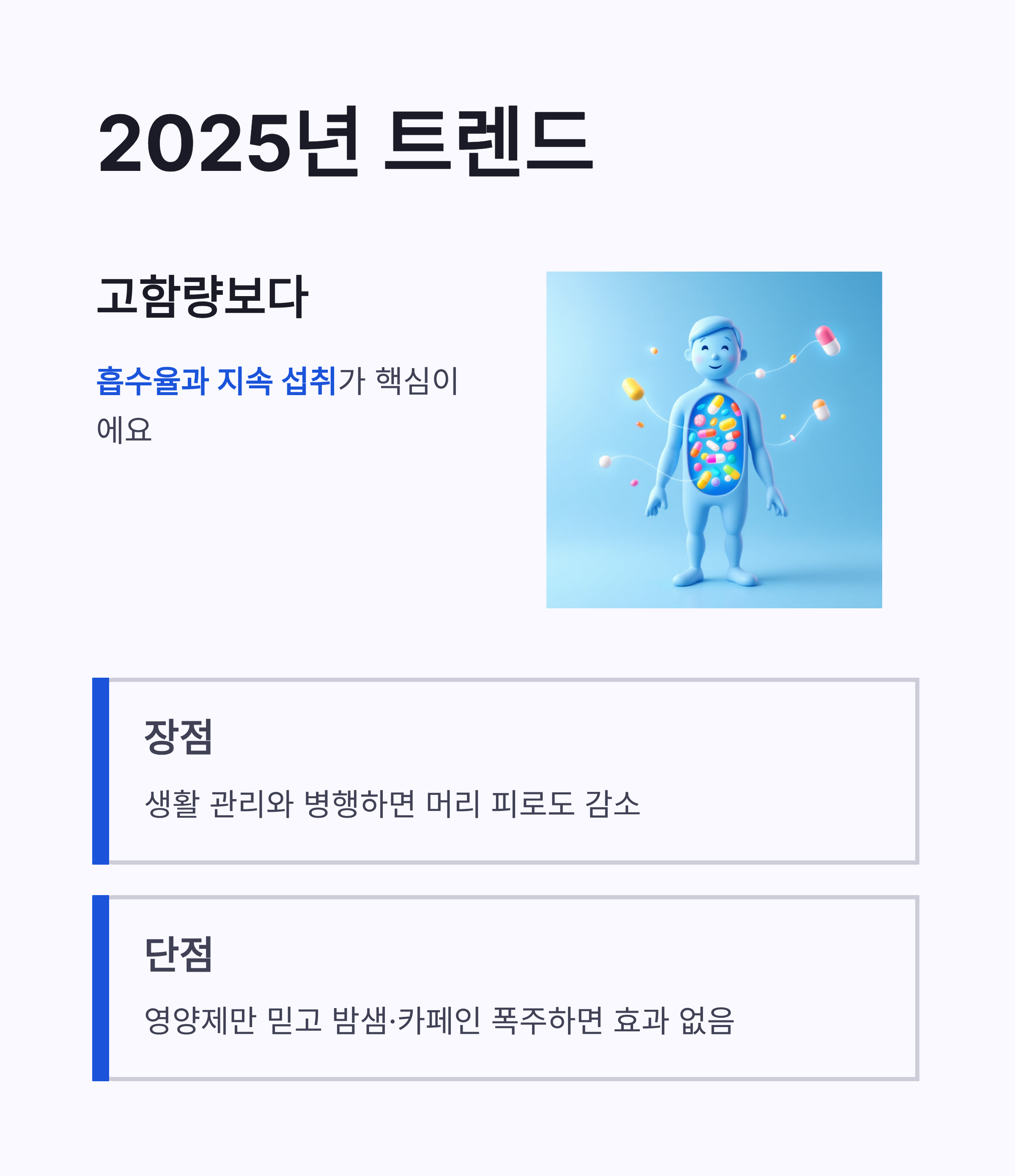 2025년 기준 트렌드는 “고함량”보단 흡수율·지속 섭취 쪽이에요. 장점은 명확해요. 생활 관리와 병행하면 머리 피로도가 덜해요. 반면 단점도 있어요. 뇌건강 영양제만 믿고 밤샘·카페인 폭주하면 효과 체감 거의 없더라구요 ㅋㅋ 그래서 저는 체크리스트를 만들었어요.
