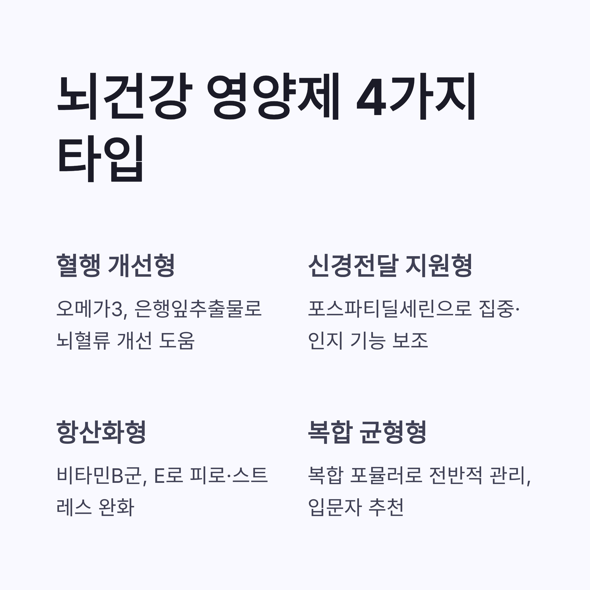 | 혈행 개선형 | 오메가3, 은행잎추출물 | 뇌혈류 개선 도움 | 머리 멍함 잦은 경우 |