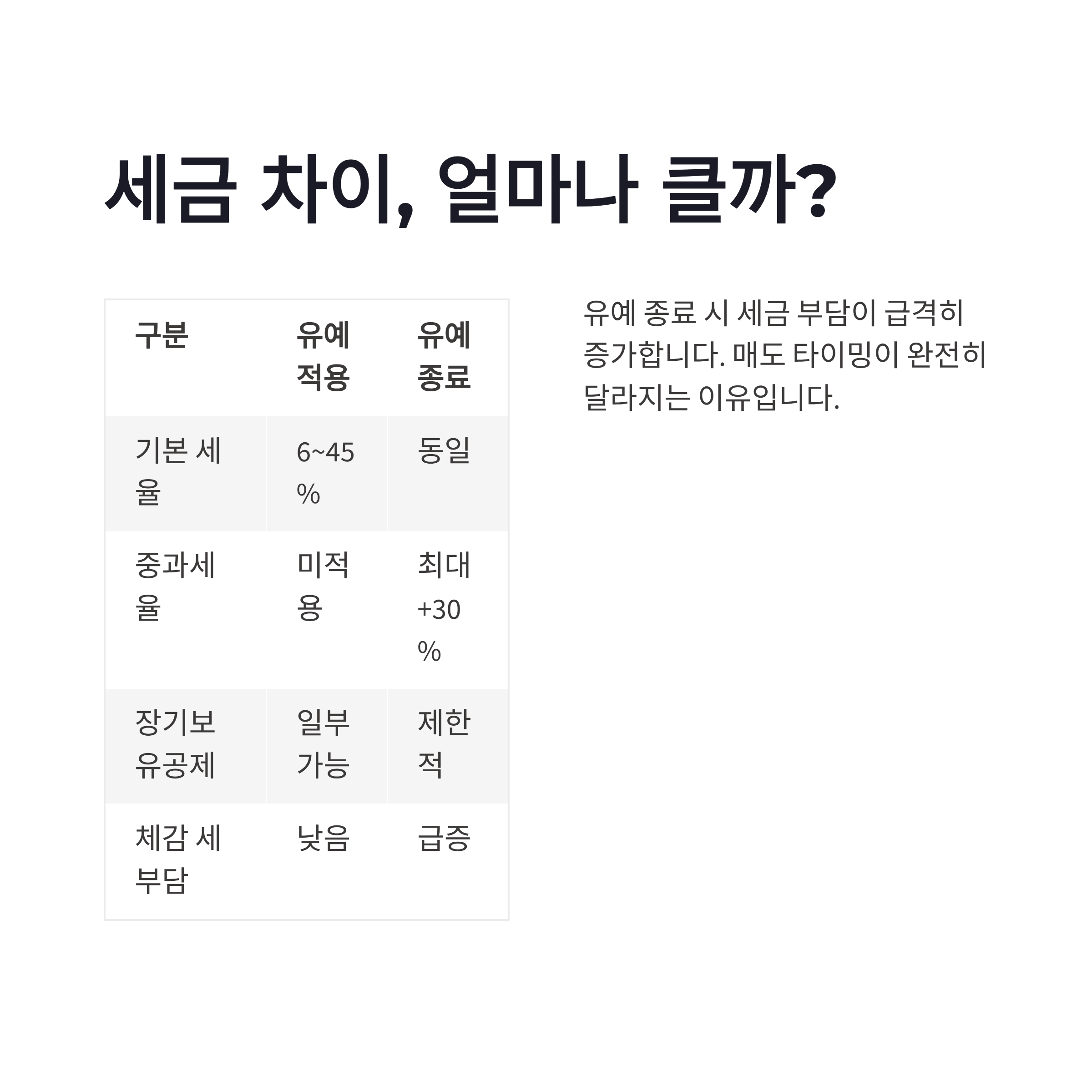 다주택자 양도세 중과 유예가 왜 이렇게 중요하냐면, 세금 차이가 생각보다 큽니다. 유예 기간에는 기본 양도세율만 적용되지만, 종료되면 중과세율이 바로 붙거든요. 저도 계산기 두드려보고 깜짝 놀랐어요.