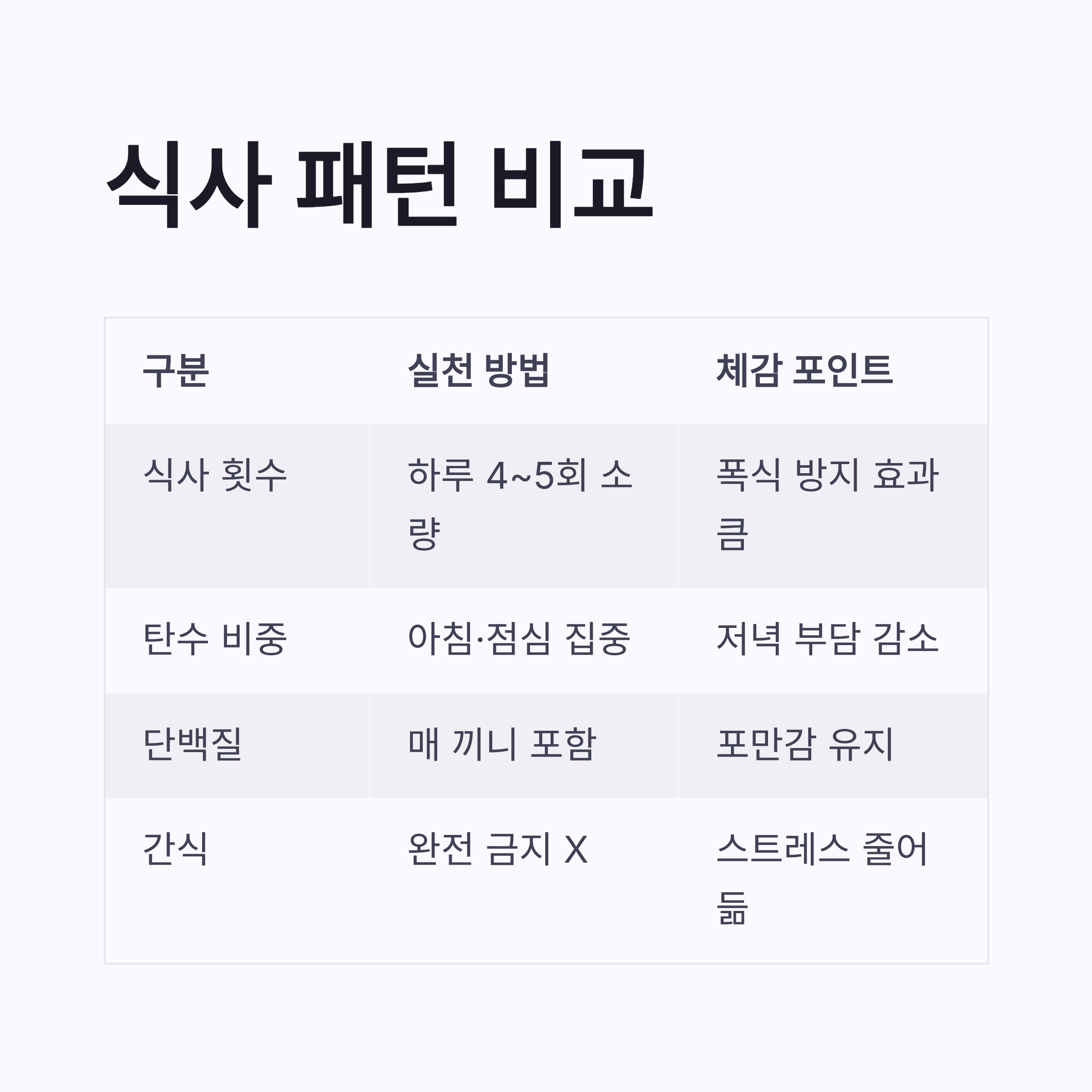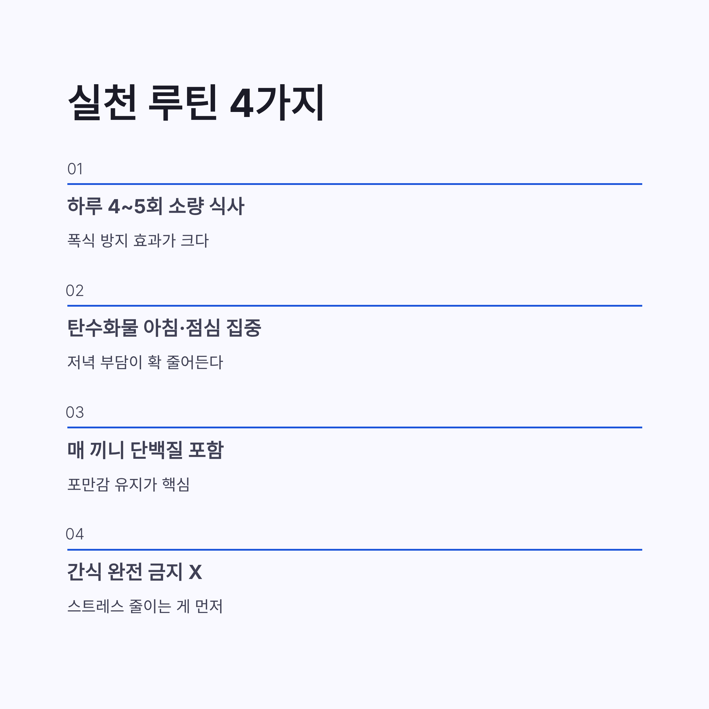 | 식사 횟수 | 하루 4~5회 소량 | 폭식 방지 효과 큼 |