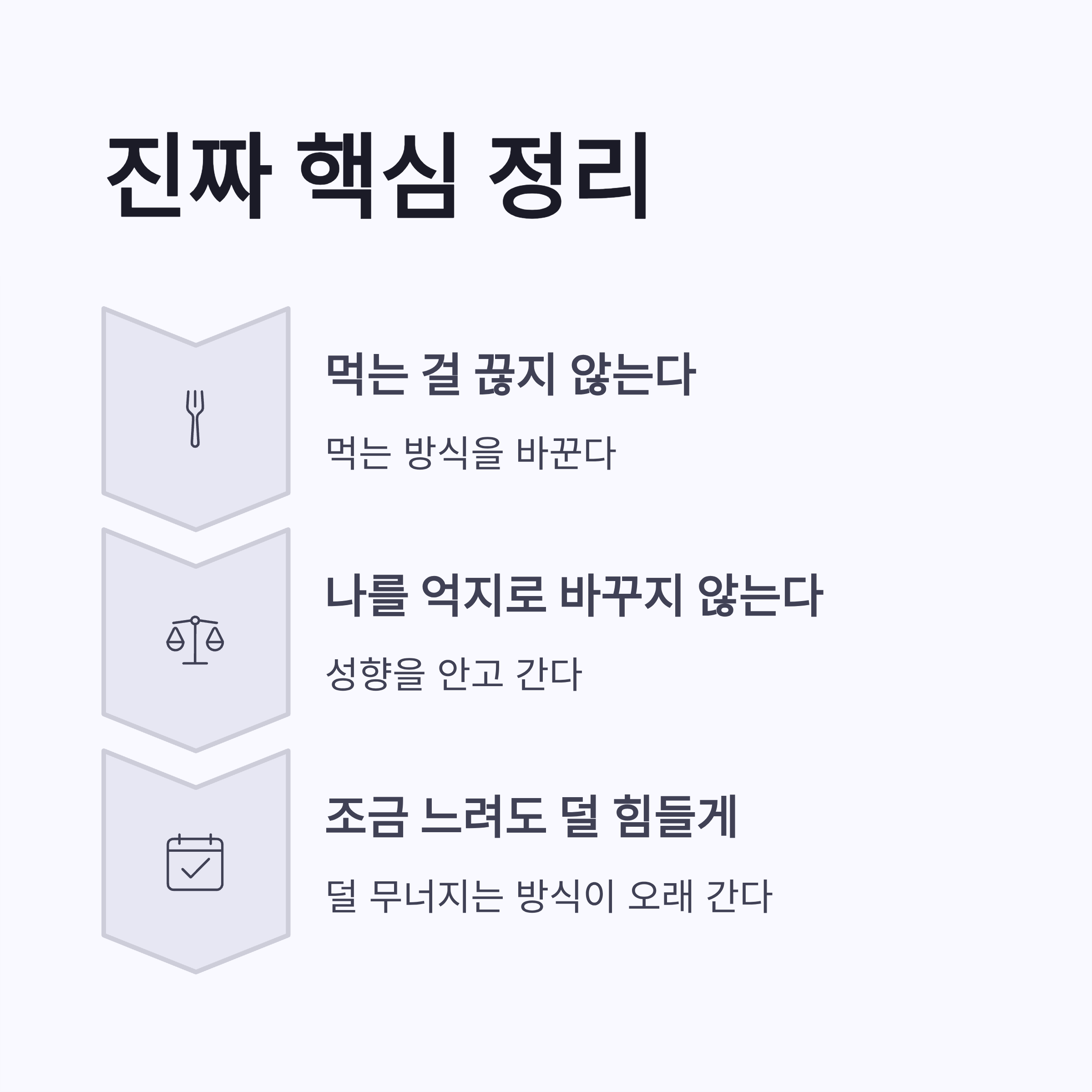 | 단백질 | 매 끼니 포함 | 포만감 유지 |