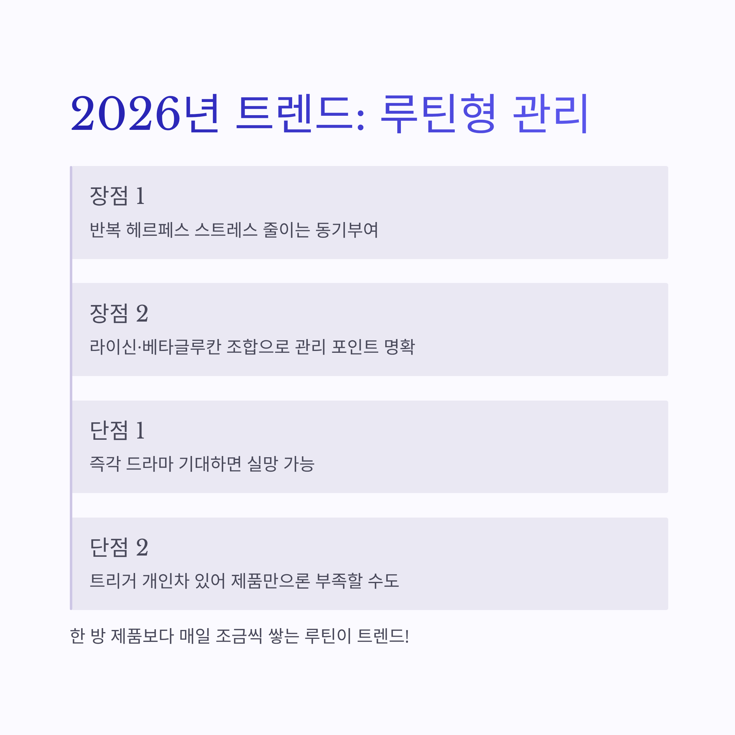 2026년에는 “한 방 제품”보다 “매일 조금씩 쌓는 루틴형” 건강관리 트렌드가 더 강해진 느낌이에요. 그런 면에서 라이신 베타글루칸 라이시딘도 루틴 템으로 접근하면 만족도가 올라가는 편! 장점은 1) 반복되는 헤르페스 스트레스 때문에 생활 패턴을 바꾸고 싶은 사람에게 동기부여가 되고, 2) 라이신/베타글루칸 조합이라 관리 포인트가 명확하다는 거. 단점은 1) 즉각적인 드라마를 기대하면 실망할 수 있고, 2) 사람마다 트리거(수면/음주/스트레스)가 달라서 “제품만”으로 해결하려 들면 답답해질 수 있어요. 저는 그래서 라이신 베타글루칸 라이시딘 + 수면 30분이라도 더 + 물 섭취 늘리기… 이렇게 묶어서 갔더니 체감이 더 괜찮았던 편이었네요.
