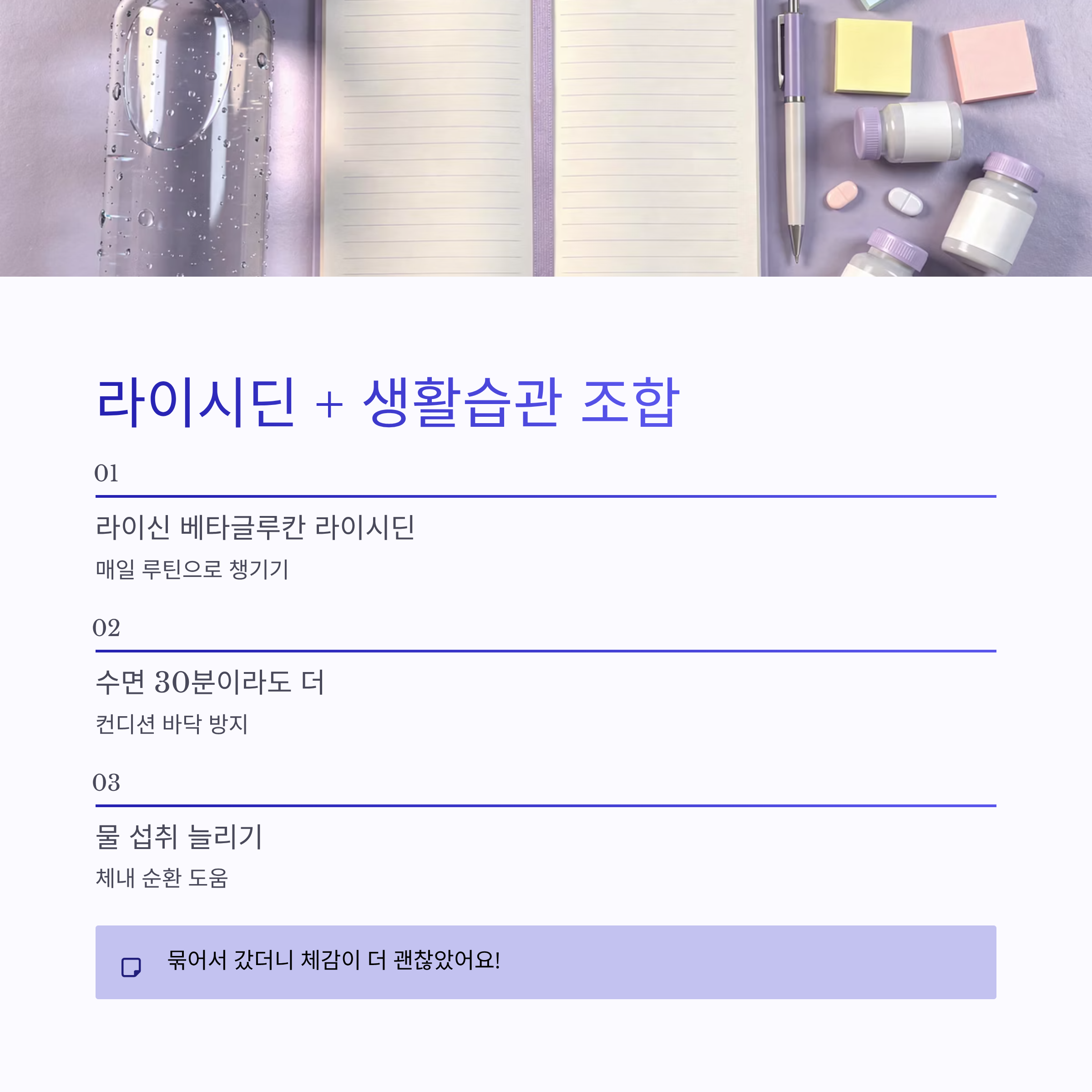 제가 라이신 베타글루칸 라이시딘을 볼 때 체크한 건 “라이신 + 베타글루칸 조합이 왜 같이 붙었나”였어요. 라이신은 단백질 구성 아미노산 쪽이고, 베타글루칸은 컨디션 관리에 자주 언급되는 원료라서 같이 묶어 루틴화하기 좋다는 느낌! 저는 공복에 예민한 날이 있어서, 아침보단 점심~저녁 사이로 밀어두는 편이 편했구요(개인차 있음). 정리하면 이런 느낌이에요.