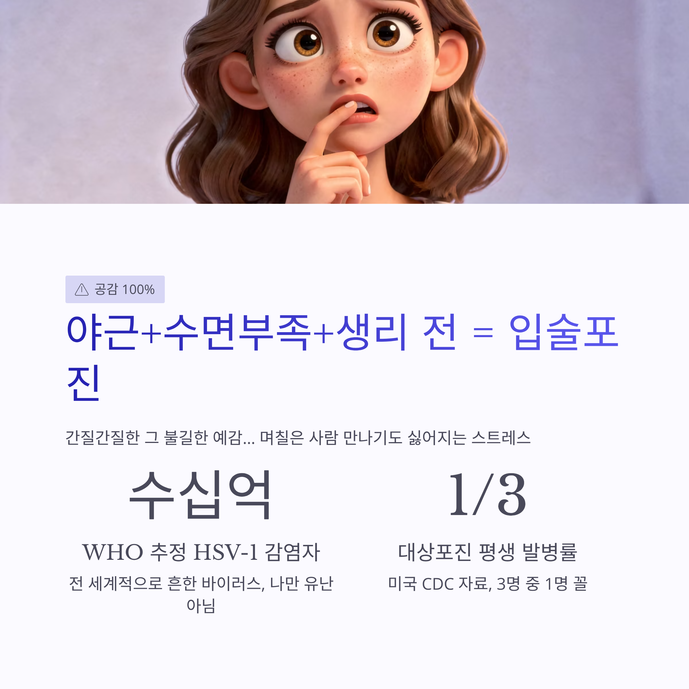 진짜… 입술포진 한 번 올라오면 며칠은 사람 만나기도 싫어지잖아요 ㅠㅠ 저도 야근+잠 부족+생리 전 콤보 때마다 “또 오네?” 하고 멘붕 왔었구요. 그래서 이것저것 찾아보다가 라이신 베타글루칸 라이시딘을 알게 됐는데, 포인트는 “면역 루틴”을 꾸준히 챙기게 만든다는 느낌이었어요. 갑자기 완치! 이런 게 아니라, 컨디션 바닥치는 날을 좀 덜 만들게 도와주는 쪽? 특히 입술이 간질간질할 때(그 불길한 예감ㅋㅋ) 루틴을 안 끊고 가져가는 게 은근히 중요하더라구요. 참고로 WHO는 HSV-1 감염자가 전 세계적으로 수십억 수준(2016년 추정)이라고 했을 정도로 흔한 바이러스라, 나만 유난인 것도 아니었음… 위로 됐습니다.