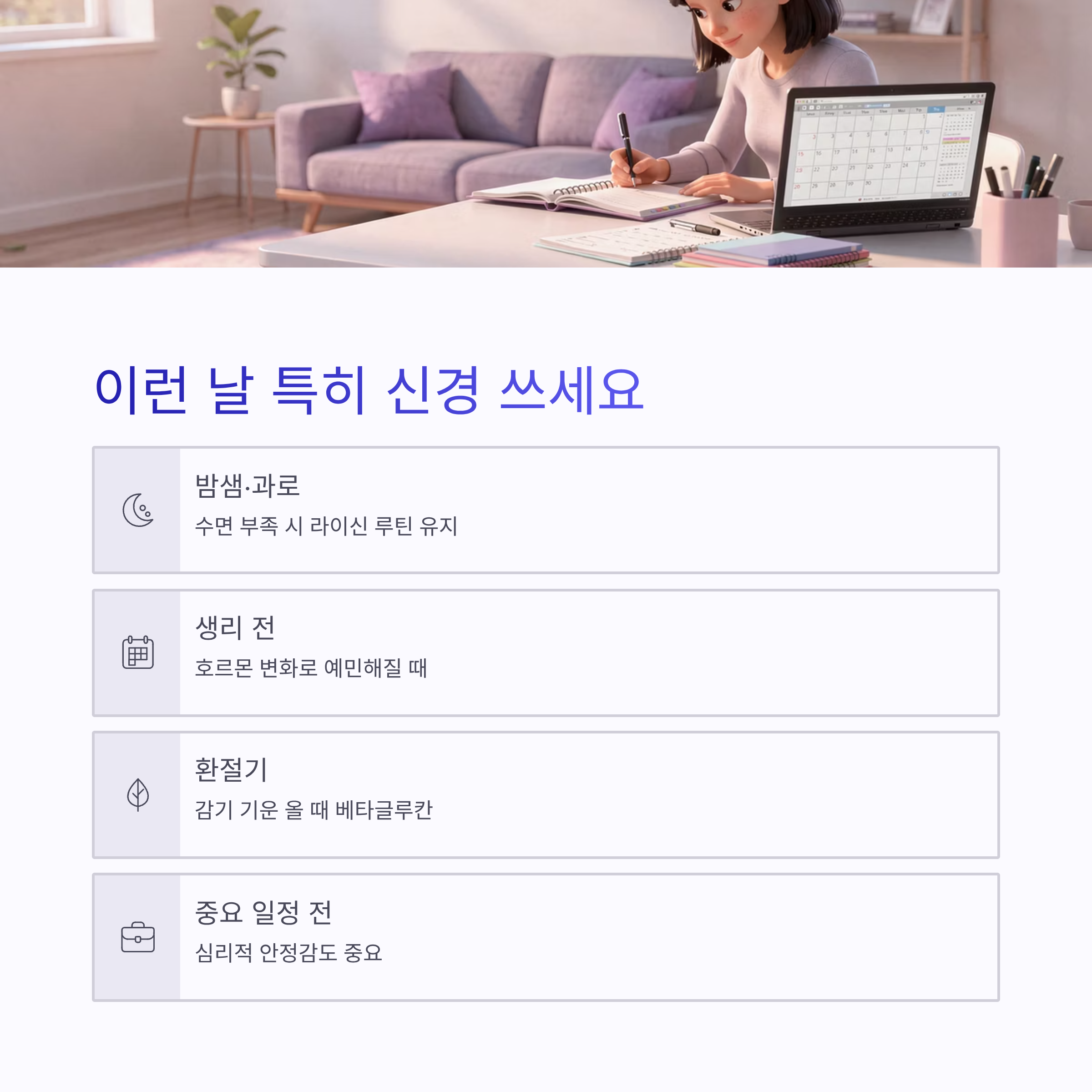 | 라이신 | 입술 주변이 예민할 때 “관리 스위치” 켜주는 느낌 | 밤샘/생리 전/과로 |