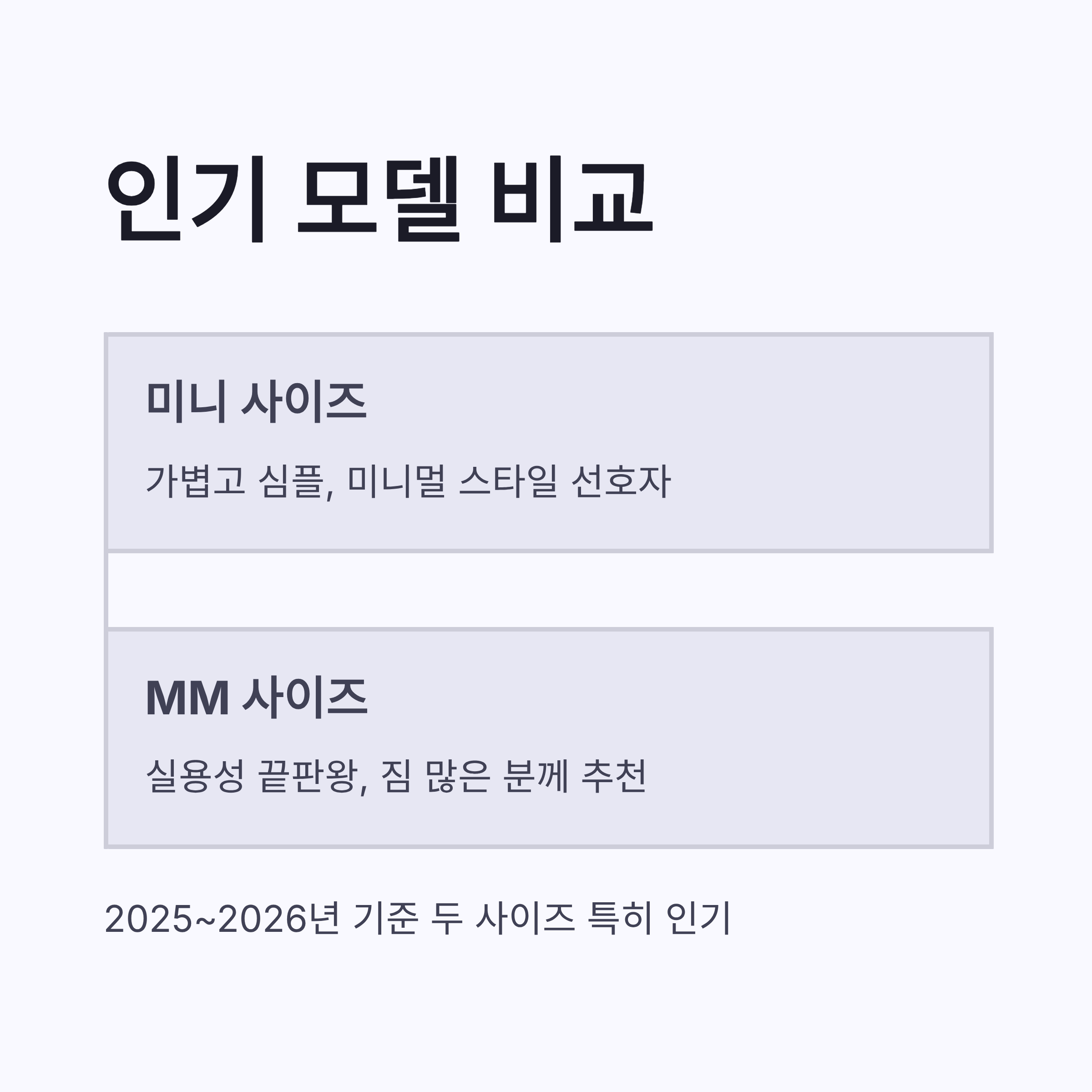 2025~2026년 기준으로 미니·MM 사이즈가 특히 인기예요. 미니는 가볍고, MM은 실용성 끝판왕. 장점은 디자인 유행 덜 타고, 단점은… 가격이쥬 ㅠㅠ 그래도 중고가 방어 생각하면 납득되더라구요. 트렌드는 로고 과하지 않은 디자인 쪽으로 가는 중이라 오래 들기 좋아요.