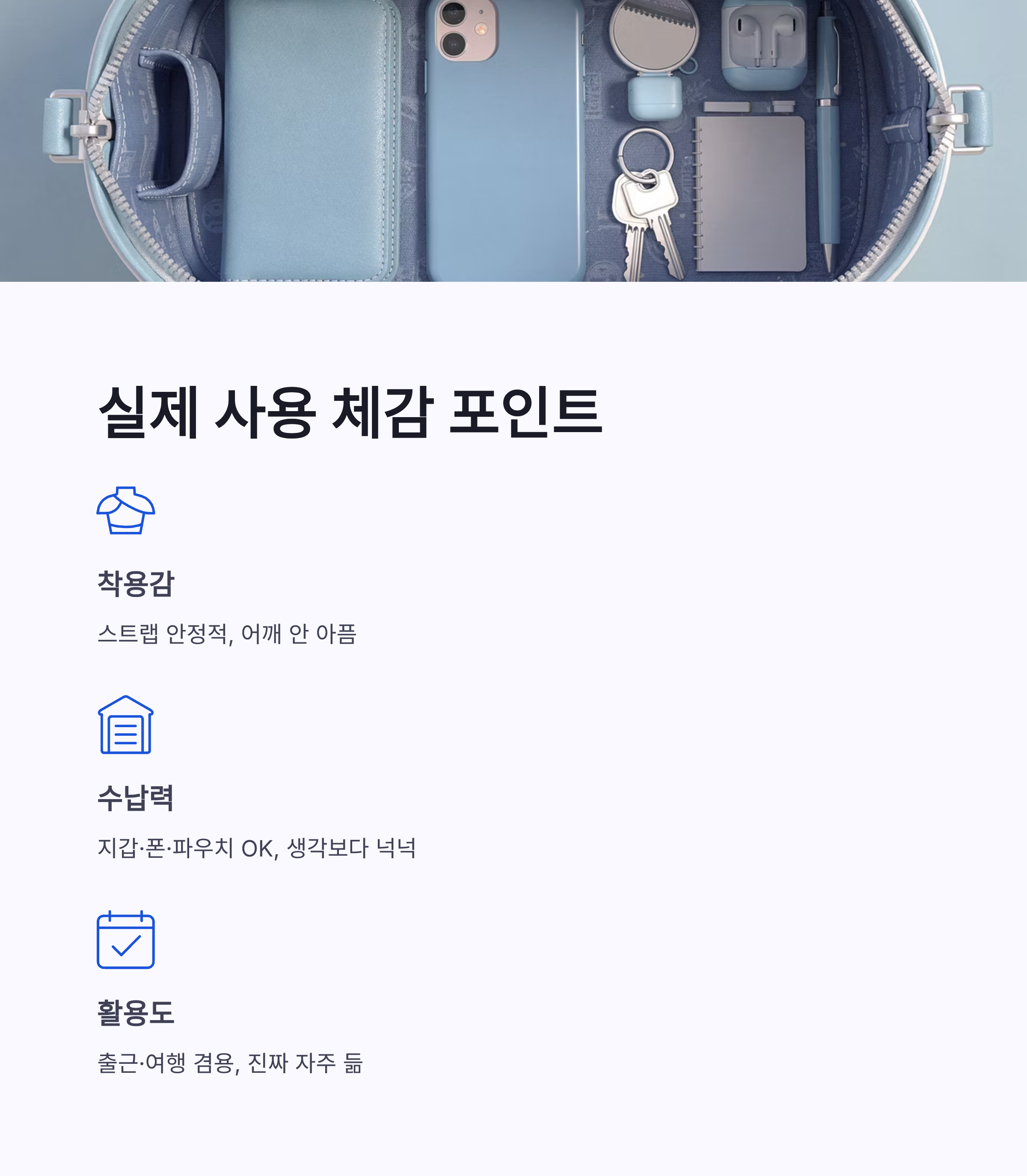 | 수납 | 지갑·폰·파우치 OK | 생각보다 넉넉 |