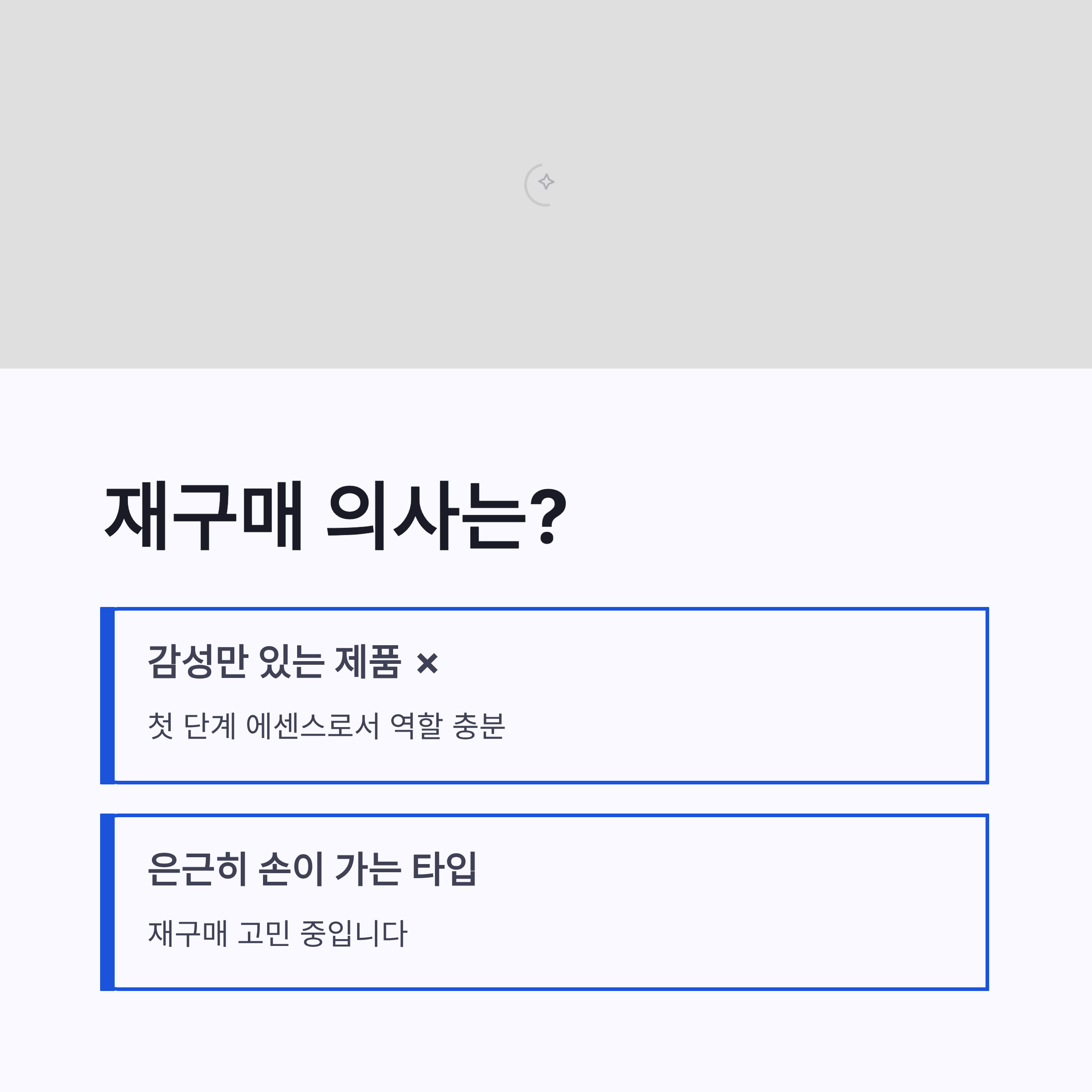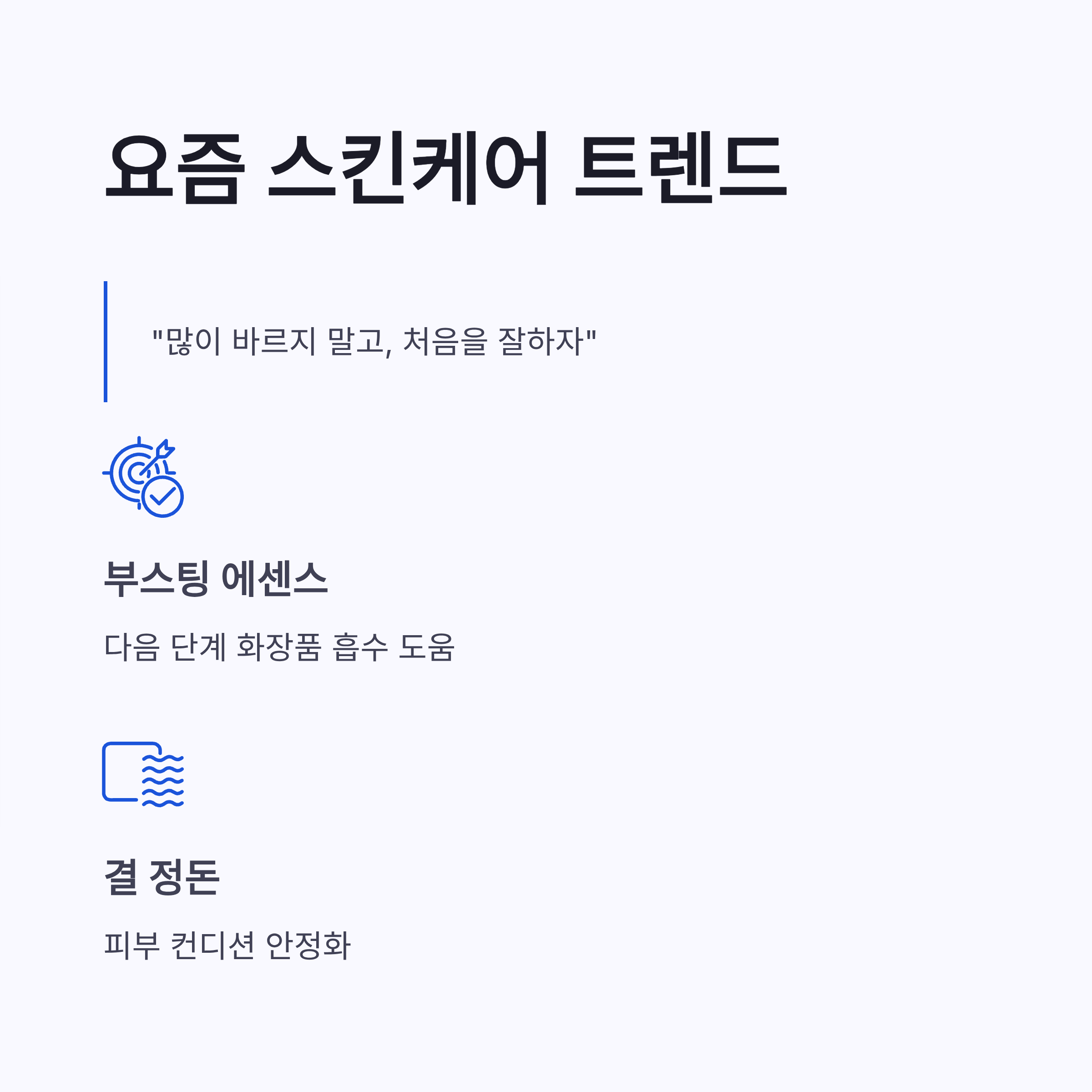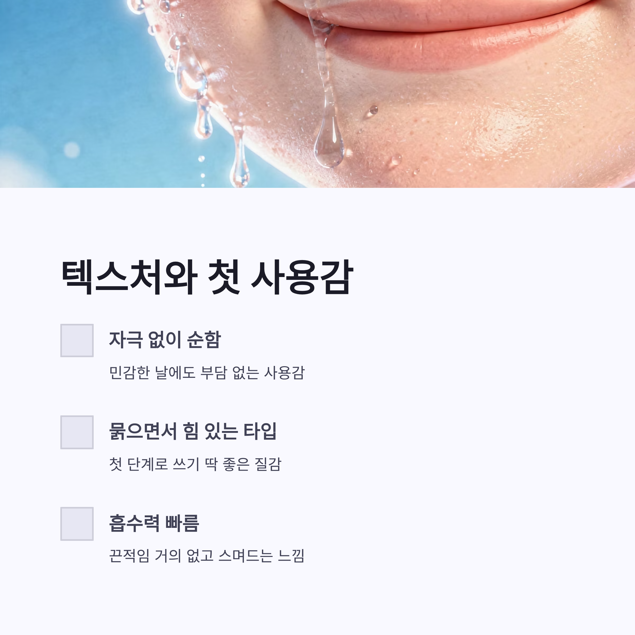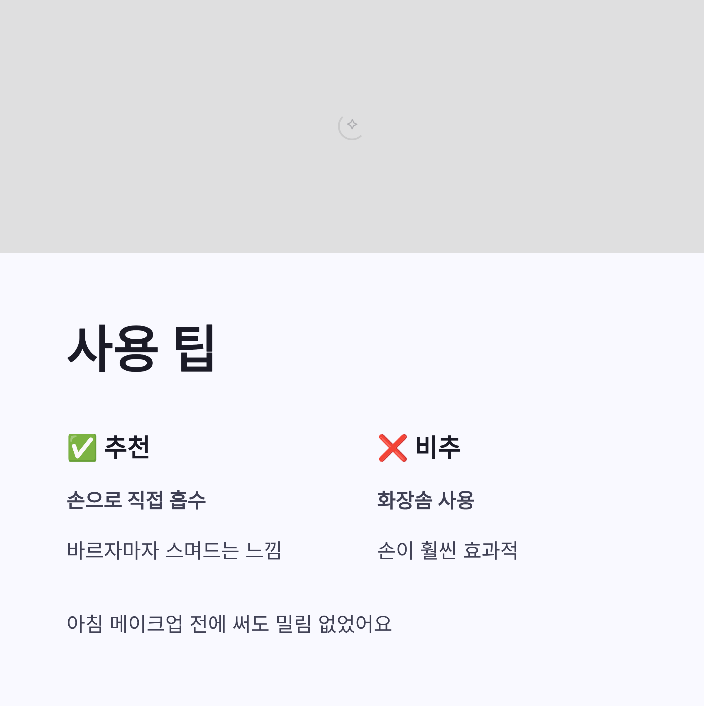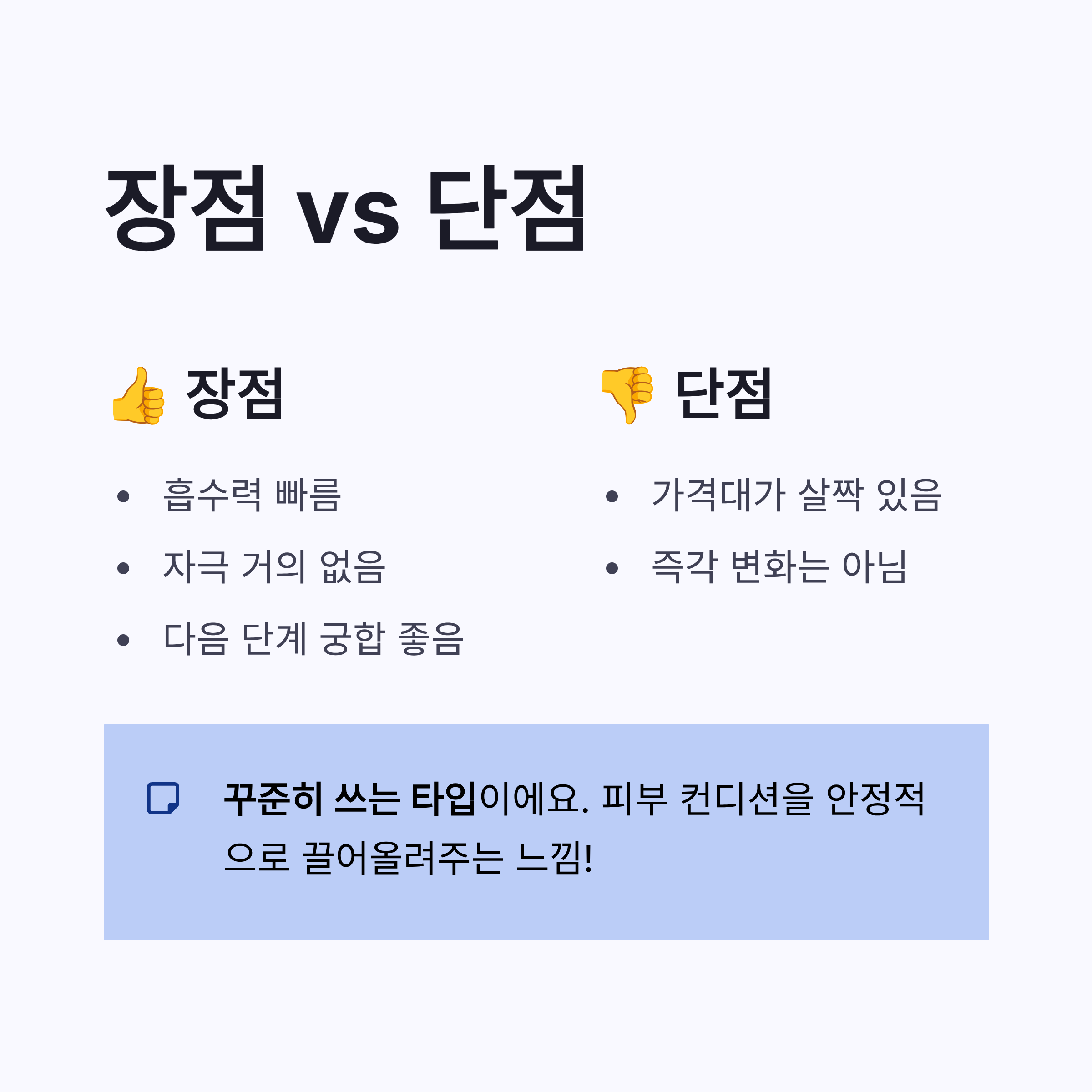 * 흡수력 빠름 * 자극 거의 없음 * 다음 단계 화장품 궁합 좋음