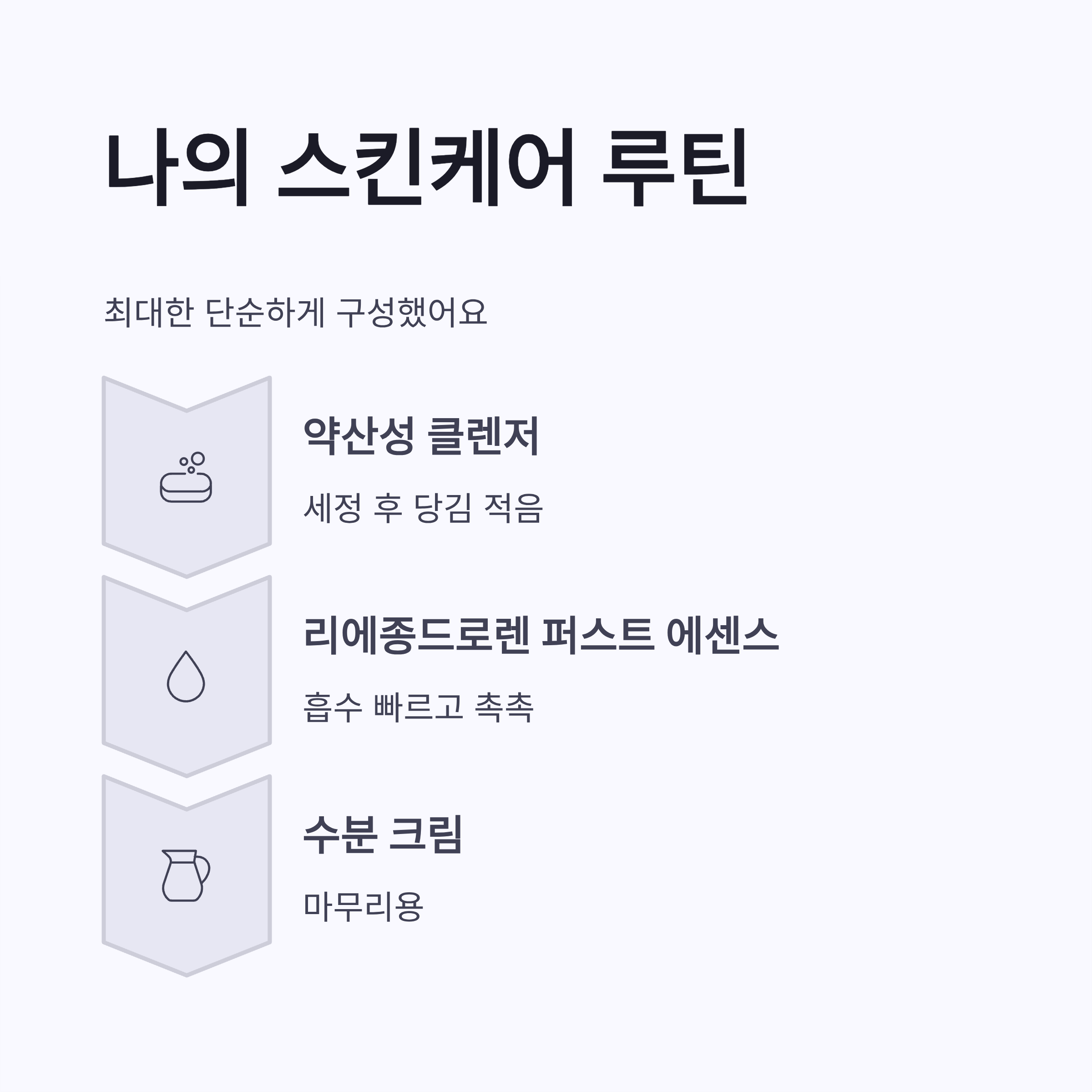 | 단계 | 사용 제품 | 느낌 | | -- | -------------- | ---------- | | 1 | 약산성 클렌저 | 세정 후 당김 적음 | | 2 | 리에종드로렌 퍼스트 에센스 | 흡수 빠르고 촉촉 | | 3 | 수분 크림 | 마무리용 |