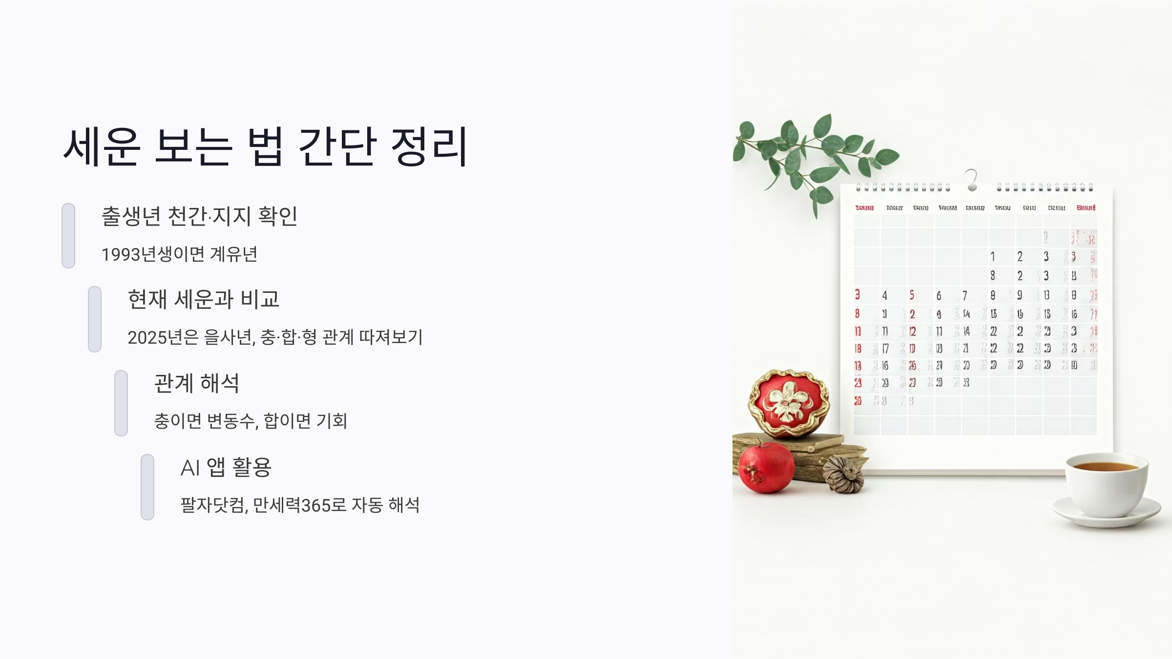 | 세운 | 해마다 바뀌는 개인 운세 흐름, 만세력 기반 연운 분석 |