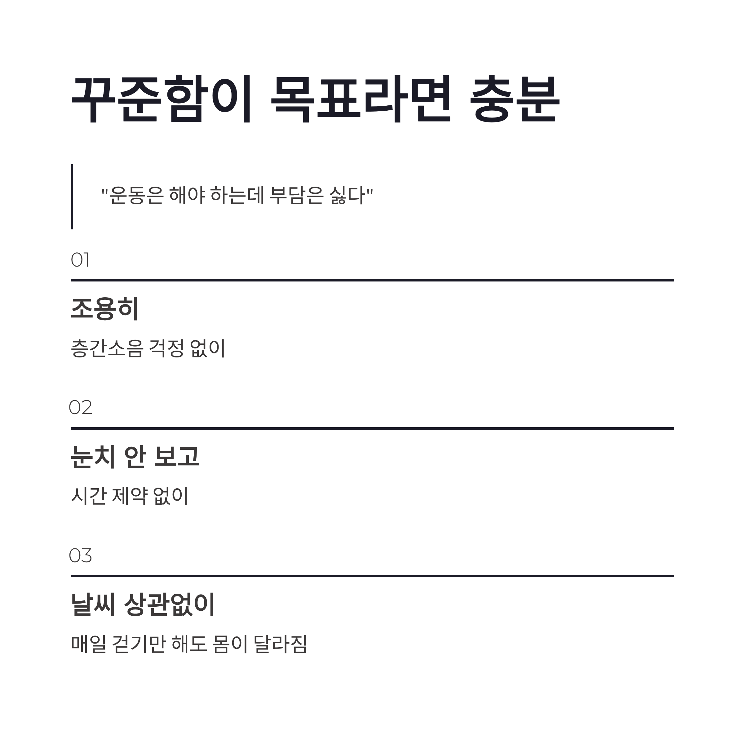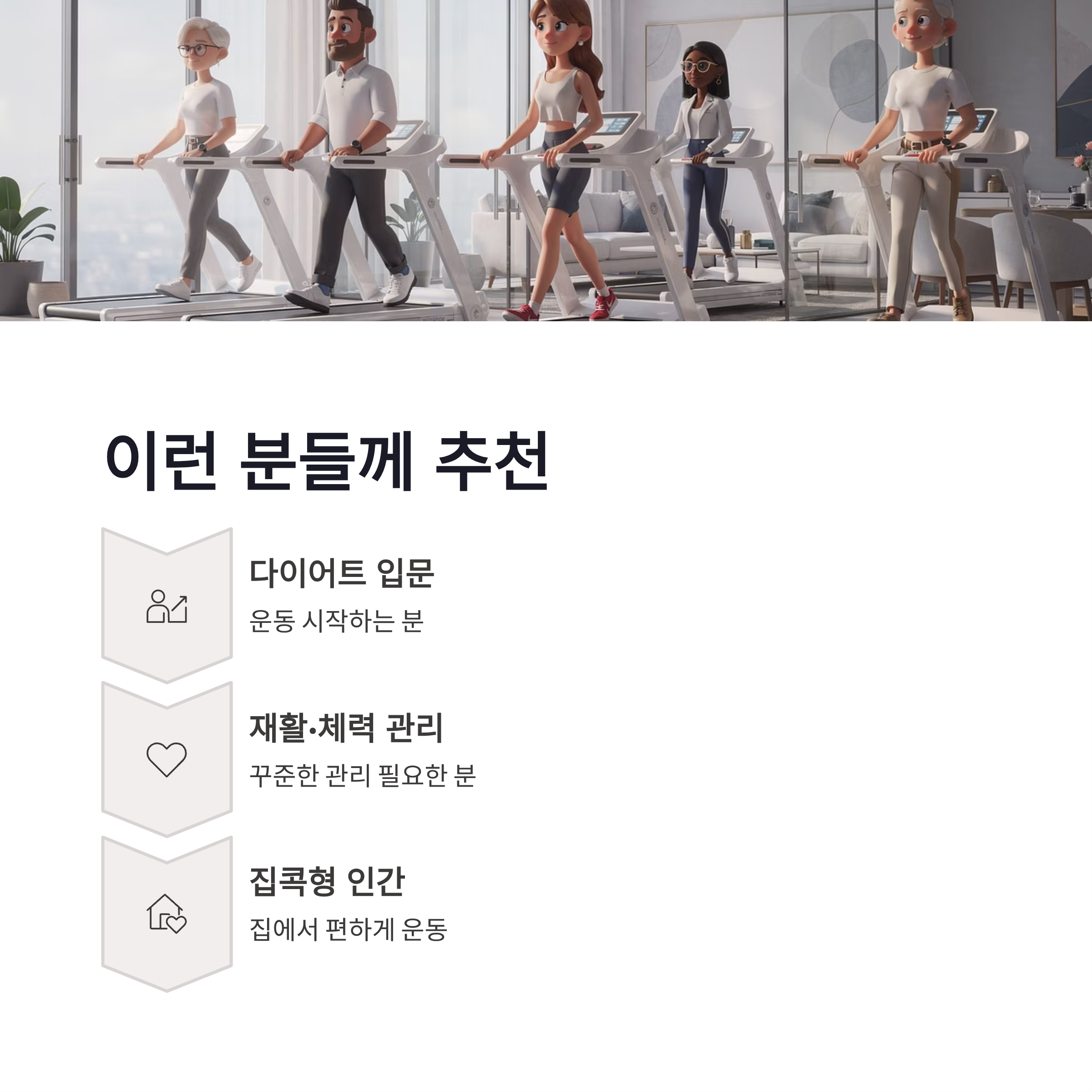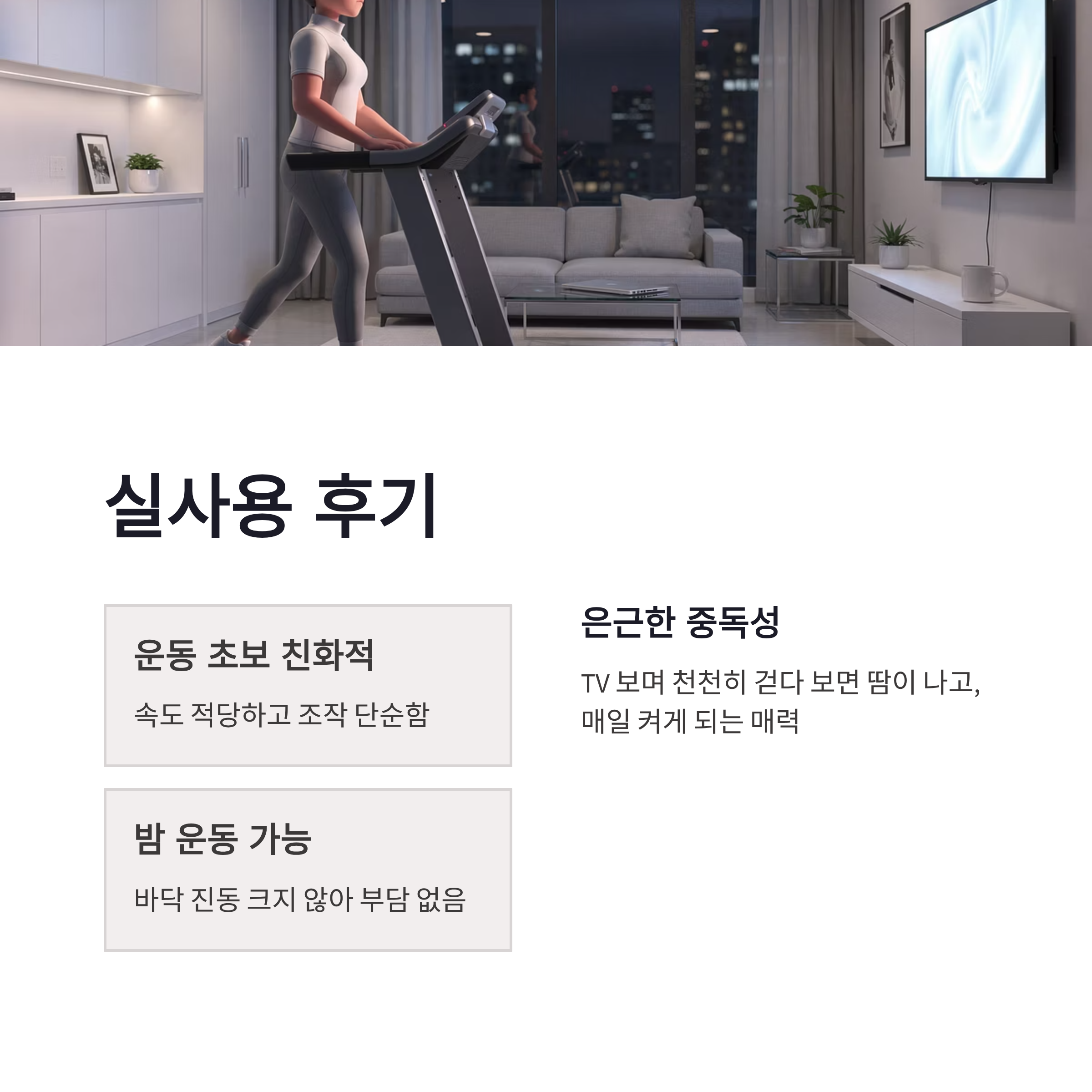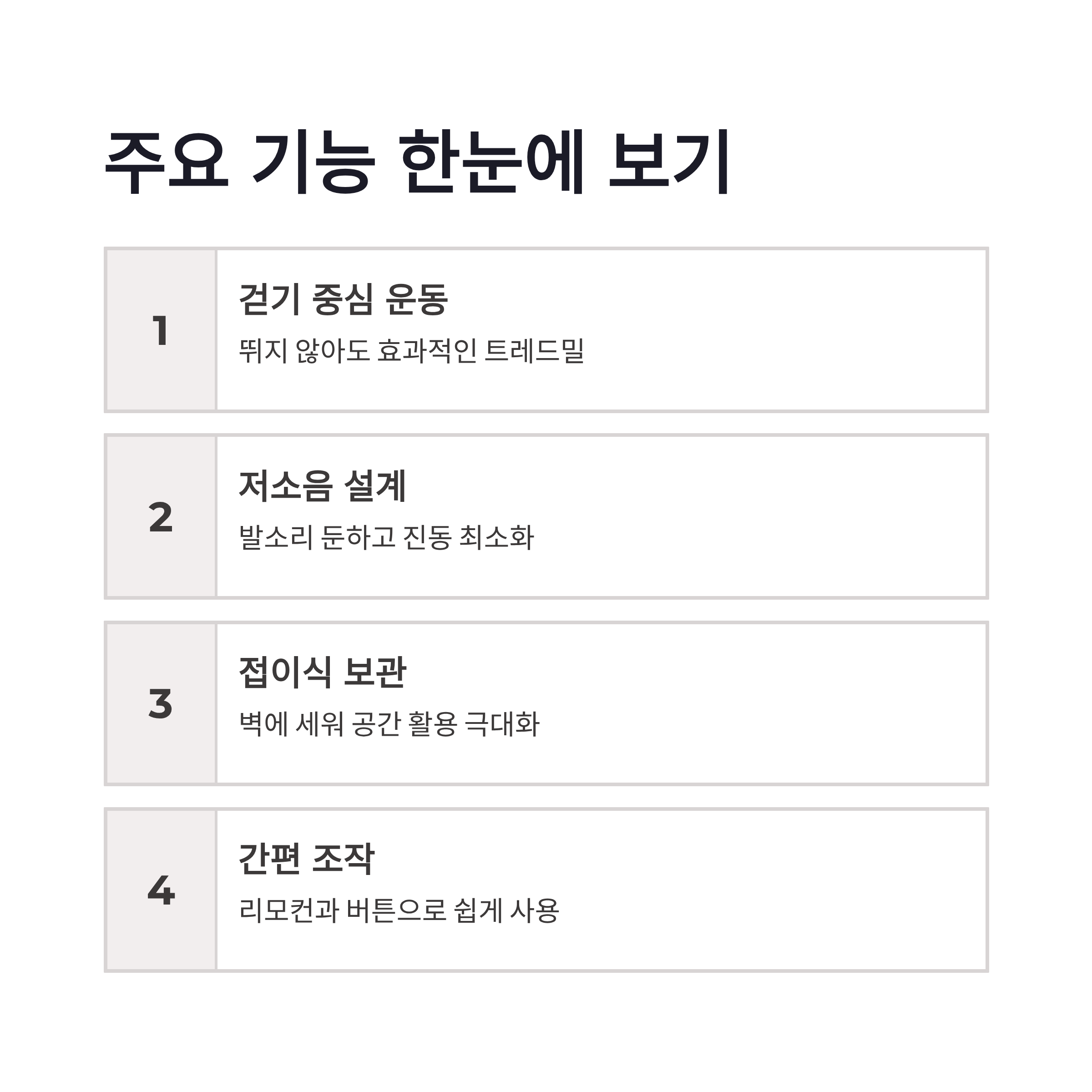 * 걷기 위주라 무릎 부담 적음 * 층간소음 걱정 거의 없음 * 접어서 보관 가능