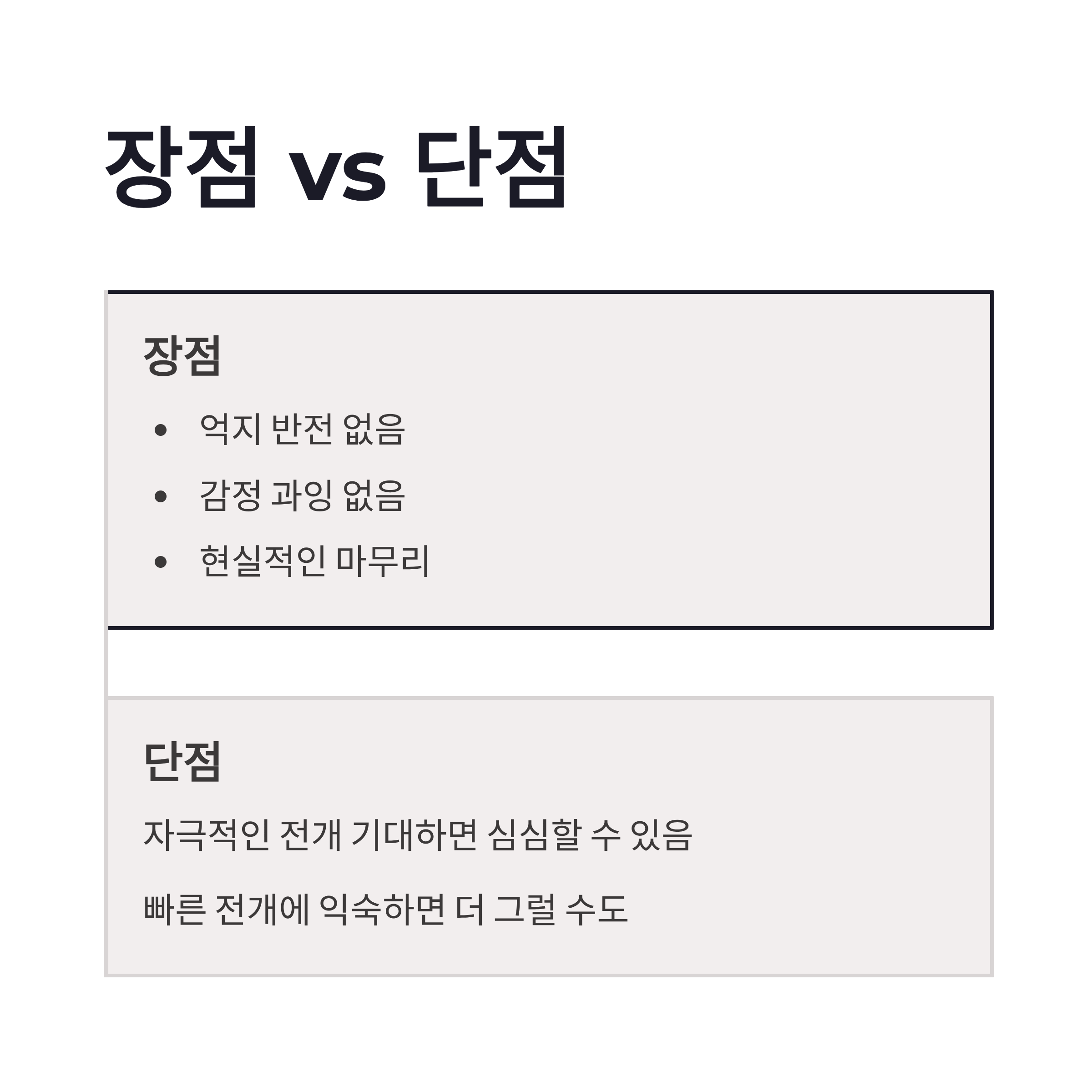 | 분위기 | 조용한 긴장감 | 계속 신경 쓰임 |