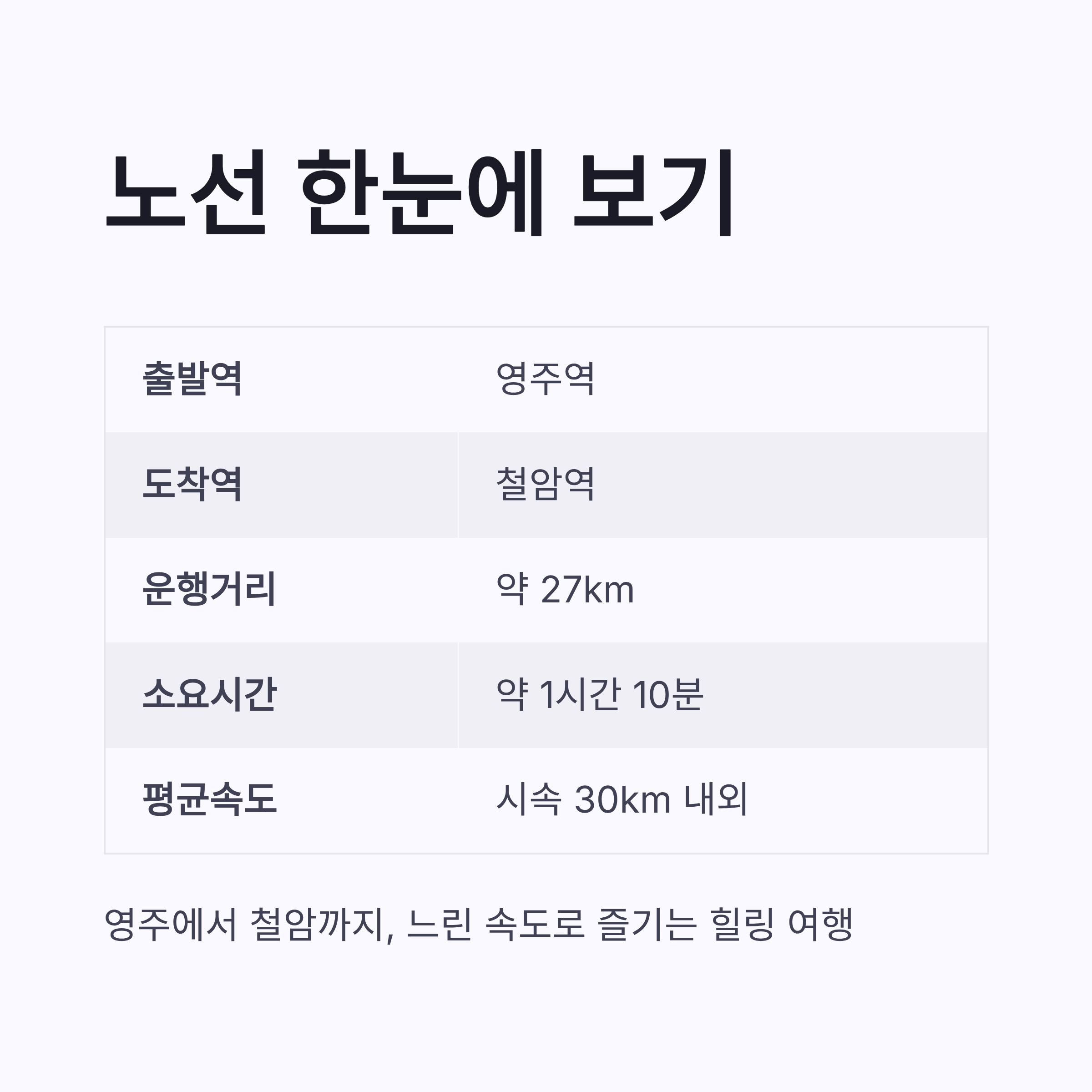 백두대간 협곡열차 노선은 생각보다 단순해요. 영주 ↔ 철암, 딱 이 구간입니다. 총 길이는 약 27km 정도인데, 속도가 시속 30km 내외라서 체감 시간은 꽤 길어요. 근데 그게 또 매력이더라구요.