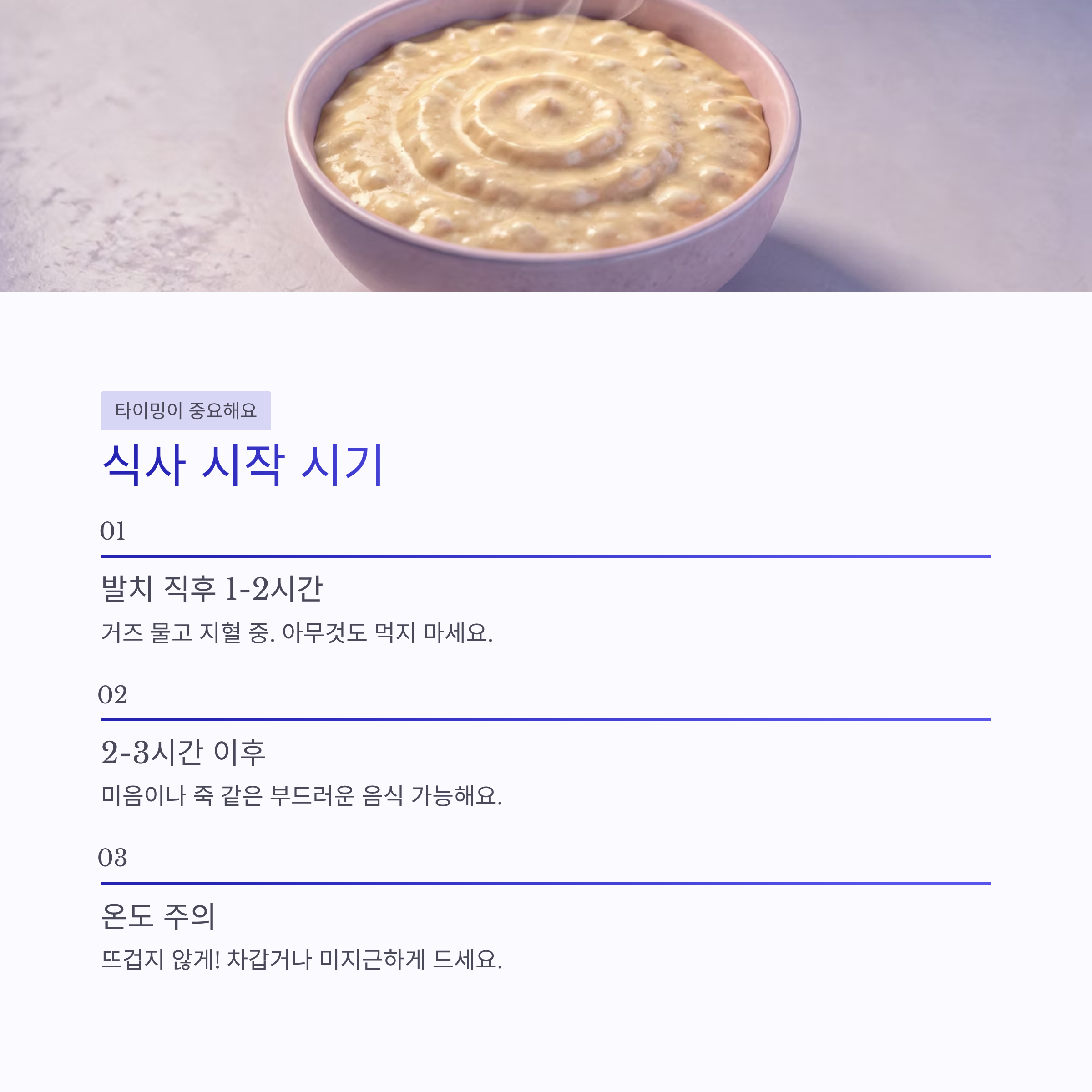 지혈이 어느 정도 되고 나면, 보통 발치 후 2~3시간 이후부터 미음이나 죽처럼 부드러운 음식은 가능했어요. 단, 뜨겁지 않게! 이게 핵심입니다. 실제로 치과에서도 사랑니 발치 후 식사는 “차갑거나 미지근하게” 하라고 강조하더라구요. 괜히 뜨거운 거 먹었다가 피 다시 나면 멘붕 옵니다 ㅠㅠ 이 시기엔 부드러움 + 자극 없음 이 두 가지만 기억하면 되겠더라구요.