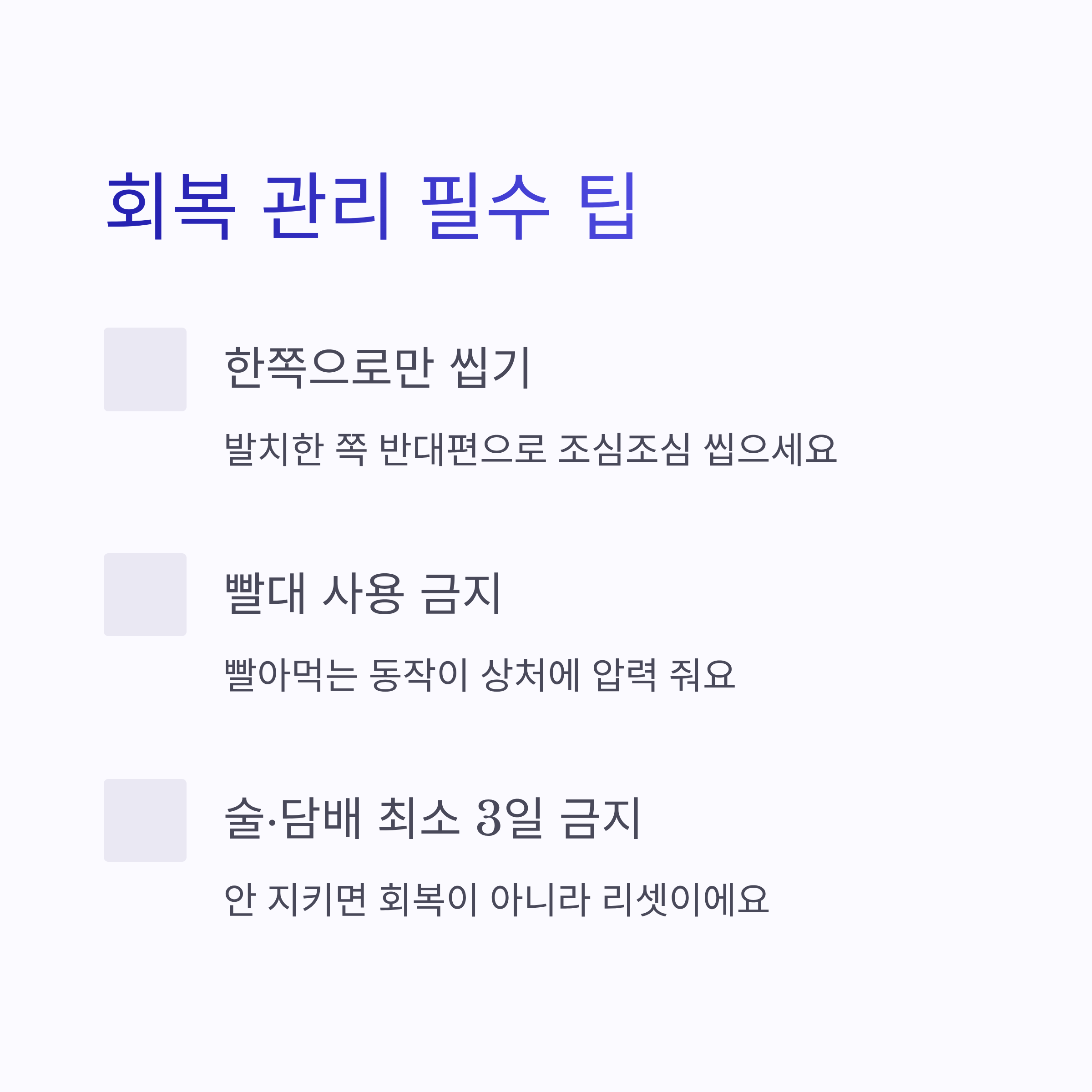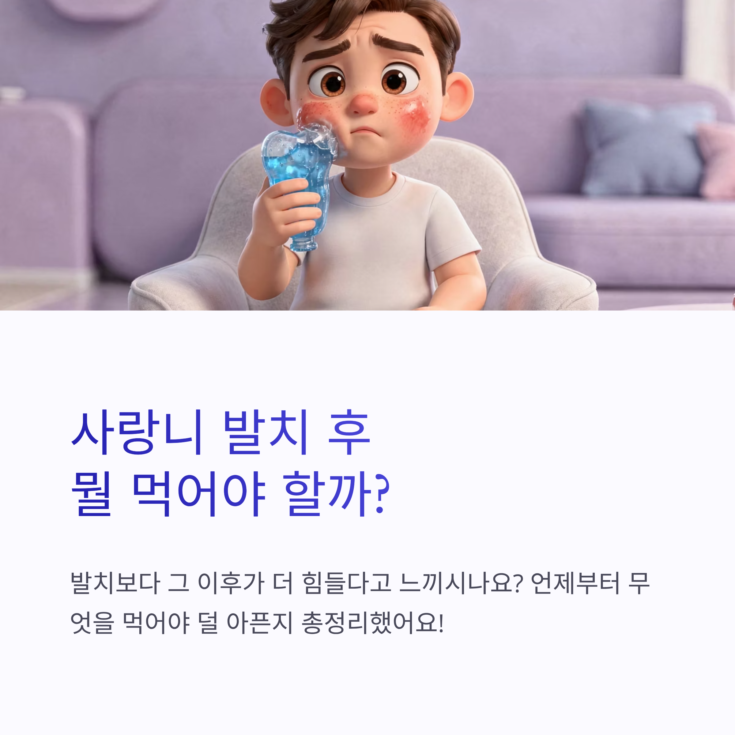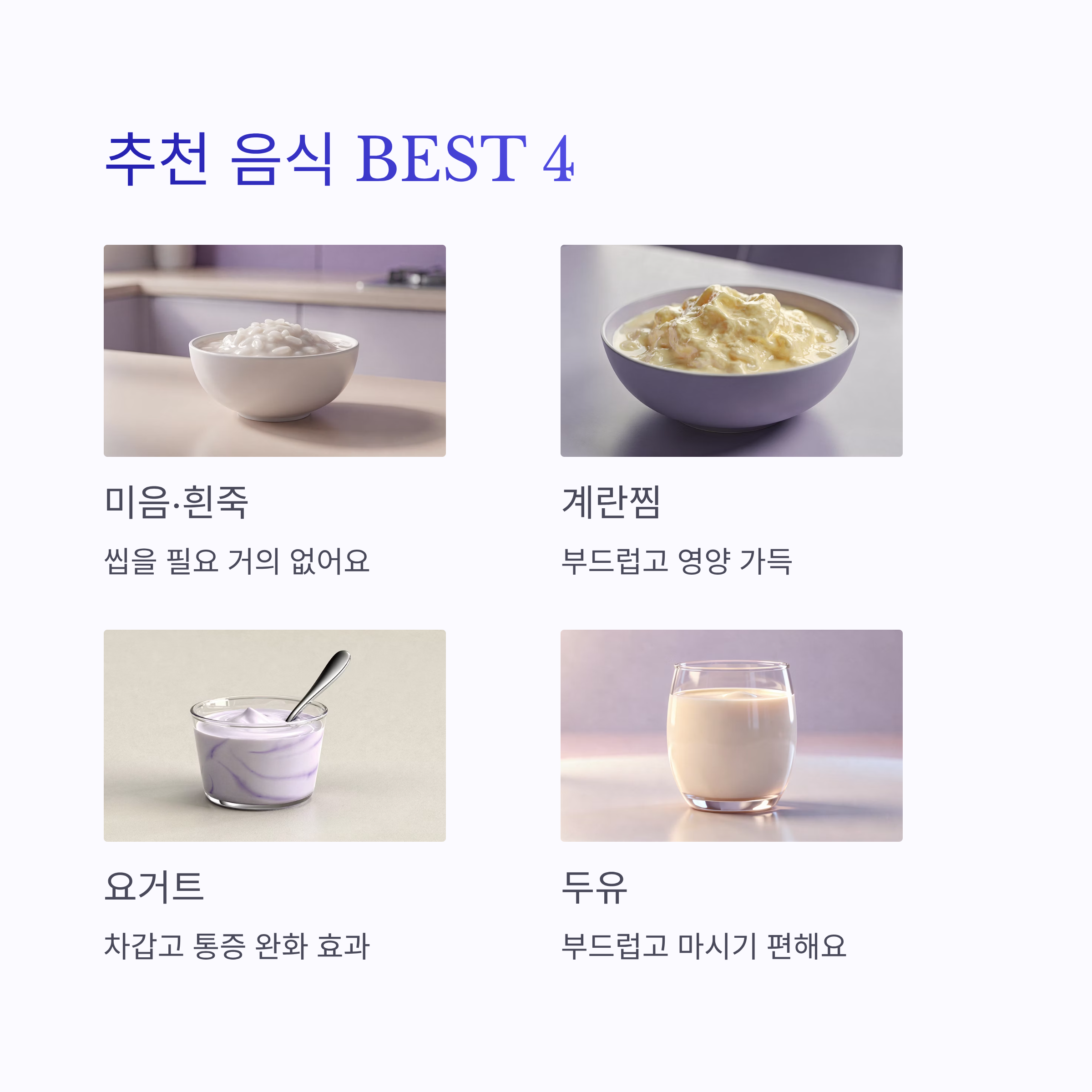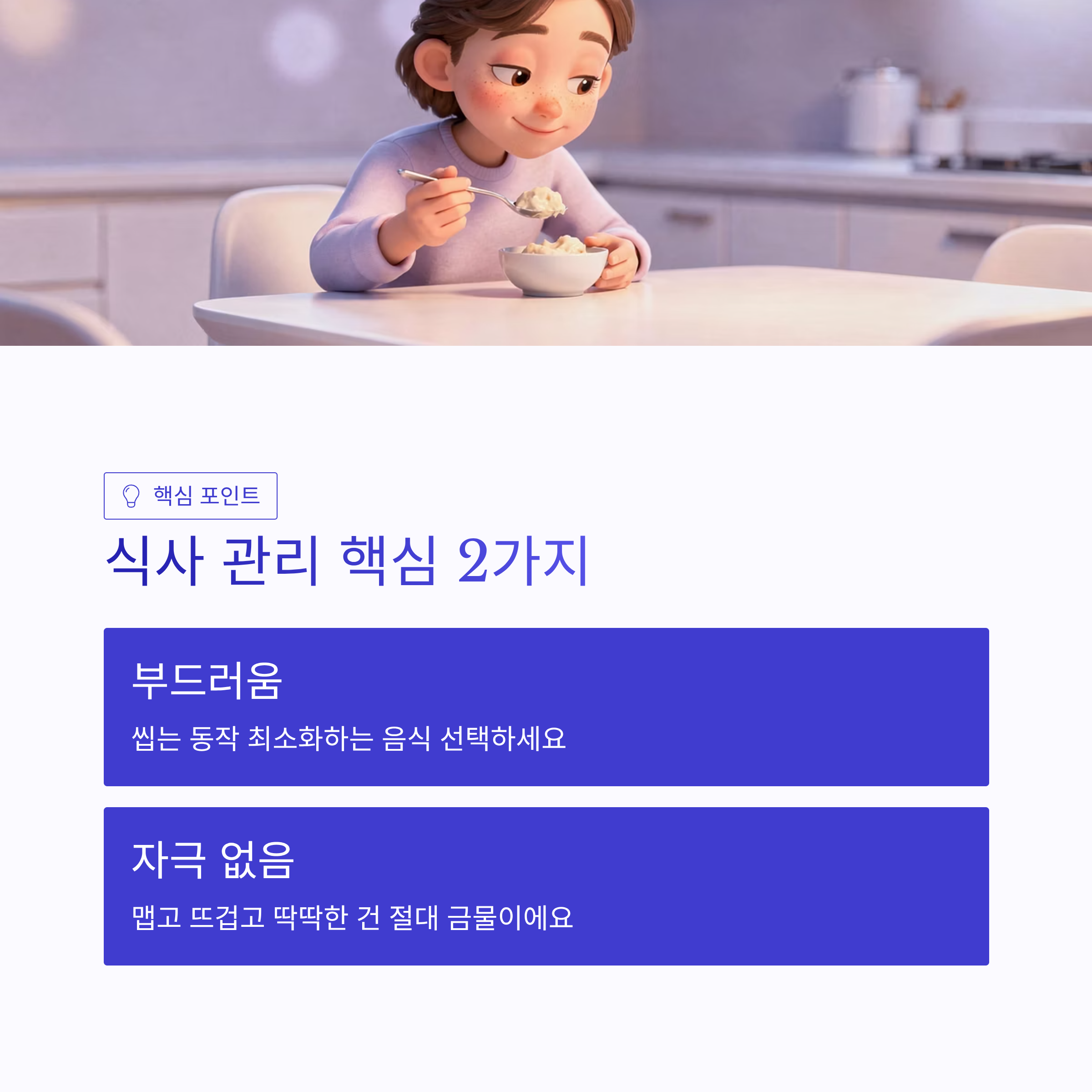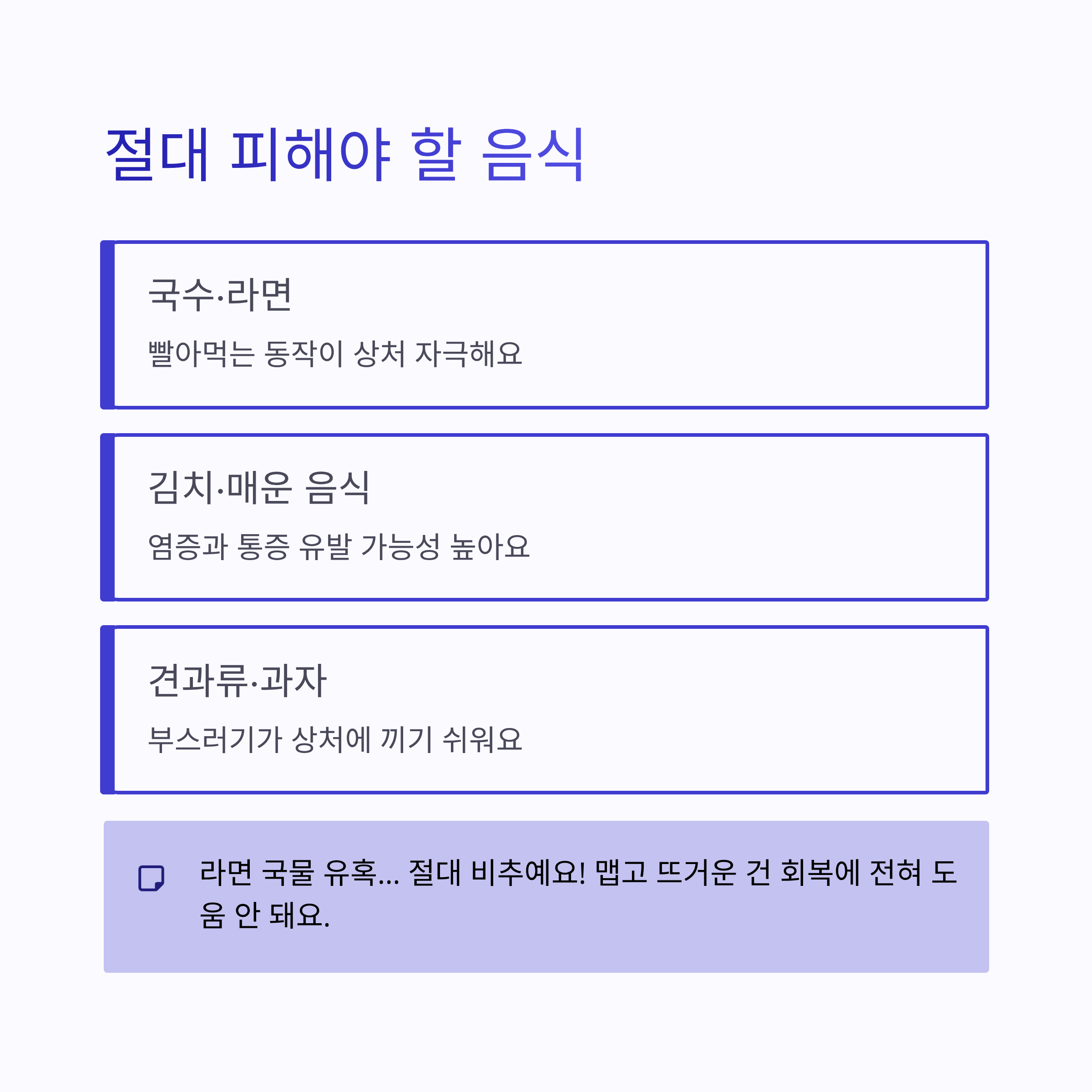 | 구분 | 음식 예시 | 이유 | | -- | ----------- | --------------- | | 추천 | 미음, 흰죽, 계란찜 | 씹을 필요 거의 없음 | | 추천 | 요거트, 두유 | 차갑고 부드러워서 통증 완화 | | 주의 | 국수, 라면 | 빨아먹는 동작이 상처 자극 | | 금지 | 김치, 매운 음식 | 염증·통증 유발 가능 | | 금지 | 견과류, 과자 | 부스러기 끼기 쉬움 |