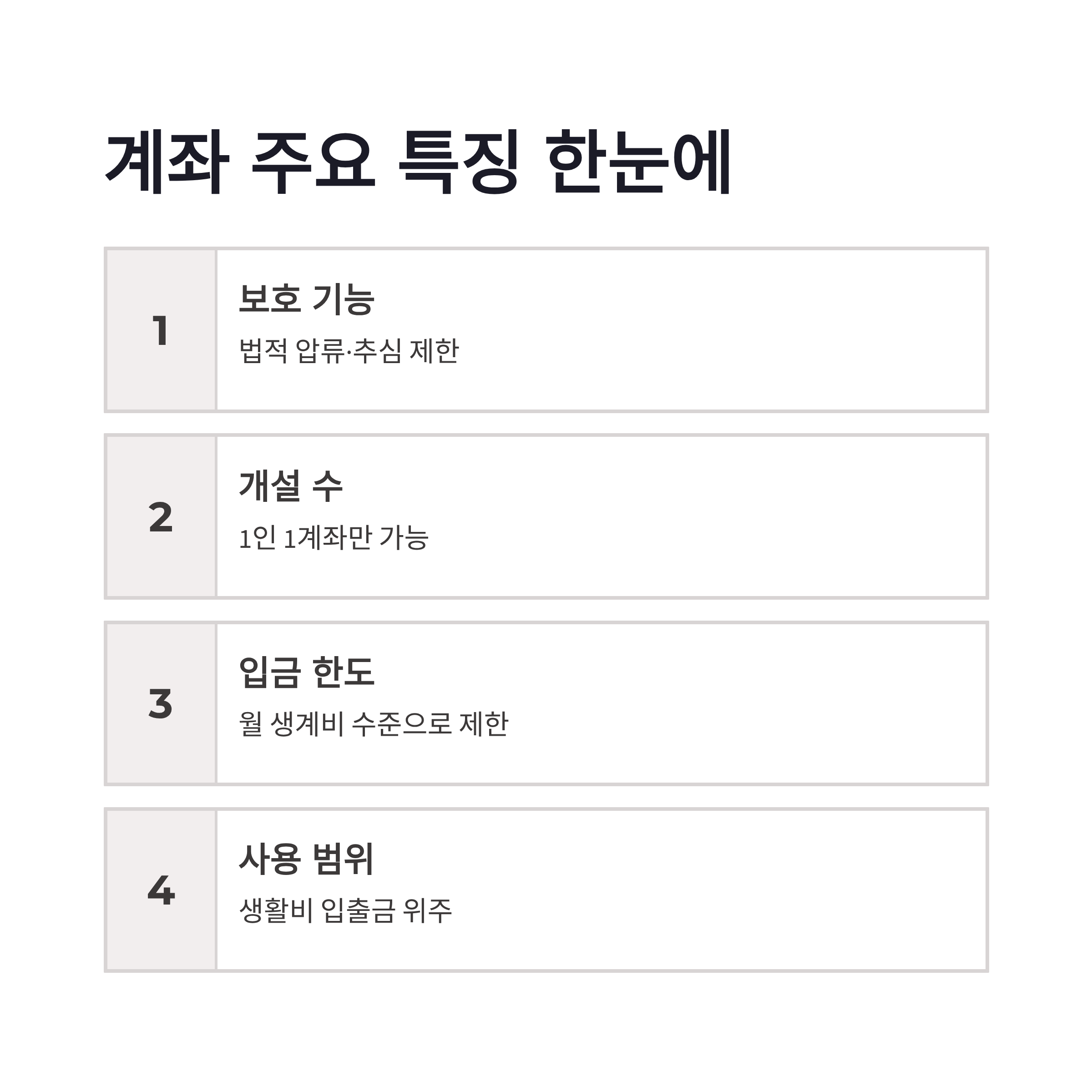 | 보호 기능 | 법적 압류·추심 제한 |