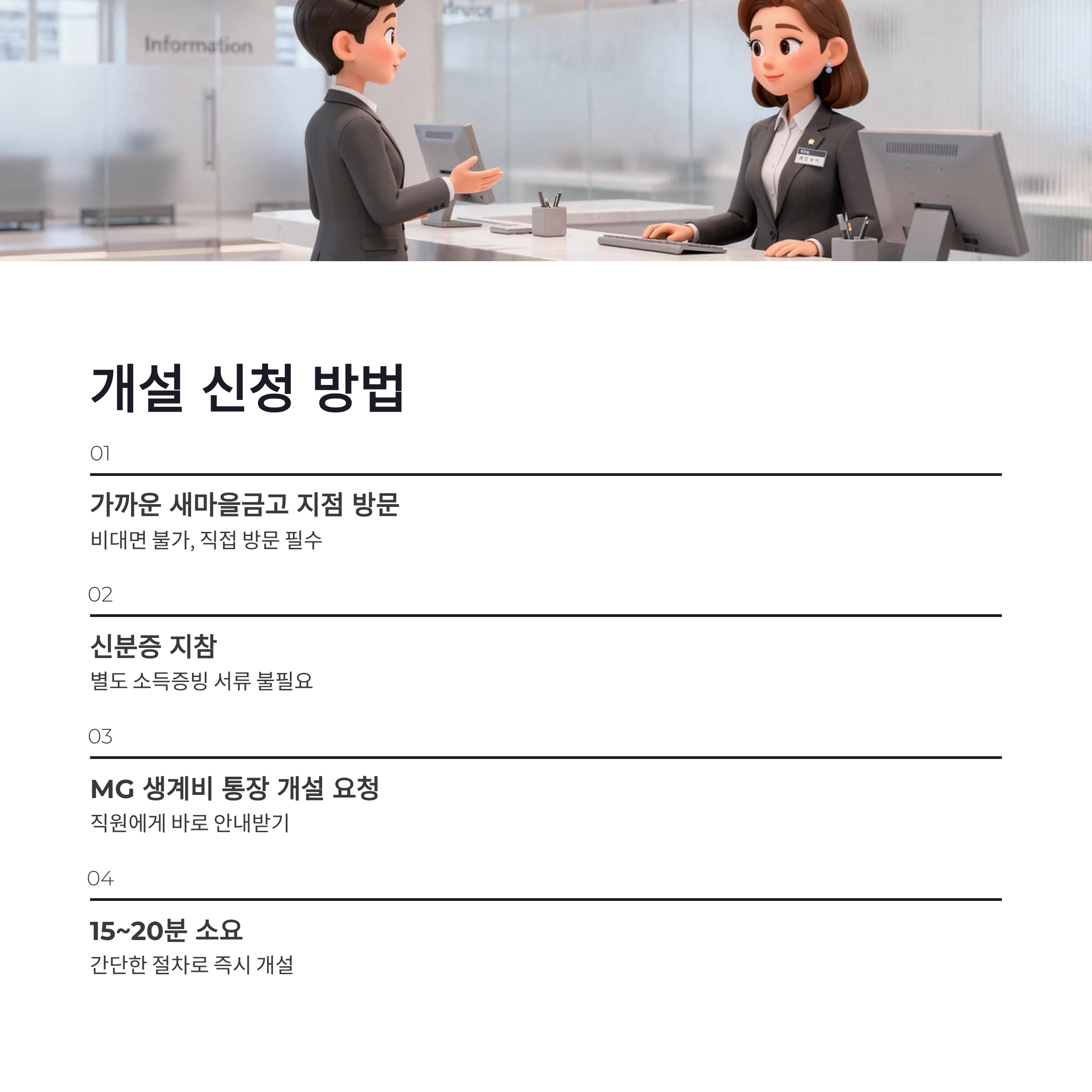 개설은 비대면이 아니라 지점 방문이 기본이었어요. 이 부분은 좀 아쉽긴 했는데, 대신 절차는 단순했습니다. 신분증 하나 들고 가까운 새마을금고 가면 됩니다. 직원분께 “MG 생계비 통장 개설하고 싶어요”라고 말하면 바로 안내해줘요. 별도의 소득 증빙이나 서류 요구는 없었고, 기존에 압류 이력이 있든 없든 예방 목적으로도 가능했습니다. 다만 이미 다른 금융기관에서 압류방지계좌를 쓰고 있다면 중복은 안 됩니다. 이건 공통 규칙이라 어쩔 수 없더라구요. 체감상 소요 시간은 15~20분 정도? 기다림만 없으면 생각보다 금방 끝났습니다.
