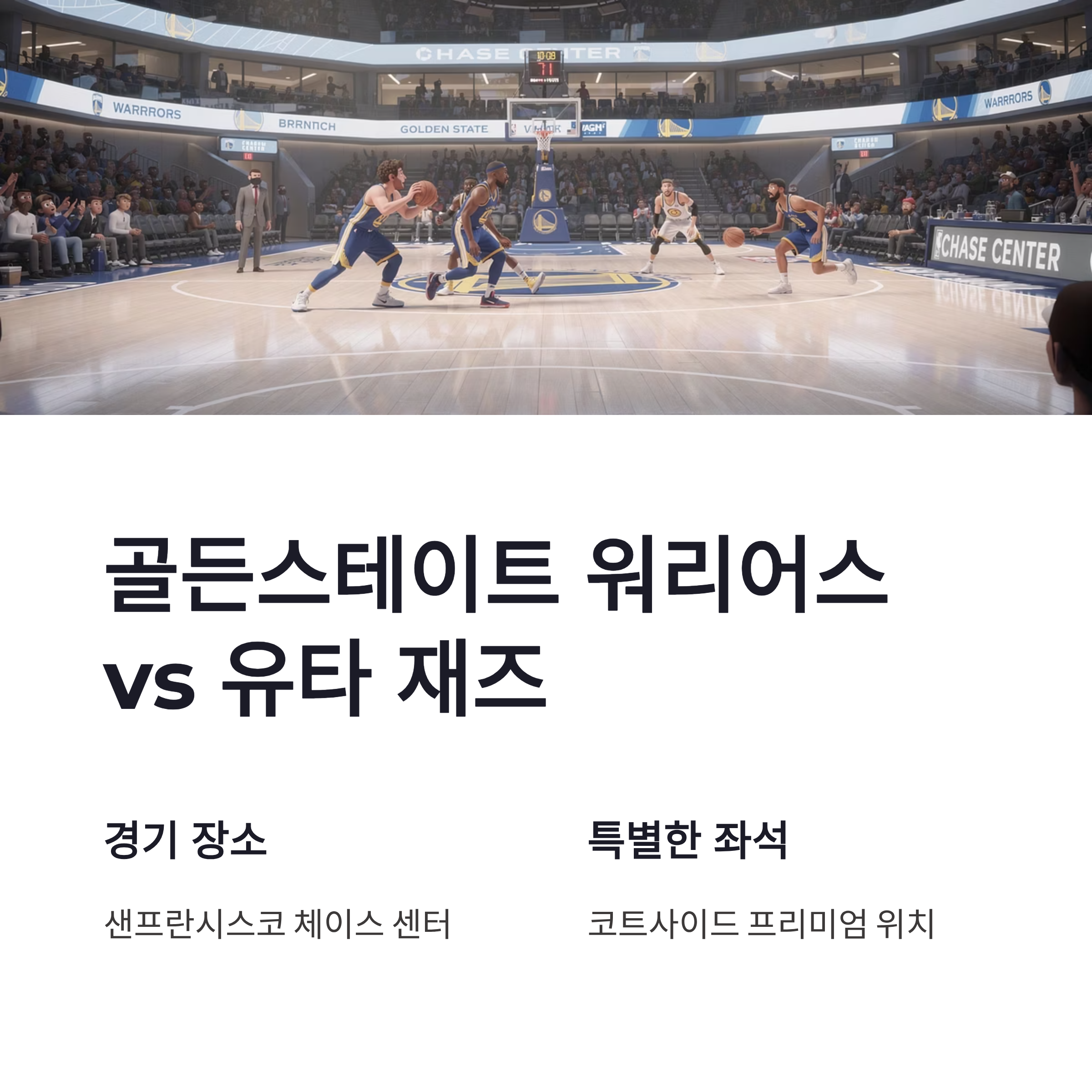 이날 장소는 체이스 센터. NBA 팬이라면 다 아는 곳이죠. 골든스테이트 워리어스와 유타 재즈 경기였는데, 좌석 위치가 진짜 핵심이었어요. 코트사이드는 선수 표정, 감독 제스처까지 다 보이거든요. 저기 앉으면 집중 안 할 수가 없음… 부럽 ㅠㅠ