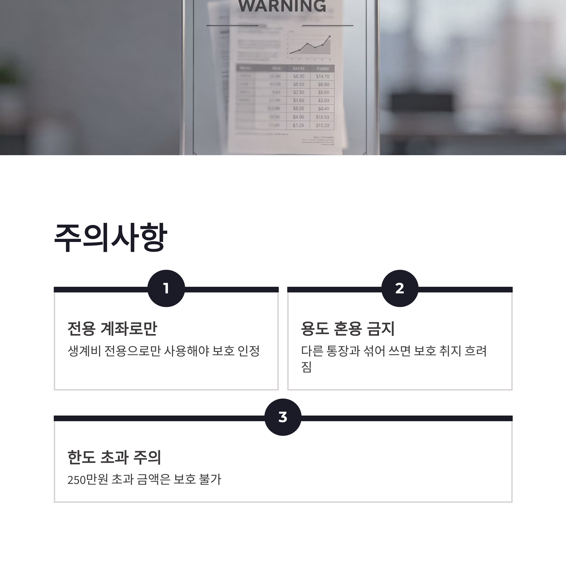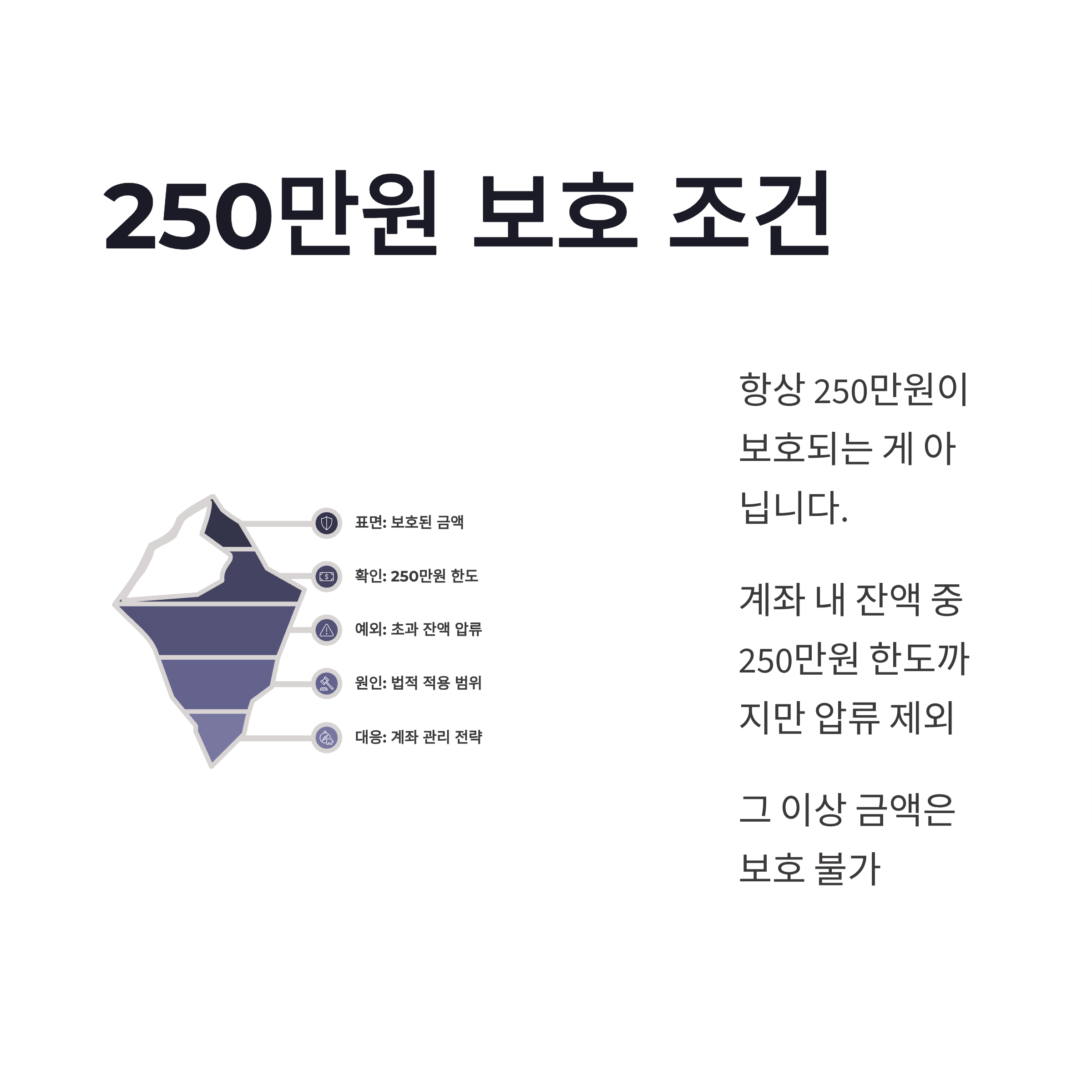 제일 많이 헷갈리는 게 바로 이 250만원 보호 조건이었어요. 이게 “항상 250만원이 보호된다”는 개념은 아닙니다. 계좌 내 잔액 중 250만원 한도까지만 압류 제외되는 구조예요. 그 이상 금액은 상황에 따라 보호받지 못할 수도 있구요.