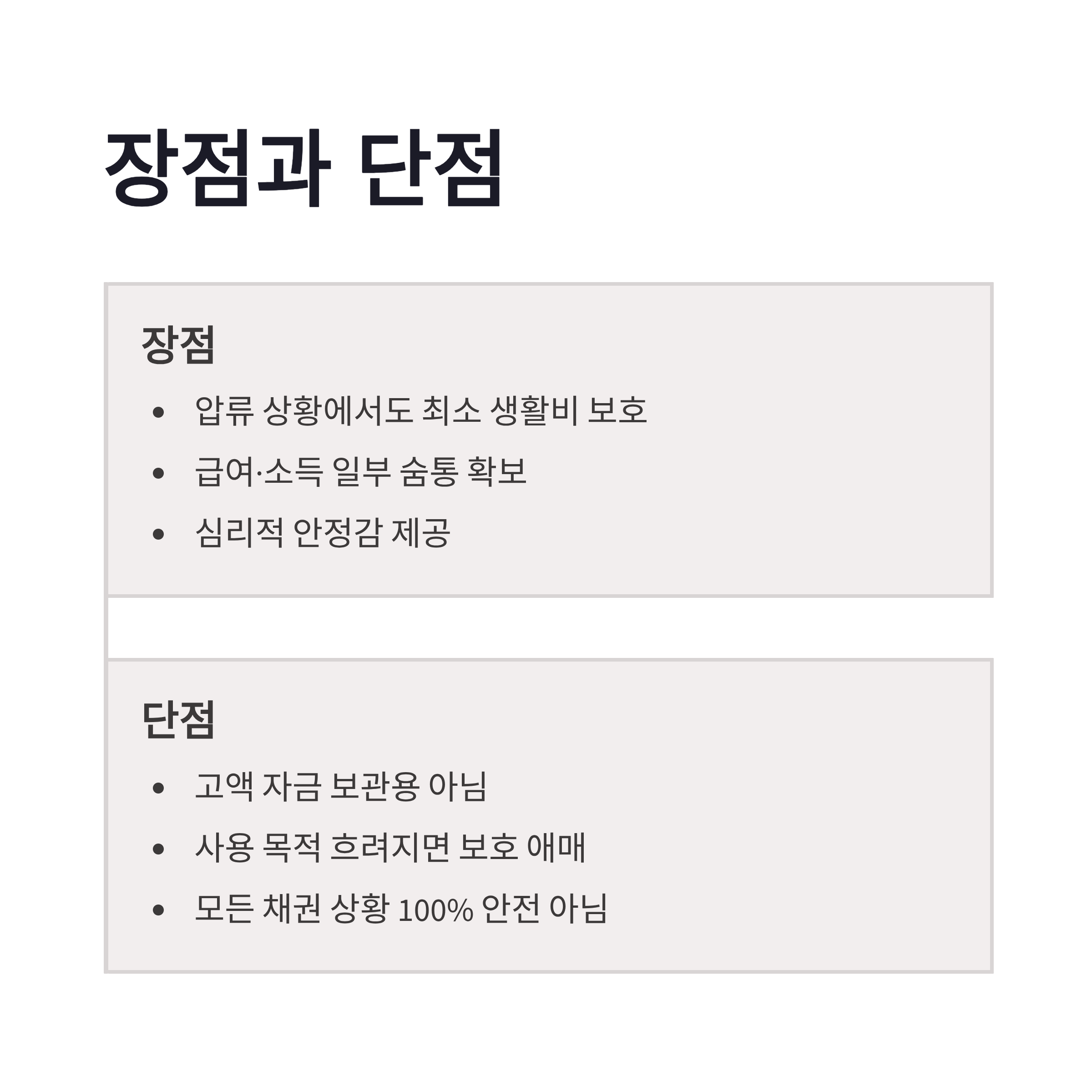 * 고액 자금 보관용은 절대 아님 * 사용 목적이 흐려지면 보호 인정이 애매해질 수 있음 * 모든 채권 상황에서 100% 안전한 건 아님