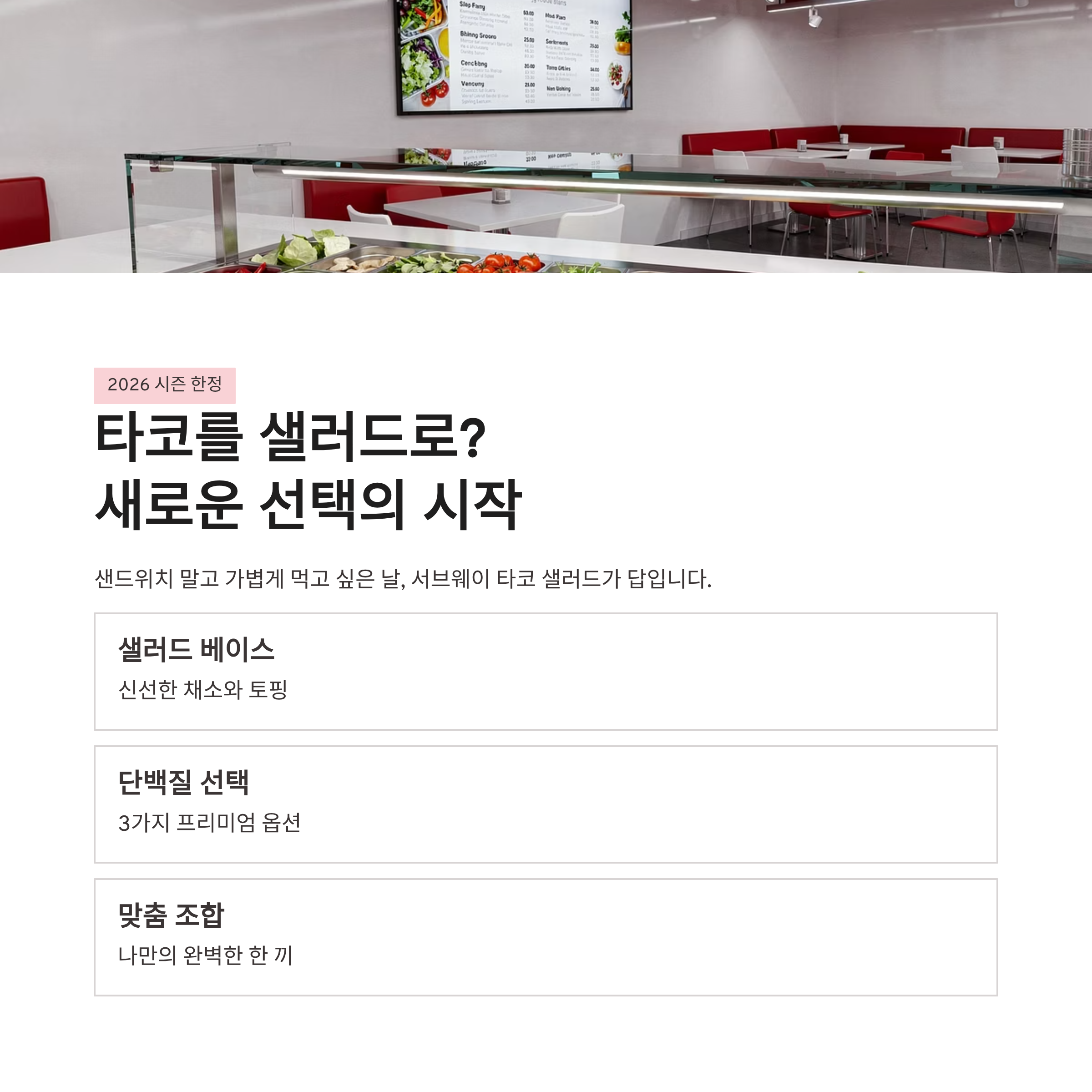 #서브웨이타코샐러드 #서브웨이샐러드 #타코샐러드가격 #서브웨이신메뉴 #풀드포크샐러드 #로티세리치킨샐러드 #스파이시쉬림프 #서브웨이다이어트 #고단백메뉴 #샐러드추천 #서브웨이메뉴 #시즌한정메뉴 #2026신메뉴 #헬시푸드 #외식추천