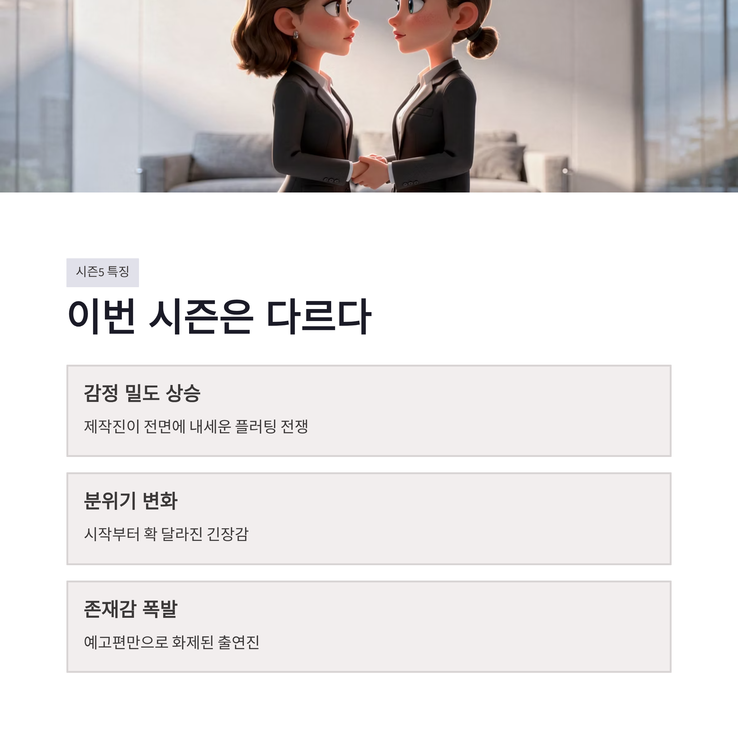 2026년 1월 6일, 솔로지옥 시즌5 예고편이 공개되자마자 타임라인이 난리였죠. 저도 그냥 스쳐 보려고 틀었다가 끝까지 다 봤구요 ㅋㅋ 이번 솔로지옥 시즌5는 시작부터 분위기가 좀 달라요. 제작진이 아예 “선 넘는 플러팅 전쟁”을 전면에 내세운 만큼, 감정 밀도부터가 확 올라간 느낌이더라구요. 특히 솔로지옥 시즌5 출연진 중 김민지, 김고은, 최미나수 이 세 명은 예고편만으로도 존재감이 확 튀었습니다.