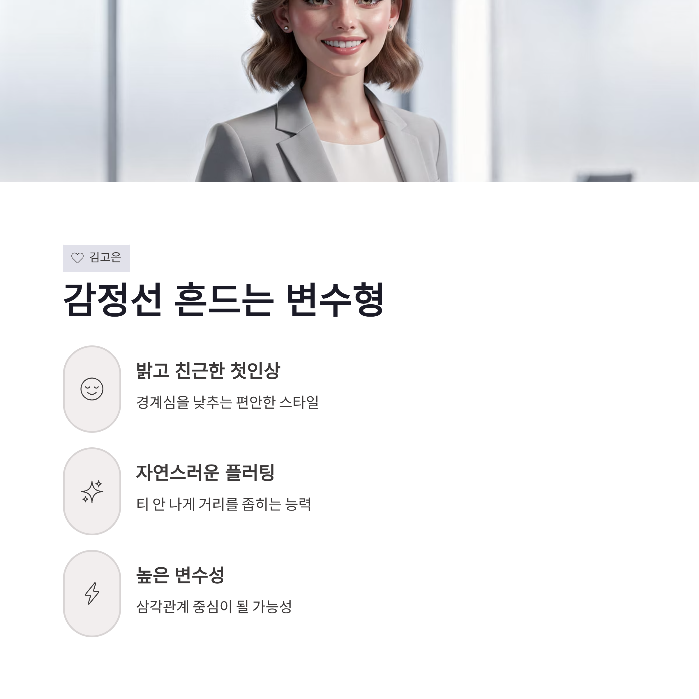 | 첫인상 | 편안함 | 경계심 낮추는 스타일 |