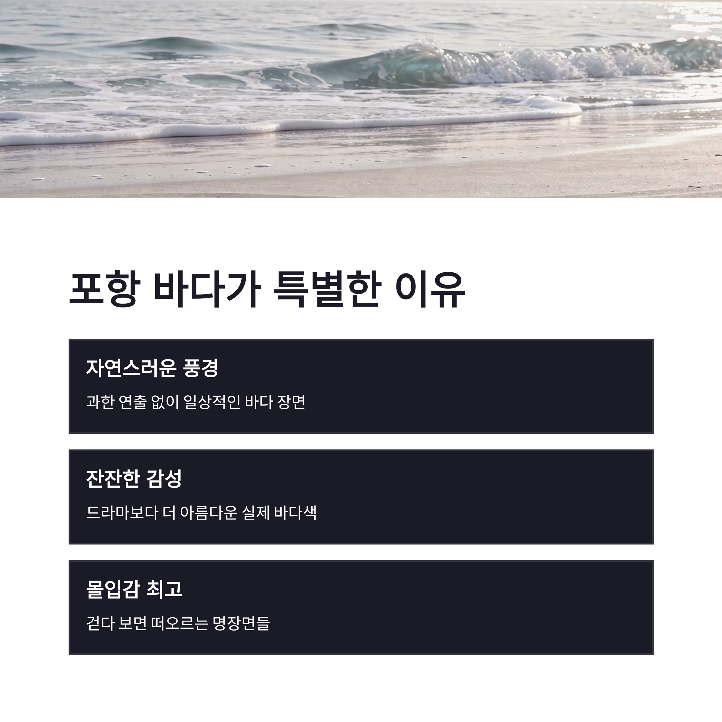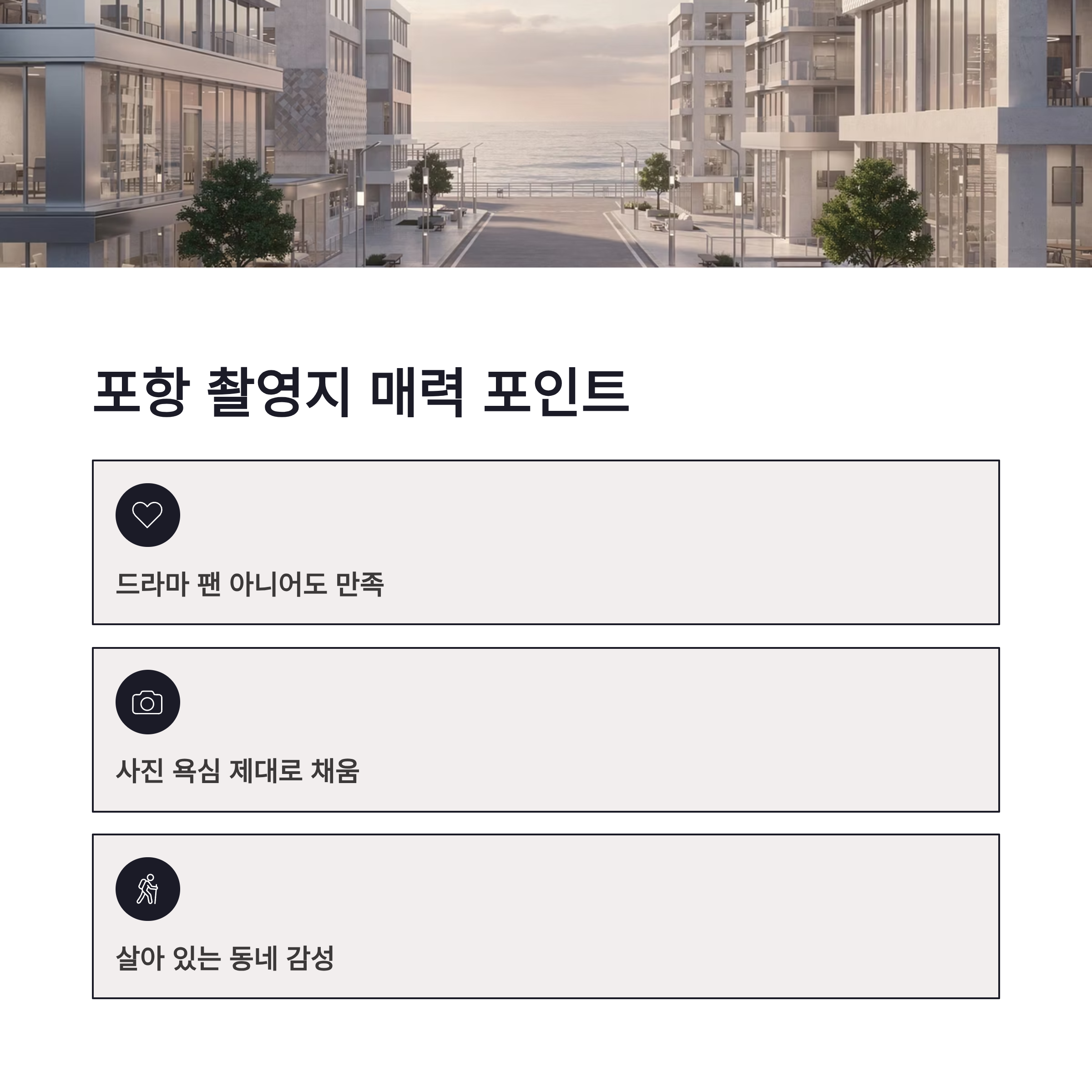 2026년 들어 포항이 드라마 촬영지로 다시 뜨는 분위기예요. 과한 세트 없이 자연광, 실제 공간 위주라서 제작진들도 선호한다고 하더라구요. 장점은 접근성 좋고, 사진이 잘 나온다는 점! 단점이라면 주말엔 살짝 붐빈다는 거 ㅠㅠ 그래도 스프링피버 촬영지 포항은 계절 타지 않아서 겨울에도 충분히 감성 유지됩니다.