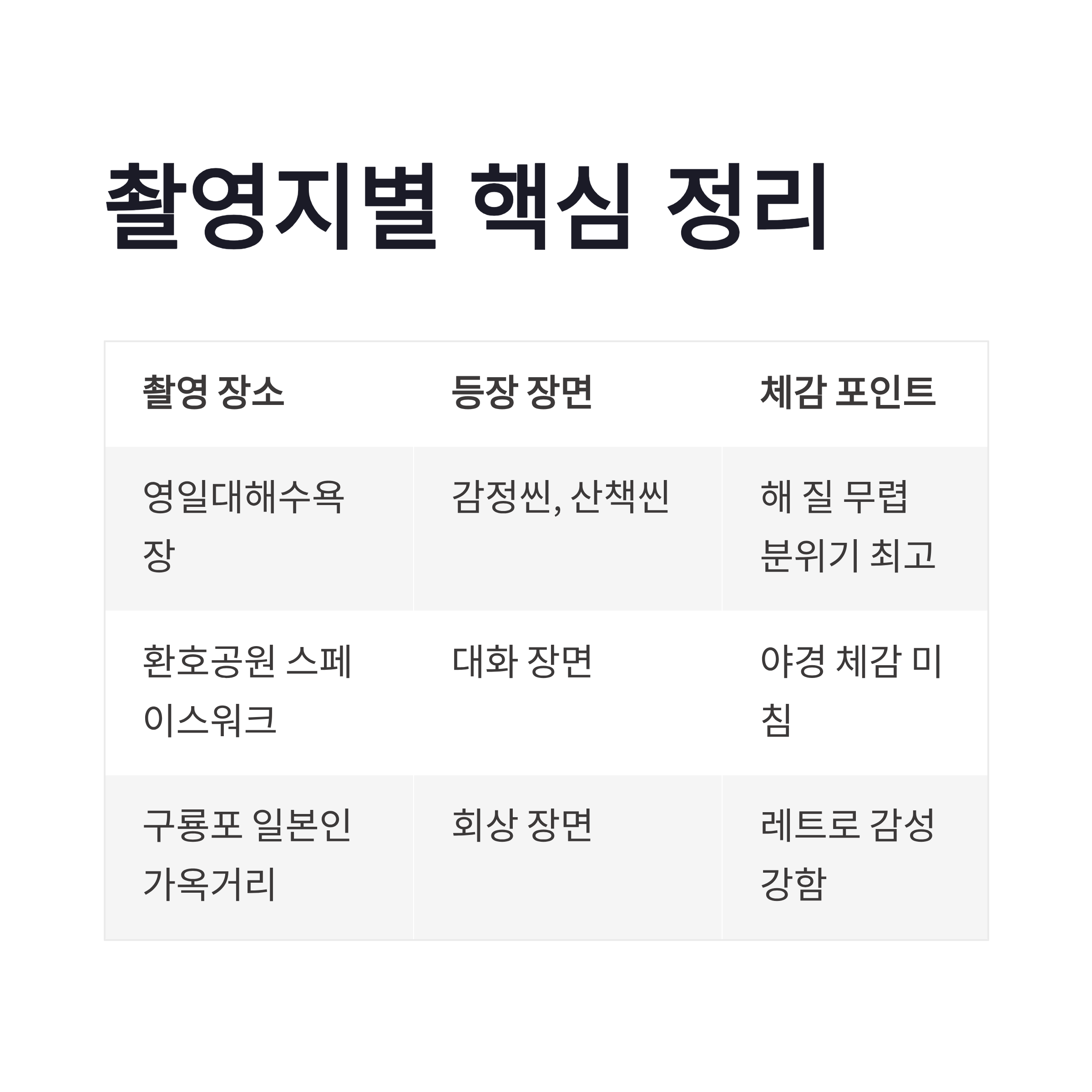| 촬영 장소 | 등장 장면 | 체감 포인트 |