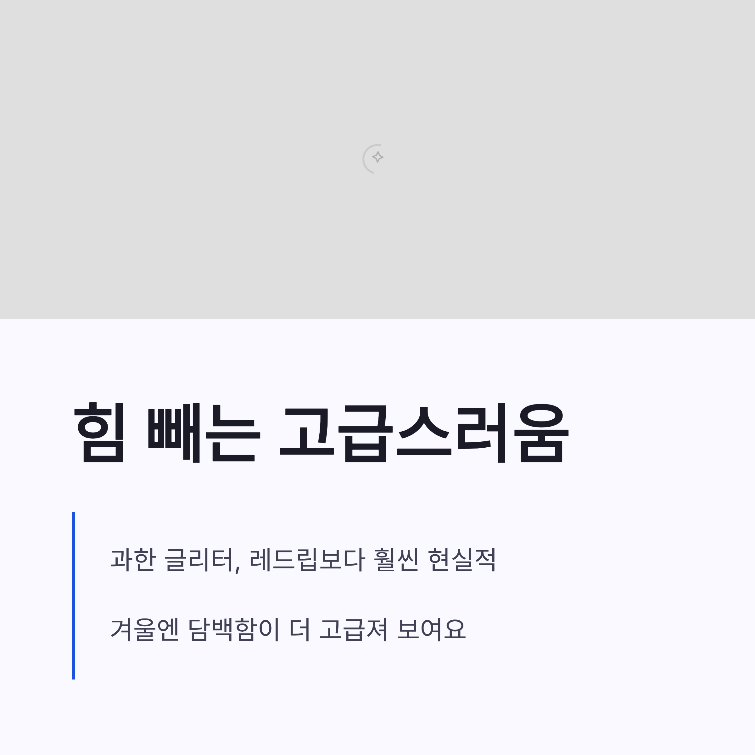 그래도 과한 글리터, 레드립보다 훨씬 현실적인 선택이라 요즘 더 끌렸어요. 겨울엔 이런 담백함이 더 고급져 보이더라구요.