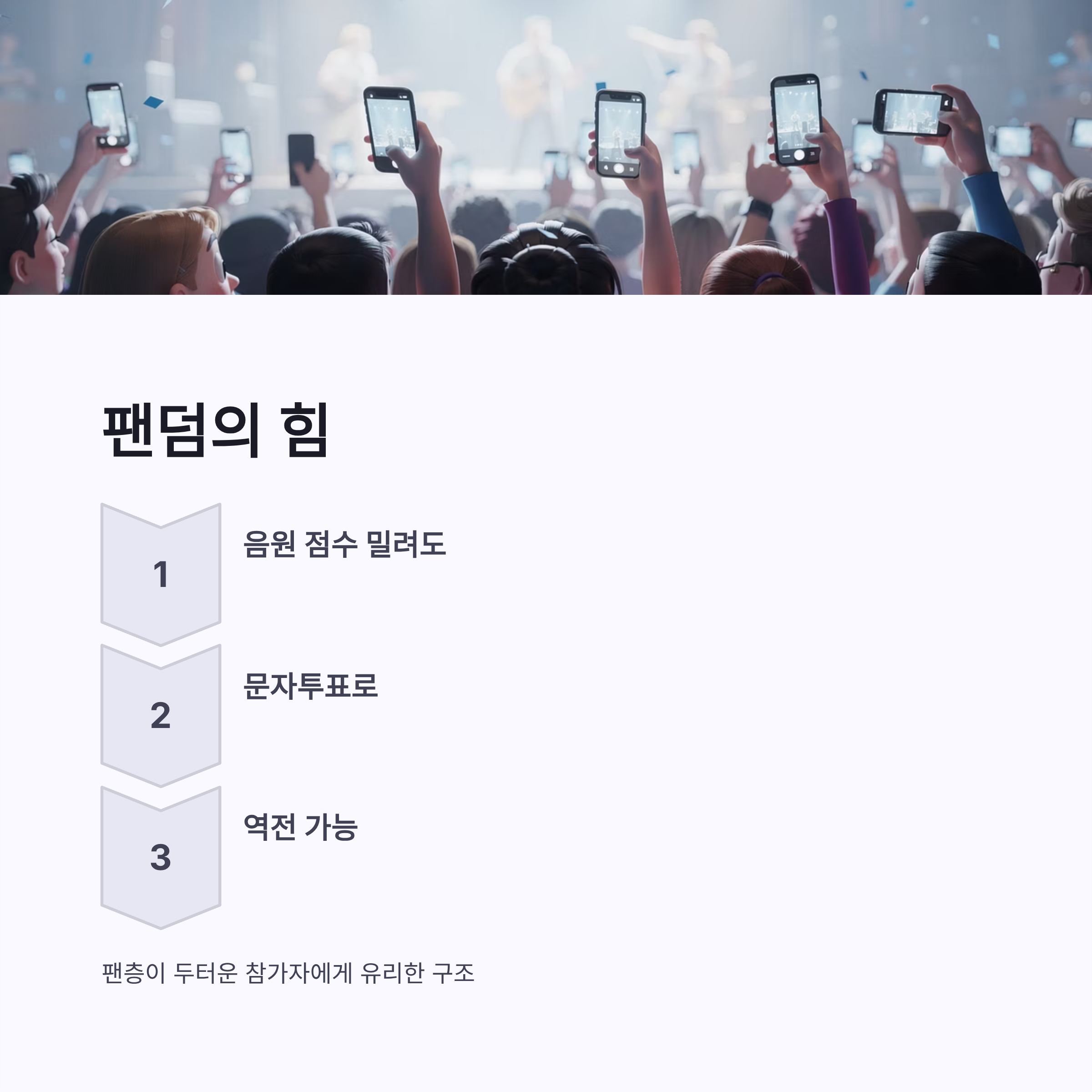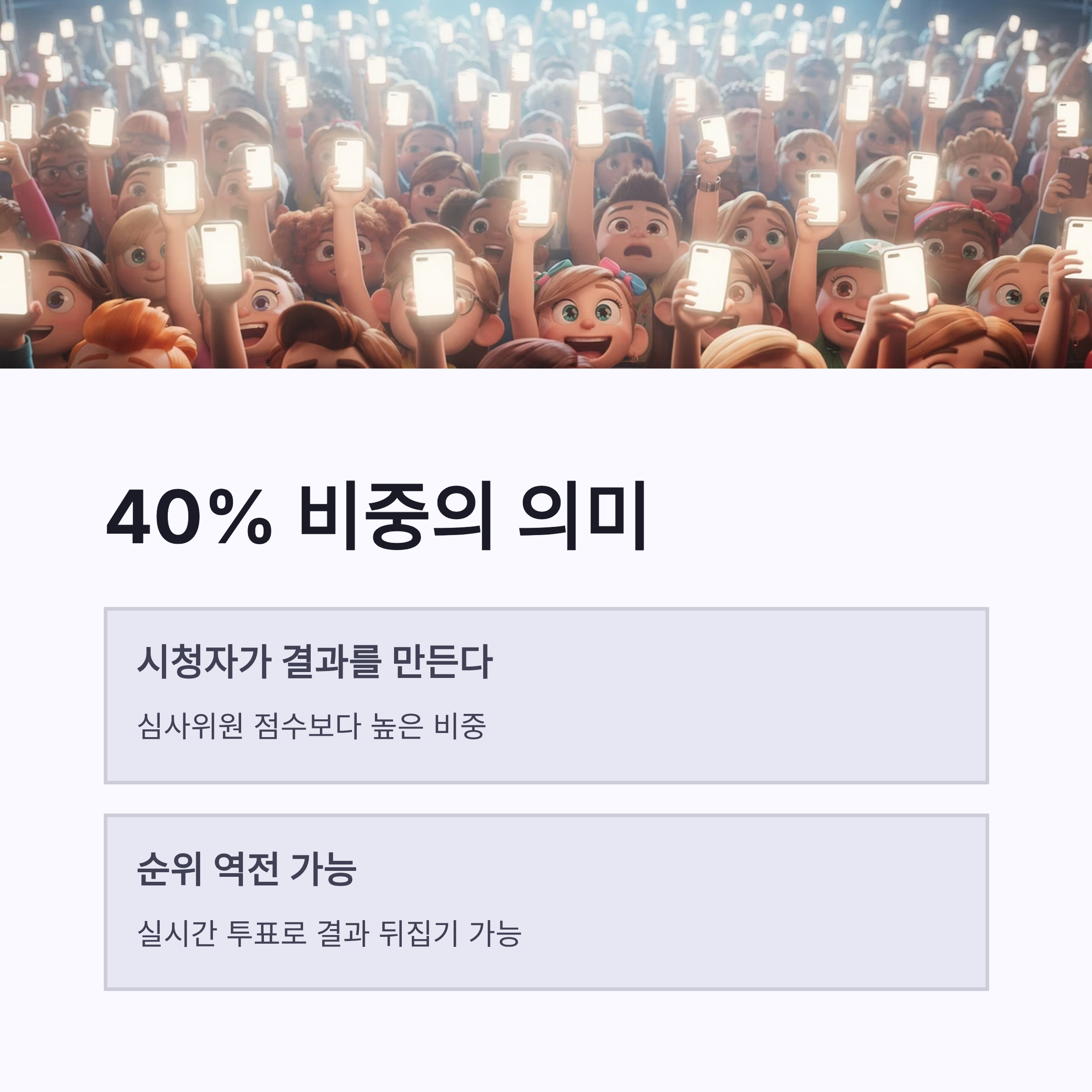 이번 시즌은 특히 팬덤 영향력이 확실히 느껴졌어요. 실시간 투표 비중이 40%라서, 음원 점수나 심사위원 점수에서 조금 밀려도 문자투표로 충분히 뒤집을 수 있는 구조였거든요. 장점이라면 시청자가 적극적으로 참여한다는 점, 단점이라면 팬층이 두터운 참가자가 조금 더 유리해질 수 있다는 점 정도? 그래도 라이브 무대 보고 바로 투표하는 이 긴장감은 진짜… 말로 설명 안 돼요. 손에 땀나더라구요 ㅎㅎ 요즘 오디션 트렌드 자체가 ‘시청자 개입 강화’ 쪽이라, 싱어게인4 결승전 문자투표 방식도 그 흐름을 제대로 탄 느낌이었어요.