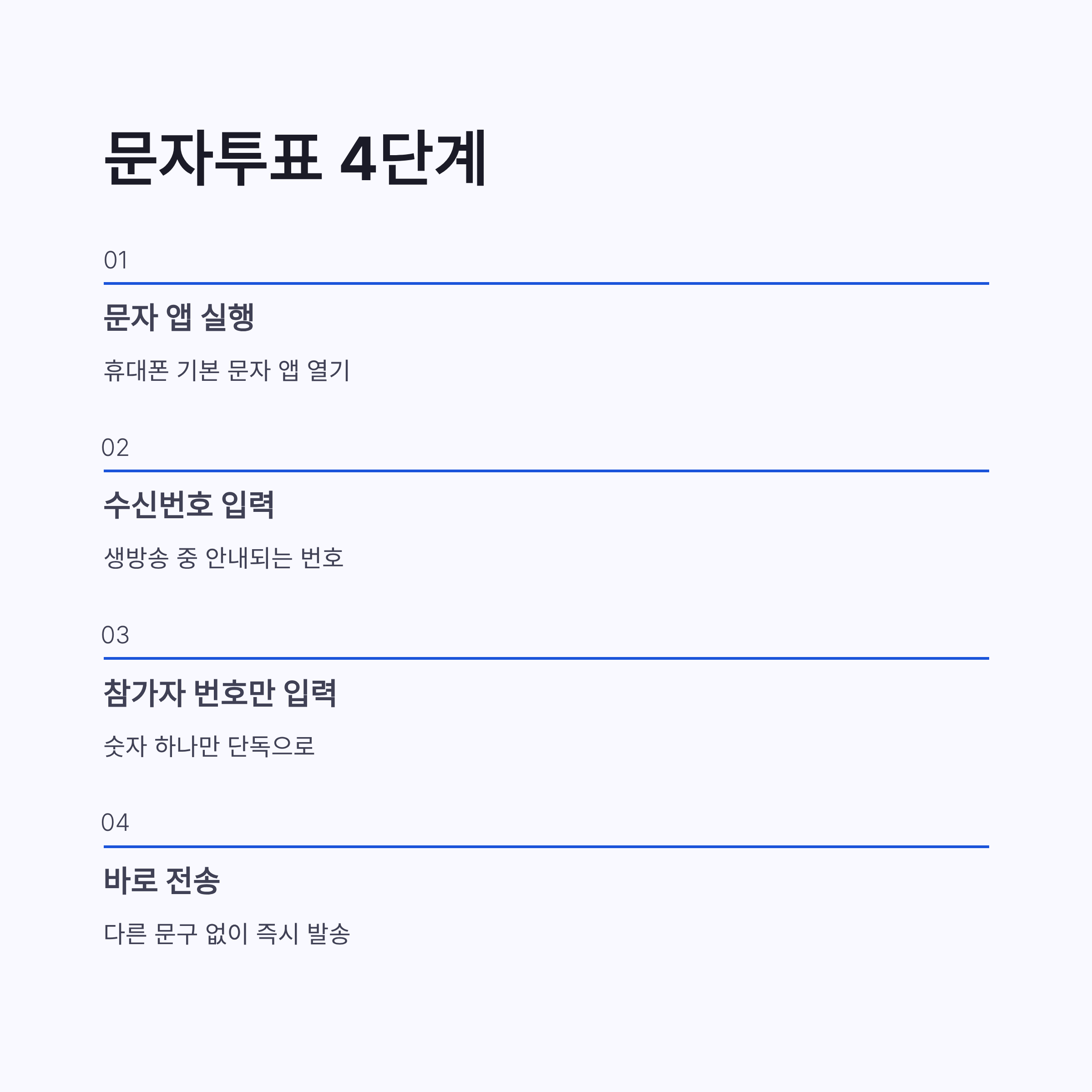 | 단계 | 내용 | | -- | ------------------- | | 1 | 휴대폰 문자 앱 실행 | | 2 | 생방송 중 안내되는 수신번호 입력 | | 3 | 참가자 번호만 단독으로 입력 | | 4 | 바로 전송 |