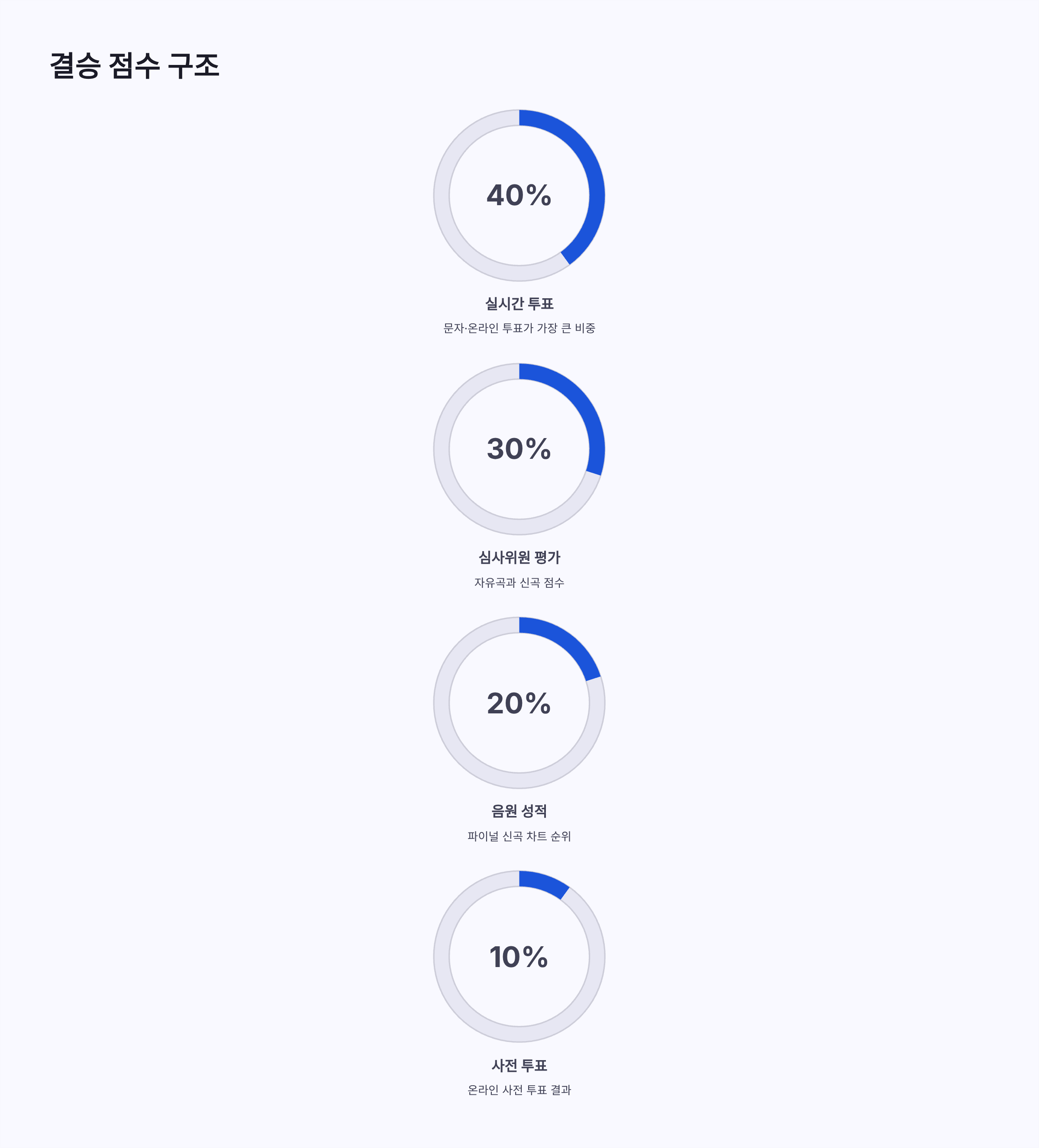 싱어게인4 결승전은 진짜 말 그대로 시청자가 결과를 만드는 무대였구요. 그냥 노래 잘한다고 끝나는 구조가 아니더라구요. 심사위원 점수만으로 결정되던 예전 오디션이랑은 느낌이 완전 달랐어요. 결승 점수는 총 4가지로 나뉘는데, 심사위원 자유곡+신곡 평가가 30%, 파이널 신곡 음원 성적이 20%, 온라인 사전 투표가 10%, 그리고 결정타가 바로 실시간 문자·온라인 투표 40%예요. 솔직히 말하면… 이 비율 보고 살짝 소름 돋았어요 ㅎㅎ 내가 보낸 문자 한 통이 순위를 뒤집을 수도 있겠구나 싶어서요. 그래서 싱어게인4 결승전 문자투표는 그냥 참여용이 아니라 진짜 결과에 직결되는 요소였어요.
