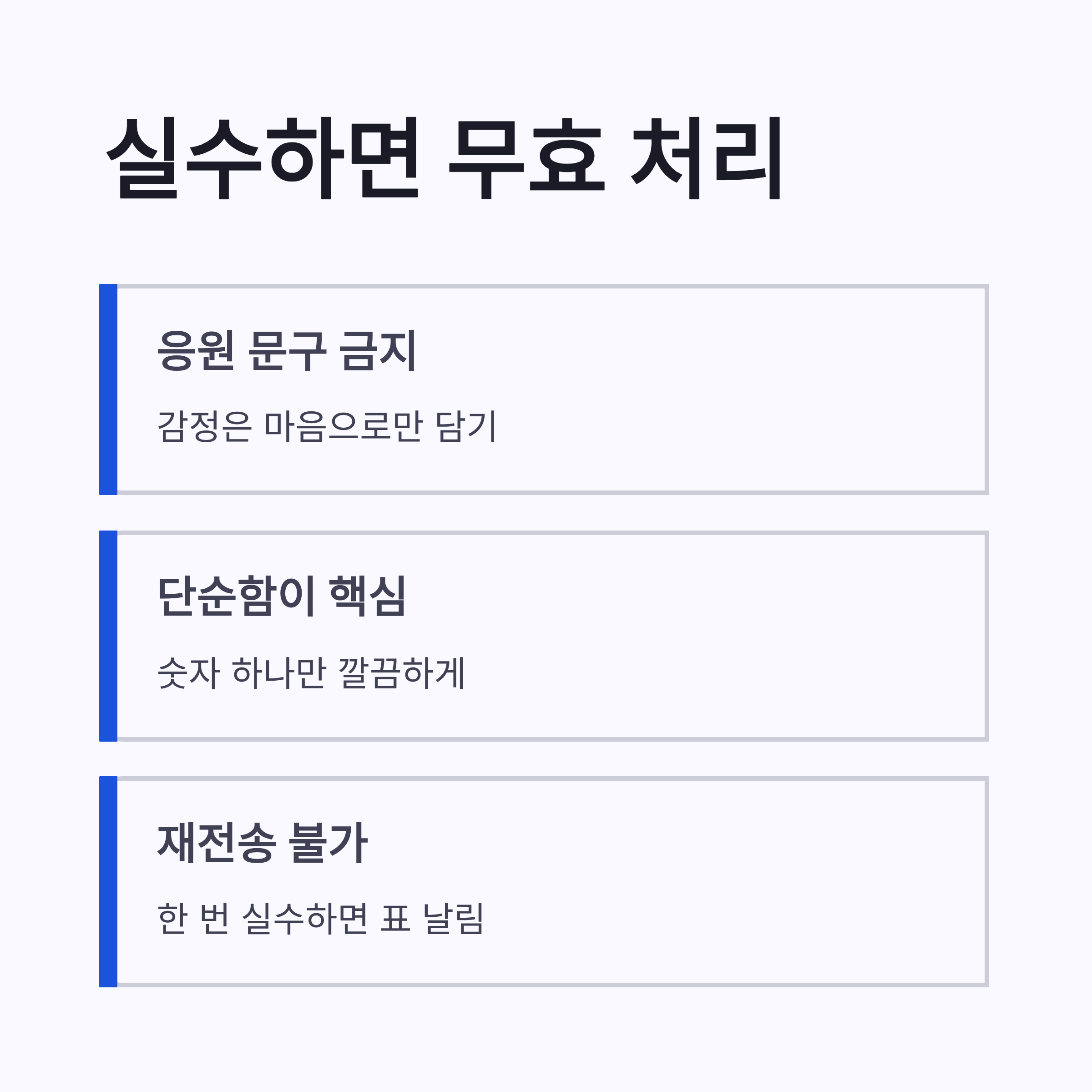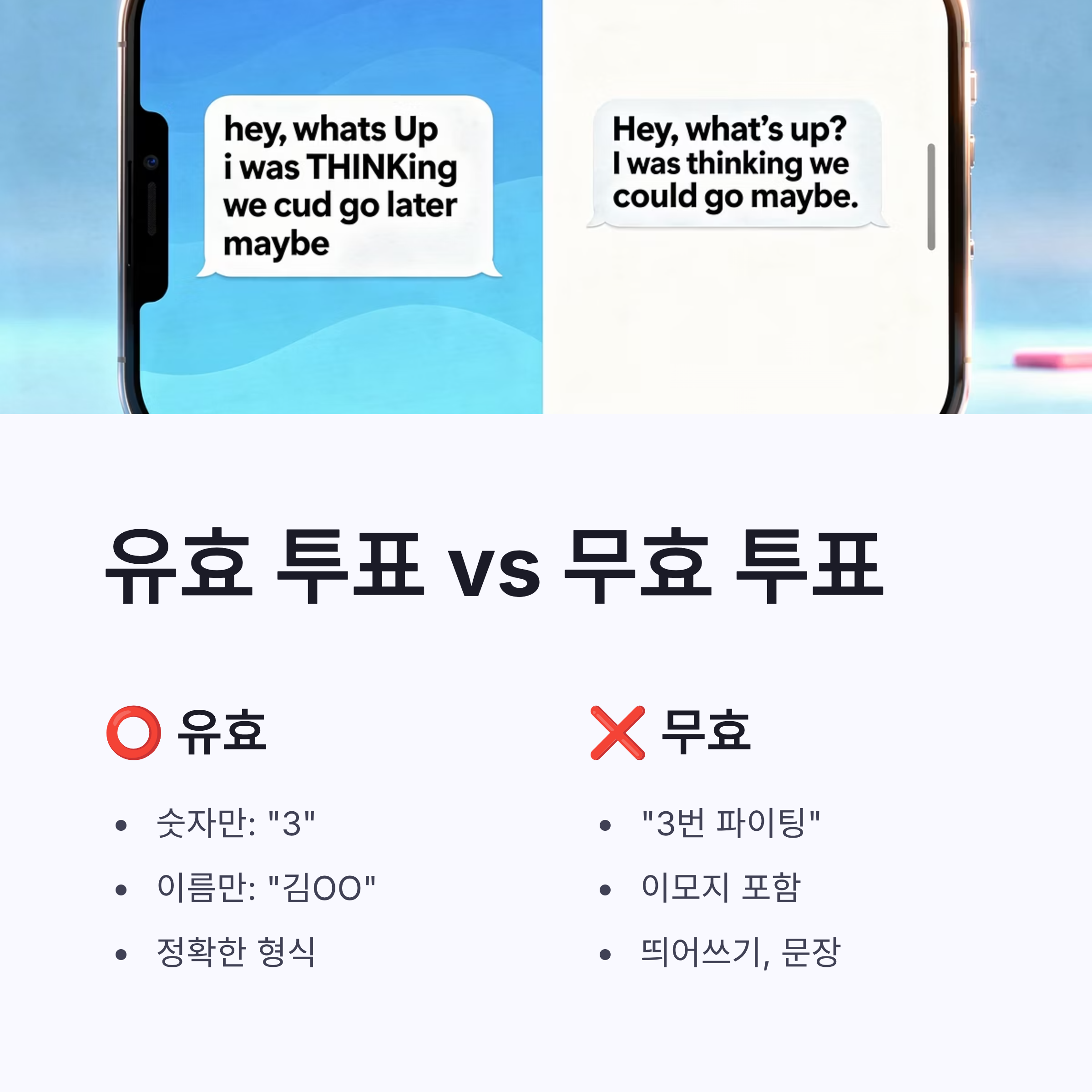 * “3번 파이팅”, “김OO 응원해요” → ❌ * 이모지, 띄어쓰기, 문장 → ❌ * 숫자 하나만 또는 이름만 정확히 → ⭕