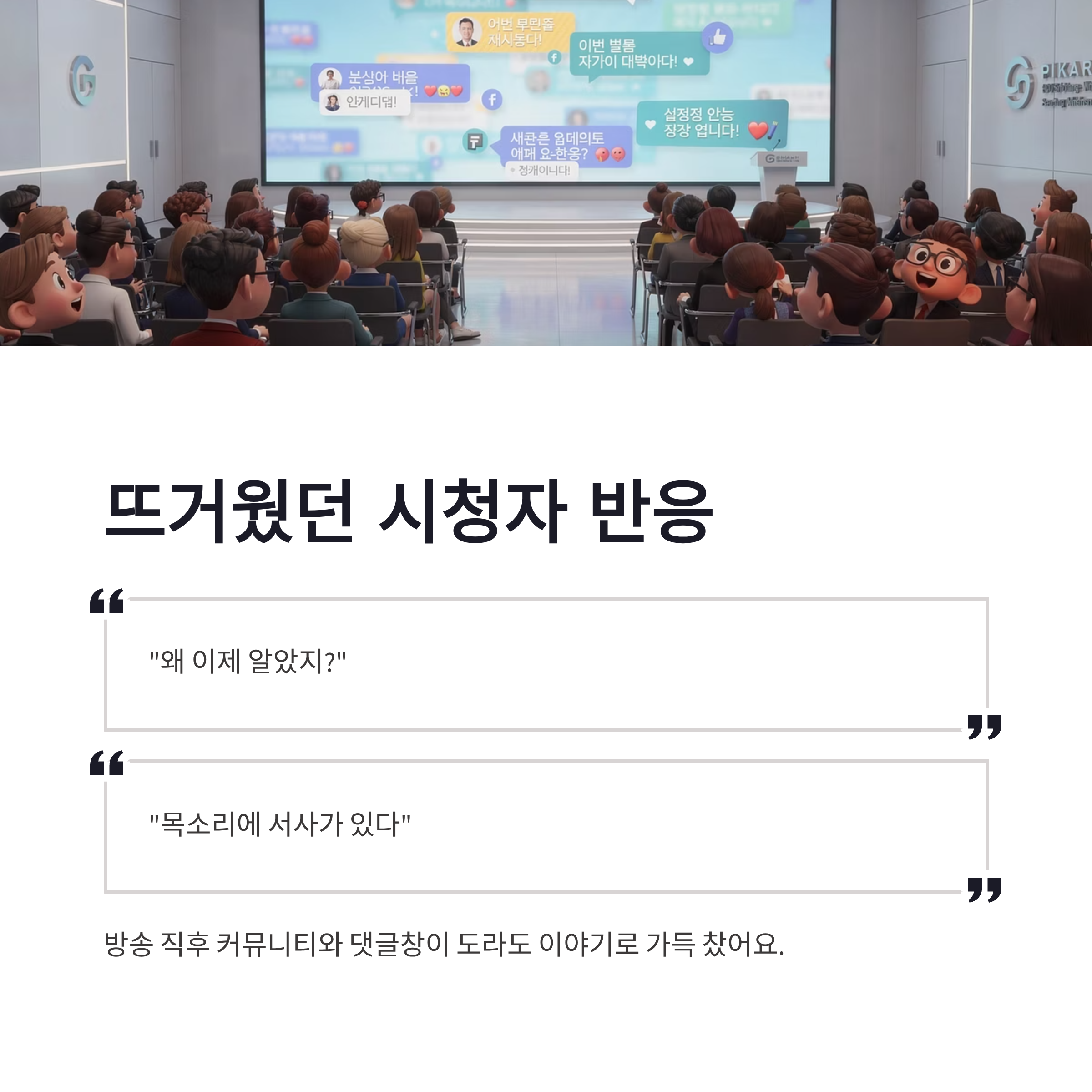 방송 나간 직후 반응도 진짜 뜨거웠어요. 커뮤니티며 댓글창에 싱어게인4 도라도 이야기만 잔뜩이었거든요. “왜 이제 알았지?”, “목소리에 서사가 있다” 이런 말들 많이 보셨을 거예요. 실제로 심사위원 평도 비슷했어요. 기술적인 부분보다 감정 전달력, 노래를 이해하는 힘을 높게 봤다는 느낌이었구요.