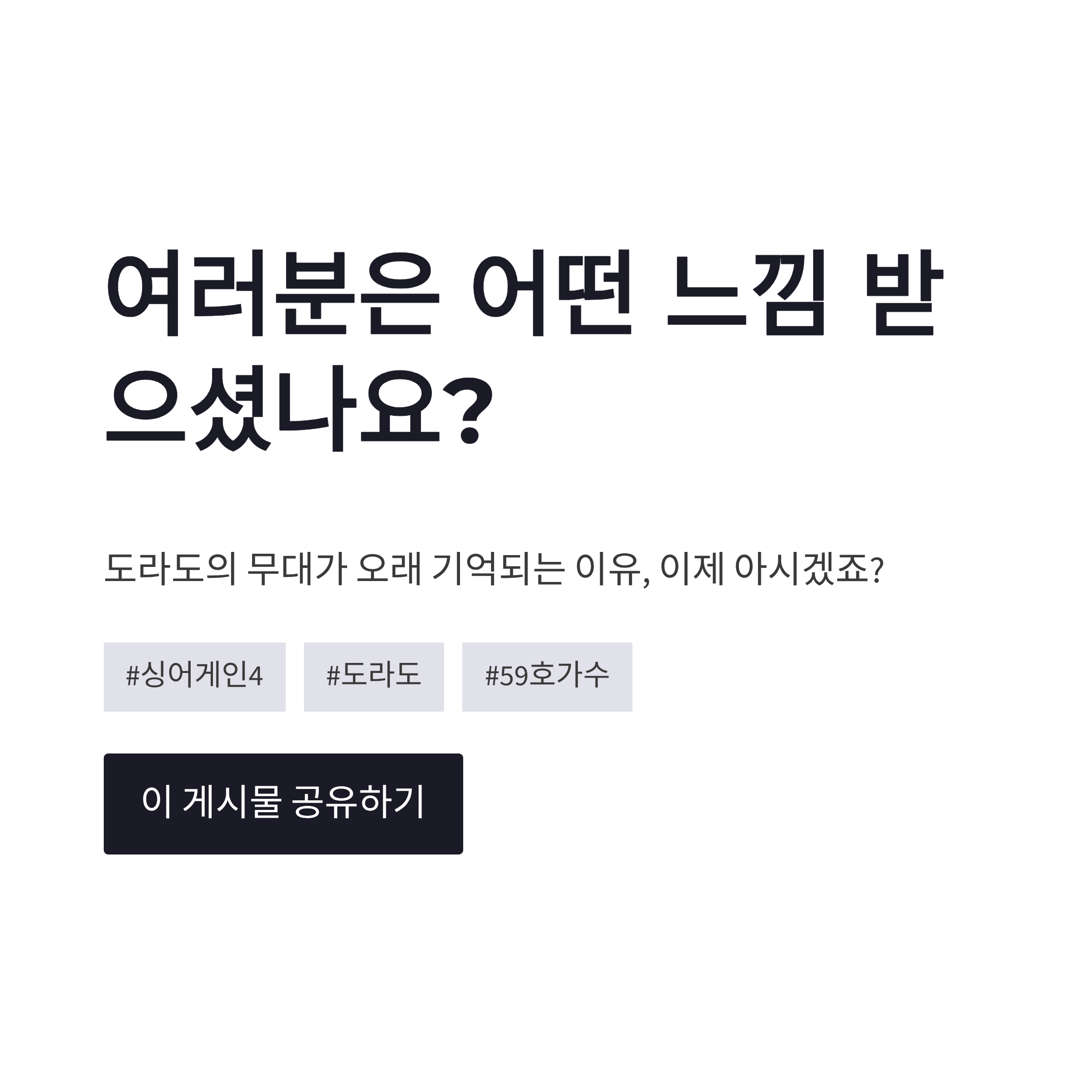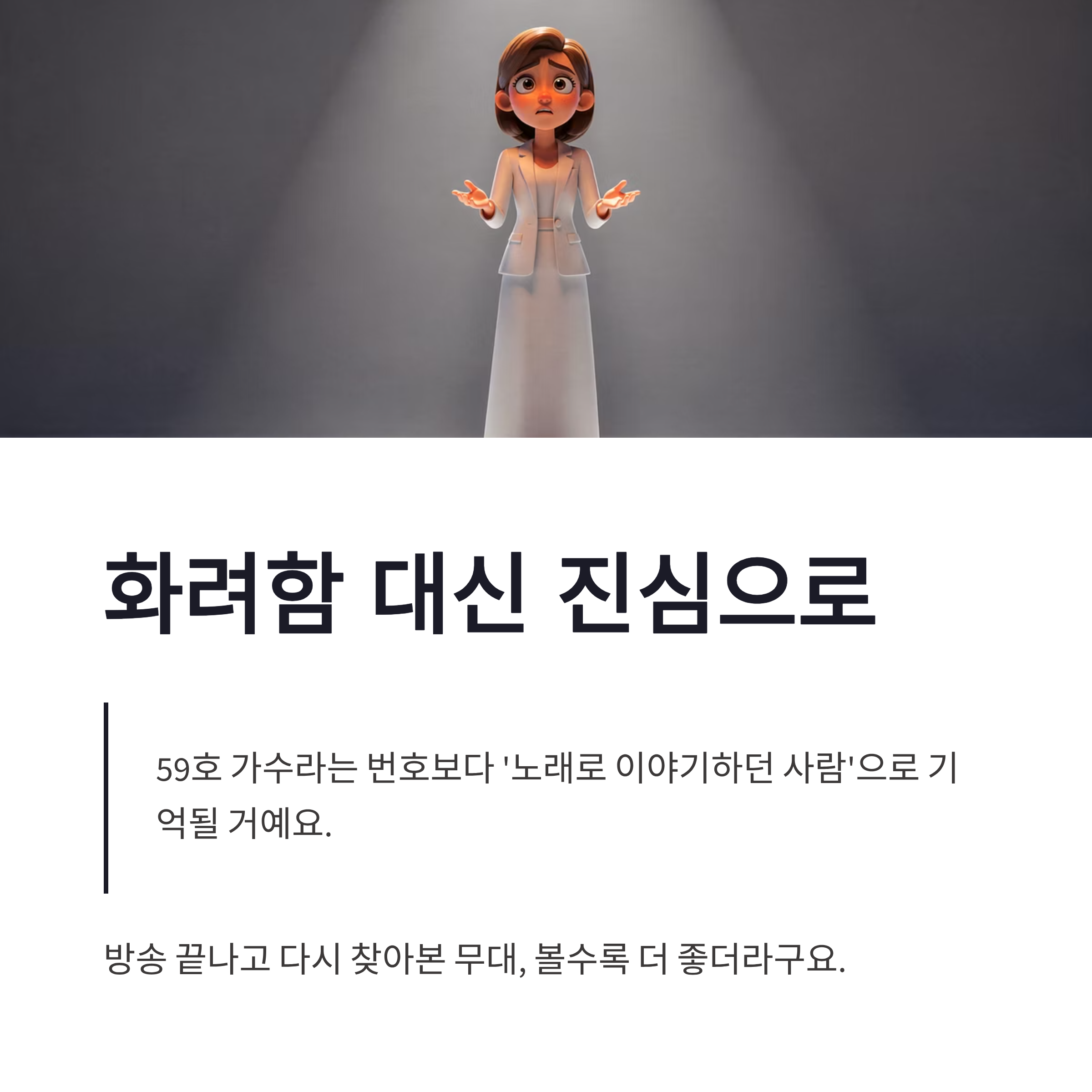 정리해보면 싱어게인4 도라도는 화려함 대신 진심으로 승부한 가수였어요. 59호 가수라는 번호보다 ‘노래로 이야기하던 사람’으로 기억될 것 같구요. 저도 방송 끝나고 다시 무대 찾아봤는데, 볼수록 더 좋더라구요 ㅎㅎ 이런 가수가 있어서 싱어게인4를 챙겨보게 되는 거겠죠? 여러분은 도라도 무대 보면서 어떤 느낌 받으셨나요.