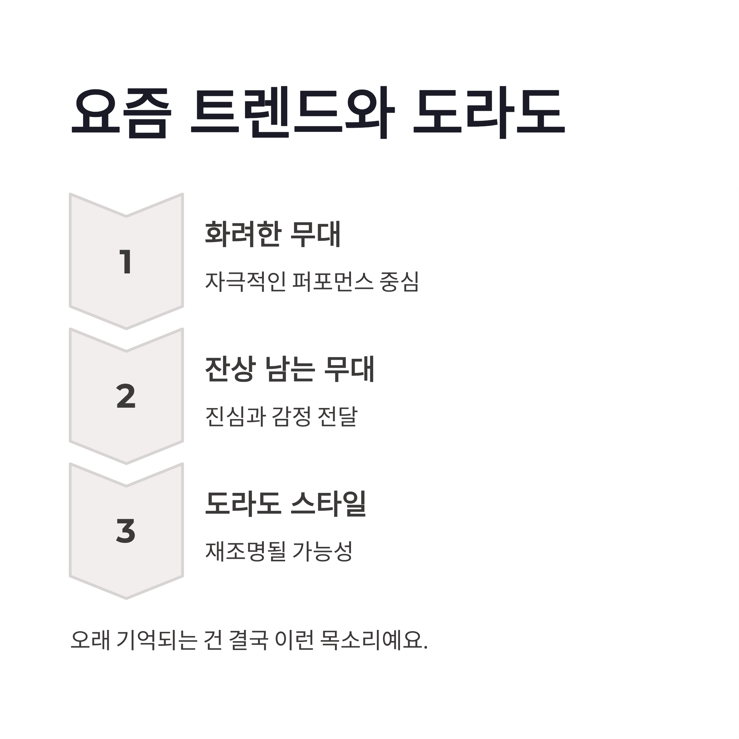 요즘 오디션 프로그램 보면 화려함이 먼저 오는 경우가 많잖아요. 근데 싱어게인4 도라도는 정반대였어요. 장점부터 말하면, 노래를 자기 언어처럼 소화한다는 점. 국적을 떠나 음악으로 소통한다는 게 이런 거구나 싶었구요. 반면 단점이라면… 자극적인 무대가 아니라서 한 번에 확 꽂히지 않는 분들도 있었을 것 같아요. 그래도 오래 남는 건 이런 목소기더라구요. 요즘 트렌드가 ‘잔상 남는 무대’ 쪽으로 가는 느낌이라, 도라도 스타일이 더 재조명될 가능성도 크다고 봤어요.
