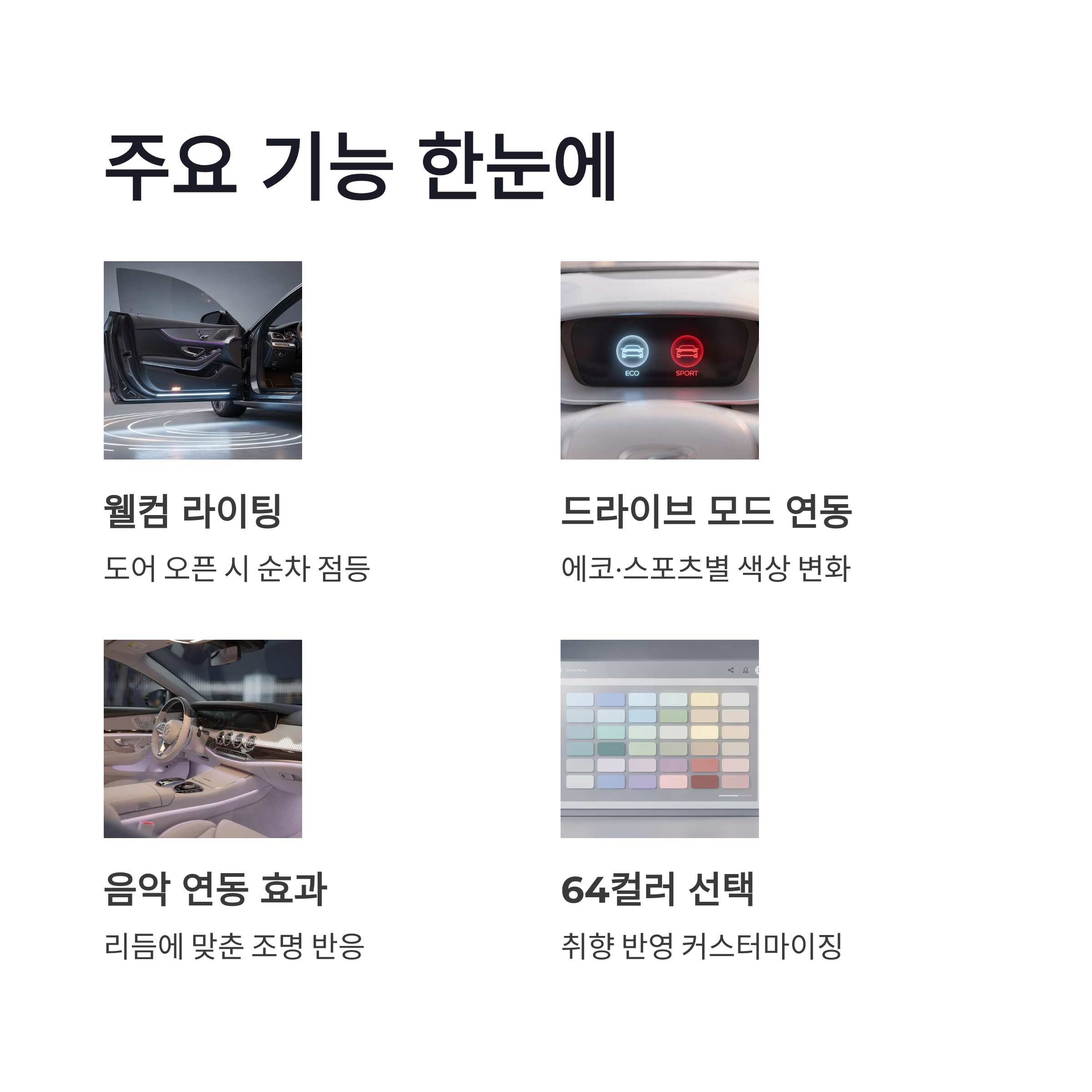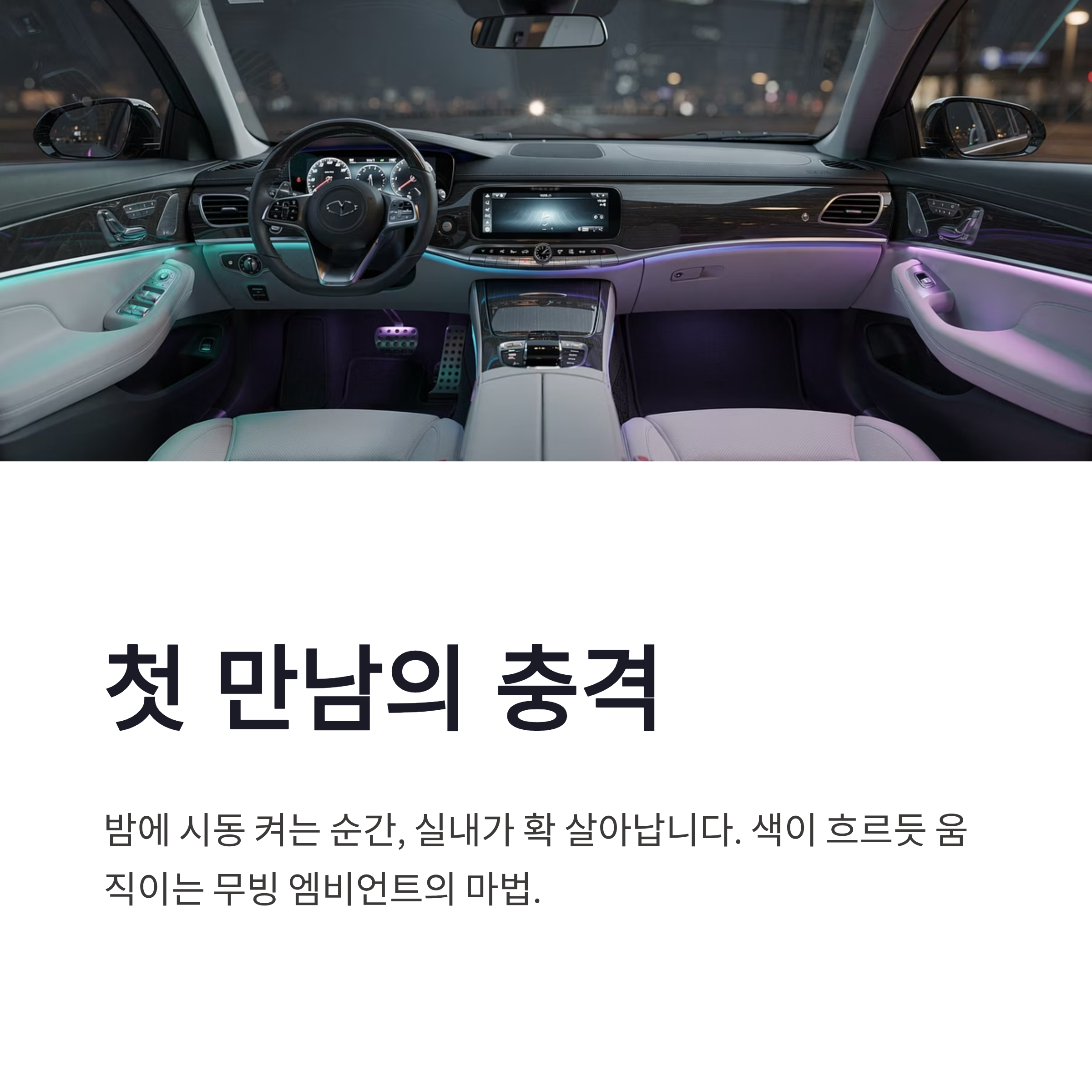색상이 고정이 아니라 주행 모드, 웰컴 시퀀스, 도어 개방 등에 맞춰 패턴이 달라집니다. 운전자가 차에 타는 순간부터 감정선을 건드리는 느낌… 이게 은근 큽니다.